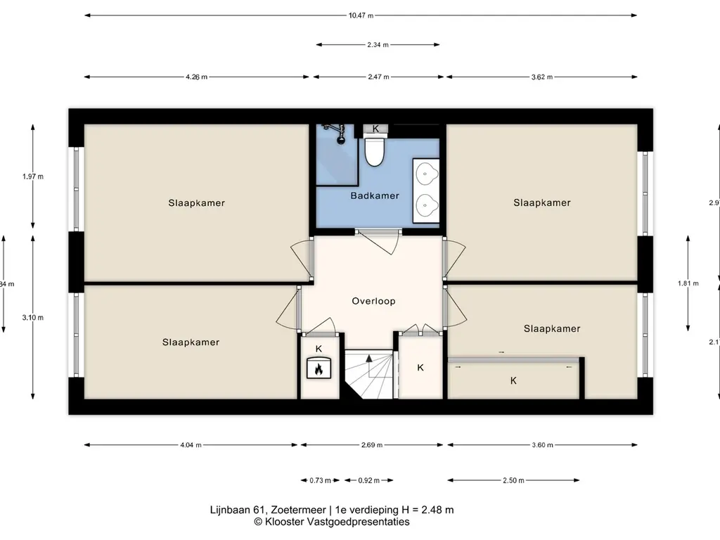 De eerste verdieping is zeer ruim opgezet met aan de voor-en achterzijde twee masterbedrooms maar ook de overige 2 kamers zijn prima formaat.de badkamer is eveneens keurig onderhouden en v.v. douche, toilet, dubbel wastafelmeubel, mechanische ventilatie en handdoekradiator. Op de overloop treft u een berging alwaar opstelplaats cv combi ketel en een tweede berging.