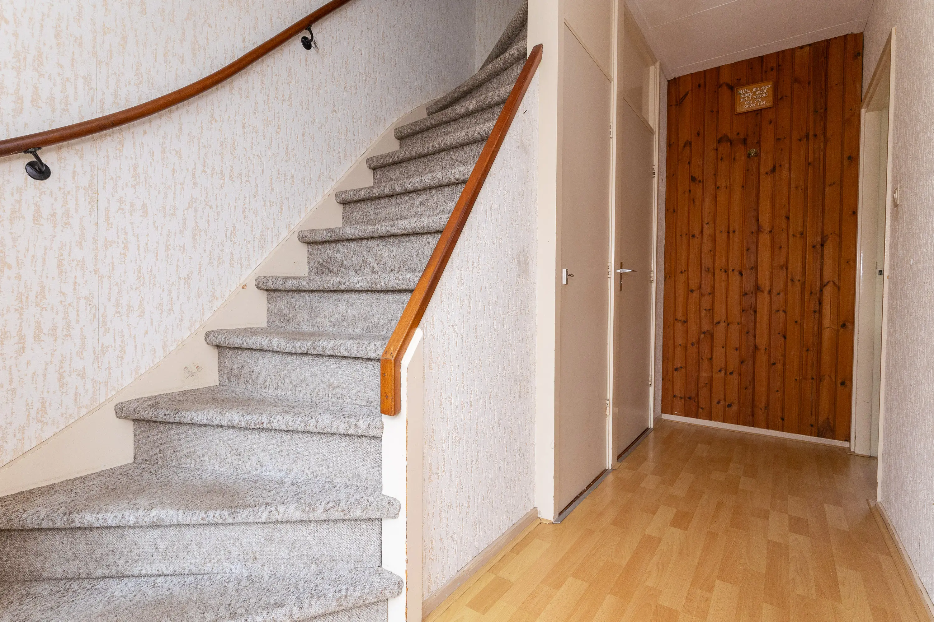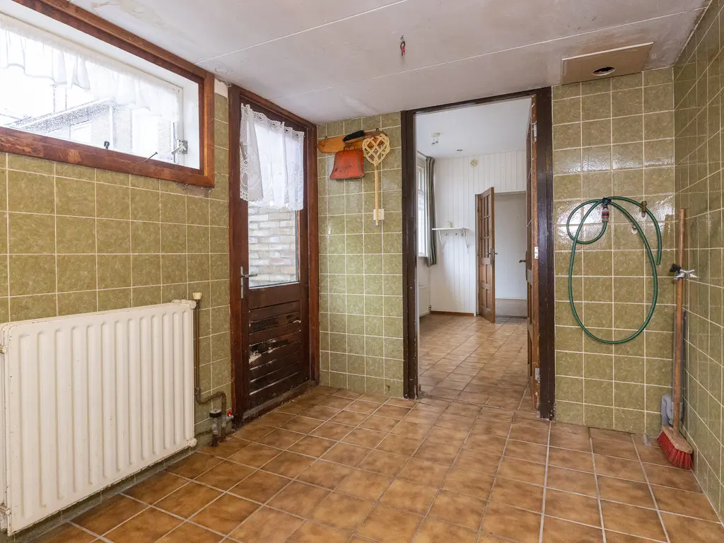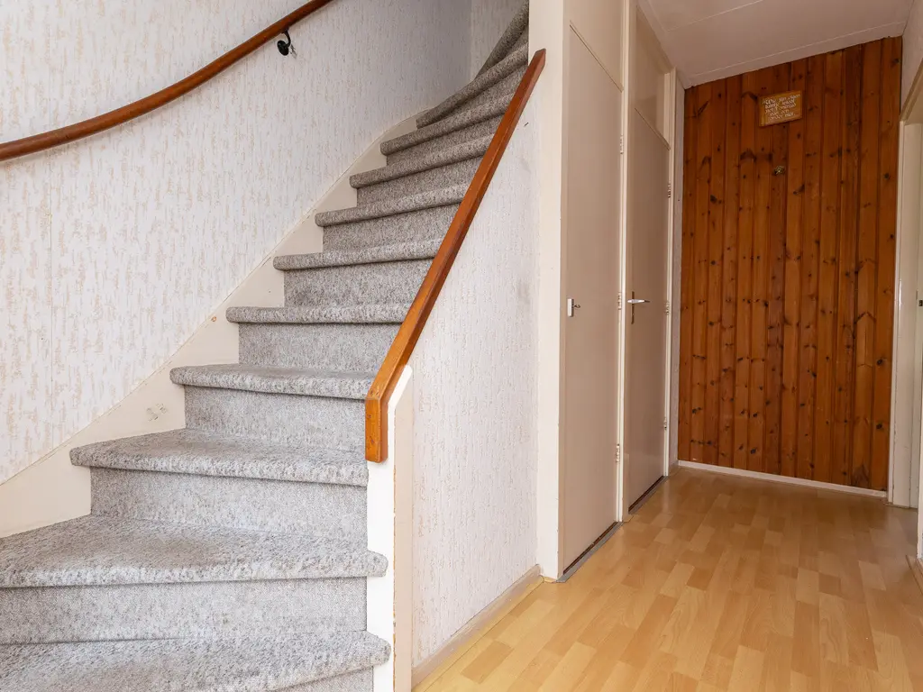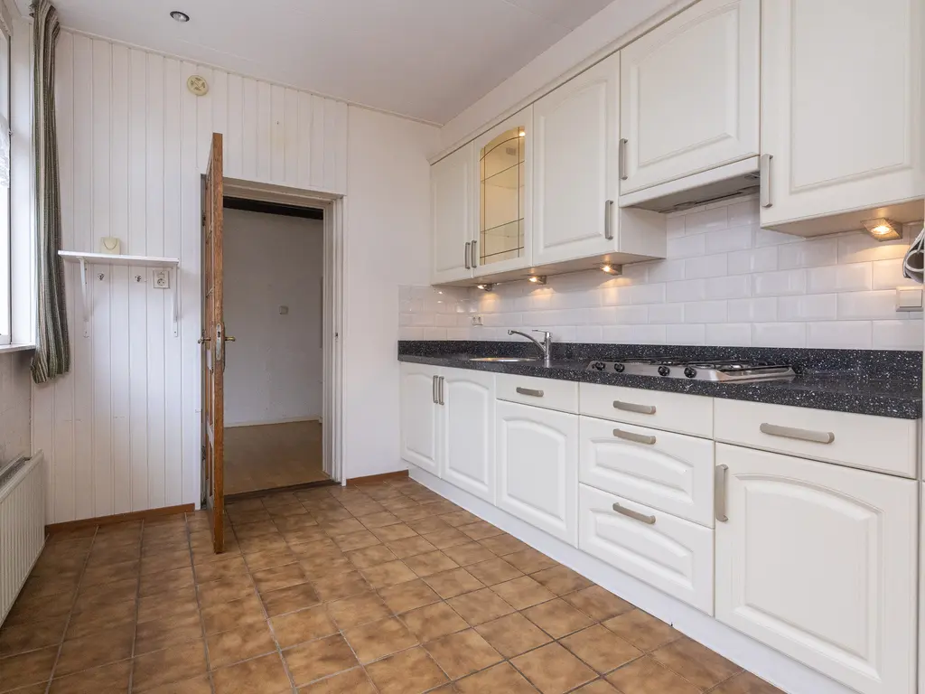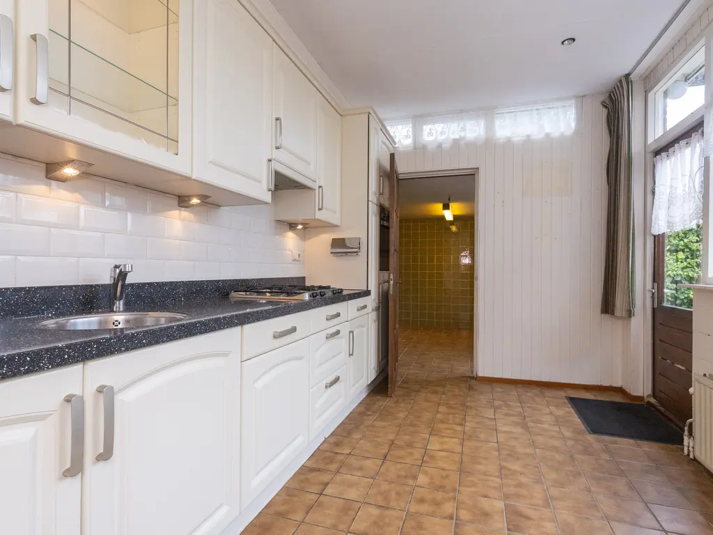De voortuin met groen en bloemen verwelkomt u direct bij aankomst. Via de overdekte entree komt u in de hal met toilet, meterkast, trapopgang, trapkast en toegang tot de woonkamer. De royale woonkamer is heerlijk licht dankzij de grote ramen en de aluminium schuifpui naar de achtertuin. Aan de achterzijde bevindt zich de ruime keuken, voorzien van diverse inbouwapparatuur zoals een koelkast, oven, vaatwasser, 4-pits gaskookplaat, natuurstenen aanrechtblad en elektrische boiler. Achter de keuken bevindt zich de praktische bijkeuken met witgoedaansluitingen en extra bergruimte.