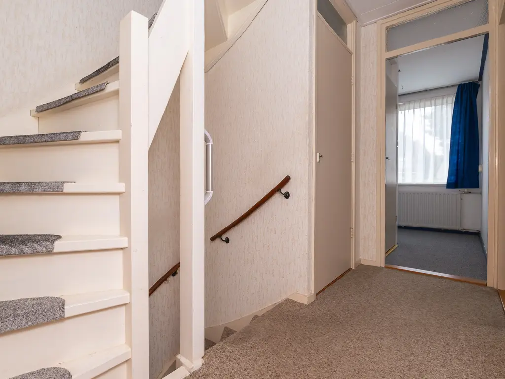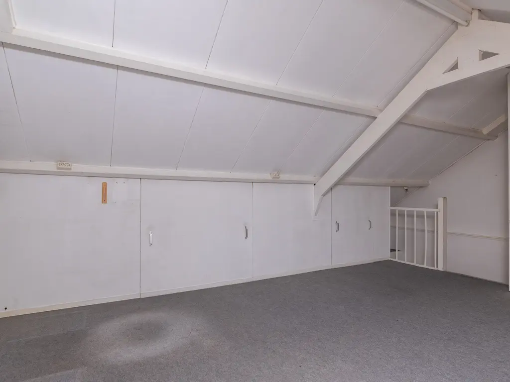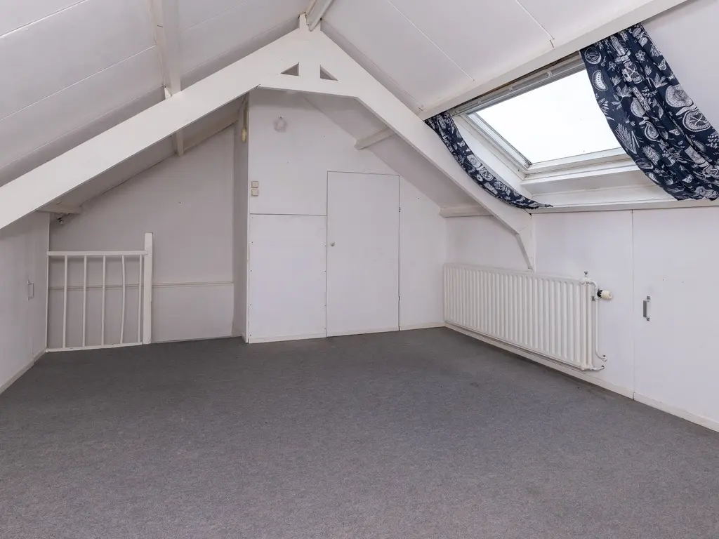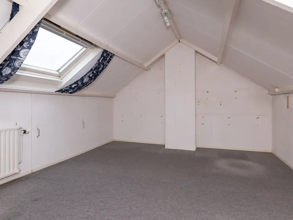 De vaste trap leidt naar de tweede verdieping met een groot dakraam, radiator en veel bergruimte. Hier is ook de cv-installatie (2024) keurig weggewerkt in een kast. Deze verdieping kan desgewenst ook worden ingericht als extra slaapkamer, hobbykamer of thuiswerkplek.