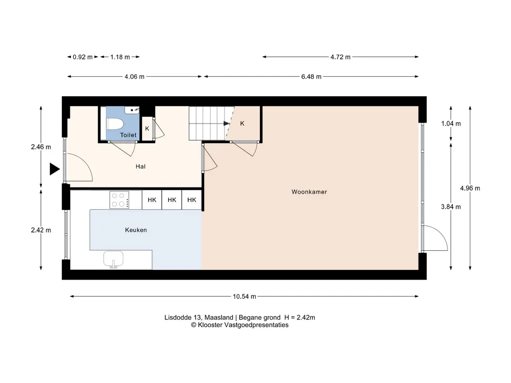 Via de entree kom je binnen in de ruime hal met toiletruimte, meterkast en trapopgang. Aan de voorzijde bevindt zich de moderne keuken, geplaatst in 2019 en uitgevoerd in een tijdloze en nette stijl. De keuken verkeert in zeer goede staat en is voorzien van diverse inbouwapparatuur.