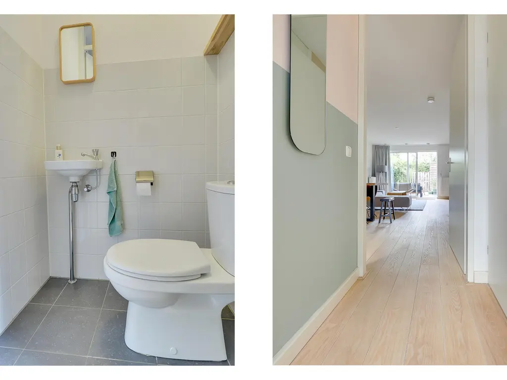 Via de entree kom je in de hal met meterkast en toilet. De lichte woonkamer met open trap biedt een sfeervolle leefruimte met voldoende plek voor een gezellige zithoek en eettafel. De moderne open keuken ligt aan de voorzijde en is voorzien van diverse inbouwapparaten.