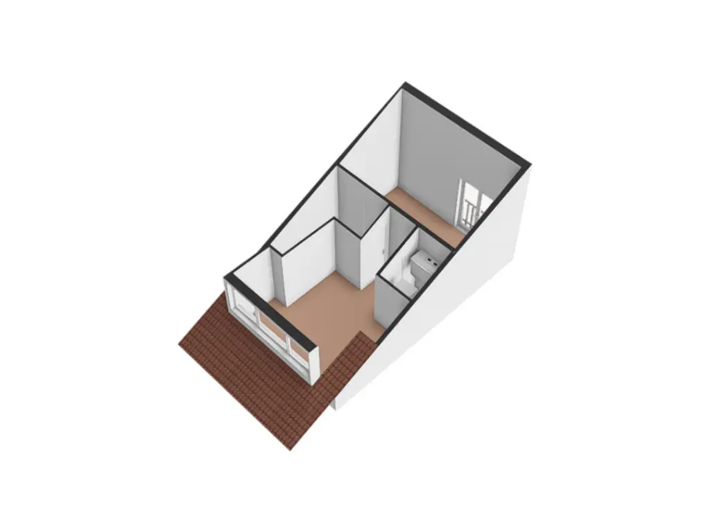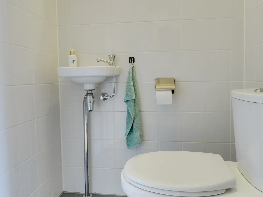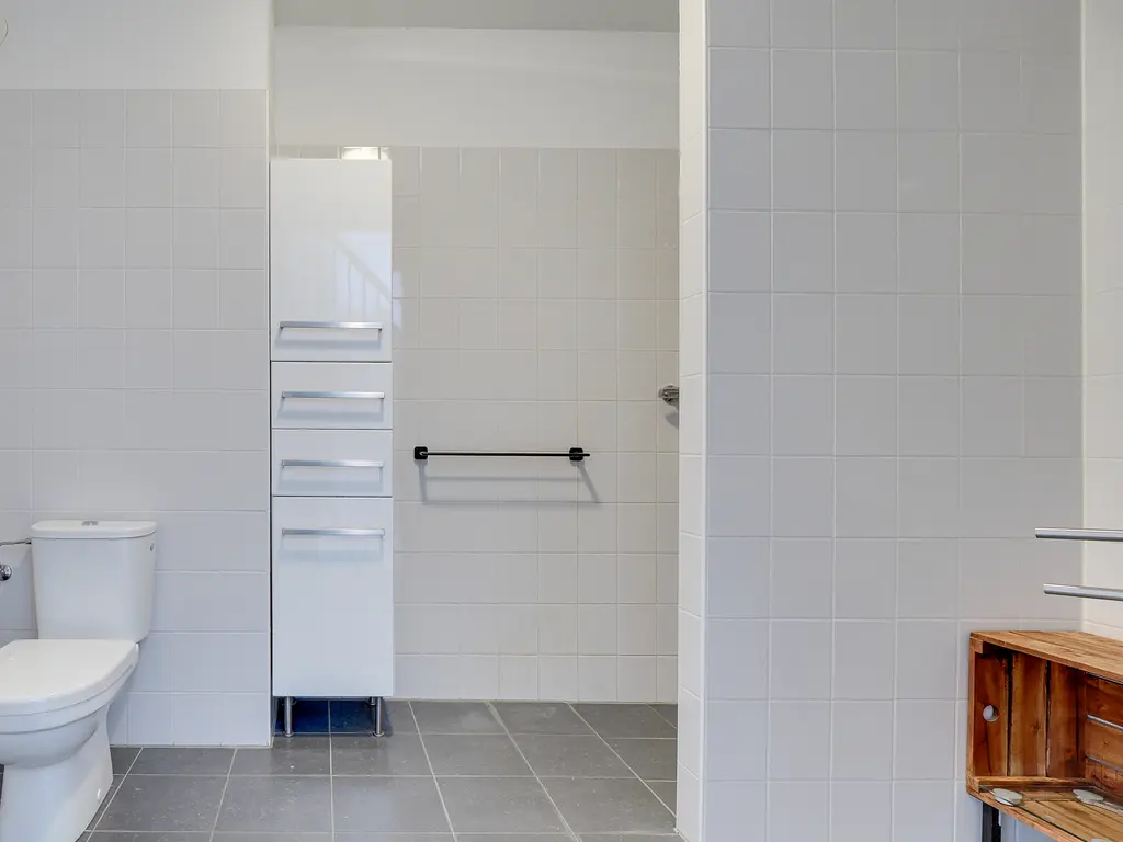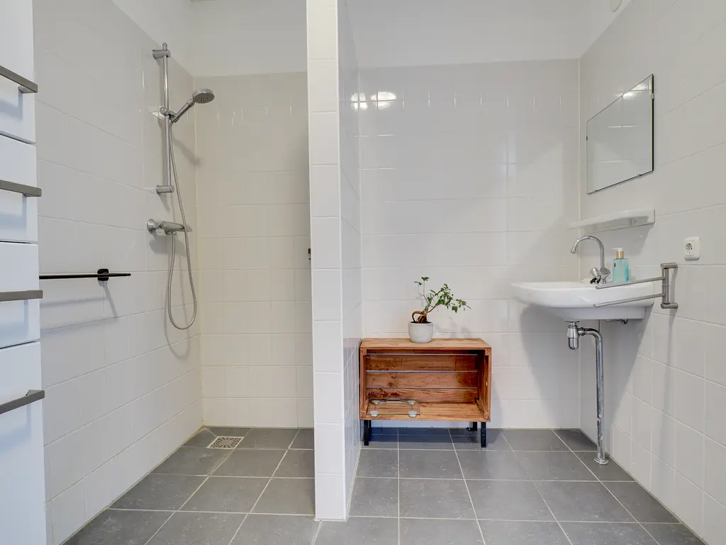 De overloop geeft toegang tot twee slaapkamers en een moderne badkamer met toilet, wastafel en inloopdouche.