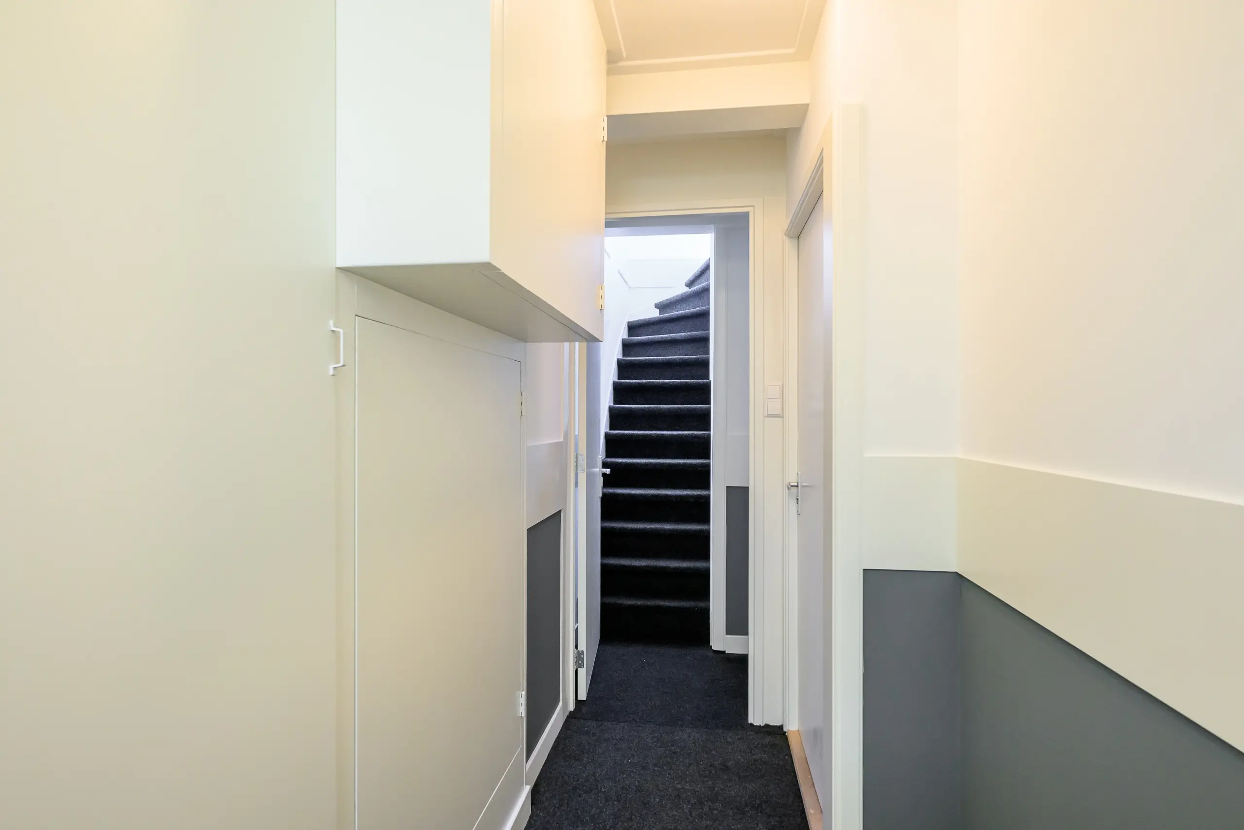 Je betreedt de woning via de trap naar de eerste verdieping, waar de lichte en strak afgewerkte woonkamer direct een ruimtelijk gevoel geeft. De open keuken is modern uitgevoerd met inbouwapparatuur, een inductiekookplaat, afzuigkap ect. Aan de achterzijde bevindt zich het dakterras. Verder vind je op deze verdieping een separate toiletruimte.