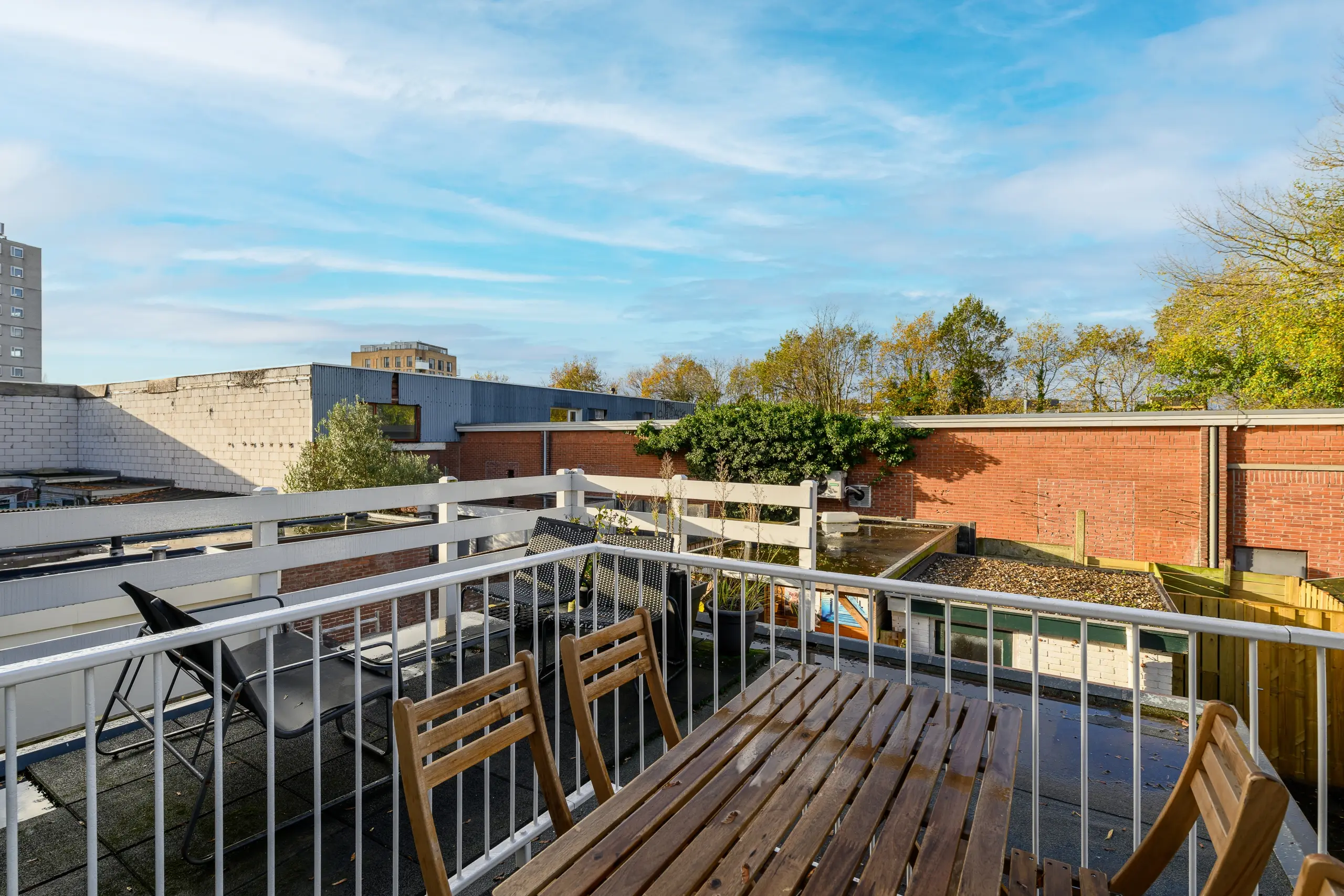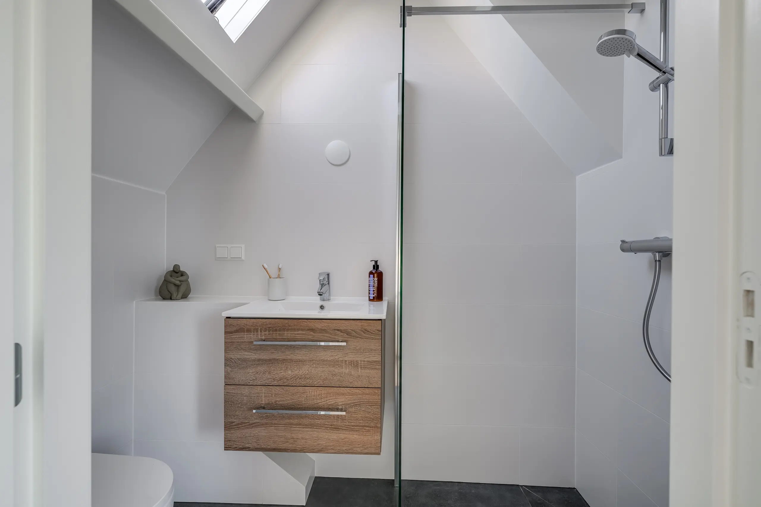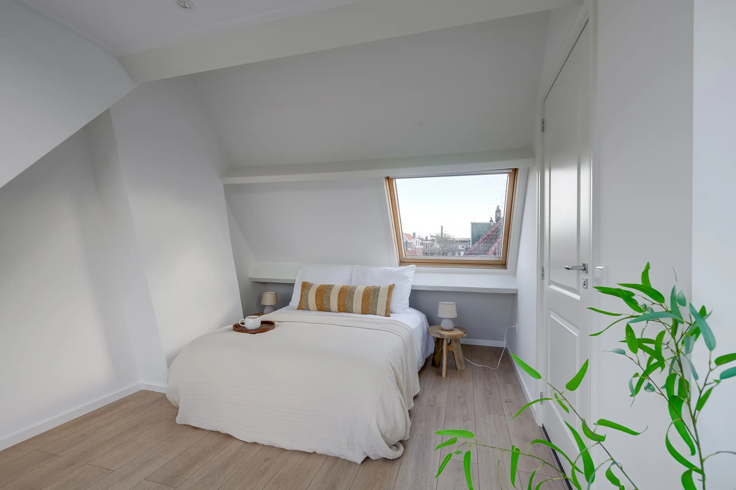 Een stijlvolle trap leidt naar de bovenste etage, waar de ruime slaapkamer met speelse daklijnen en groot dakraam een rustige sfeer creëert. De moderne badkamer is slim ingedeeld en voorzien van een inloopdouche, wastafelmeubel en tweede toilet. Ook deze verdieping heeft een eigen dakterras, perfect om tot rust te komen in de avondzon.