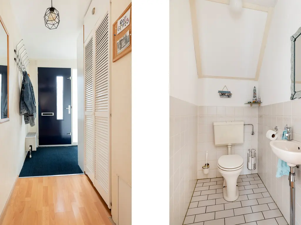U komt binnen in de hal met de meterkast en een nette toiletruimte, gedeeltelijk betegeld in een lichte kleur en voorzien van een duoblok en fonteintje.