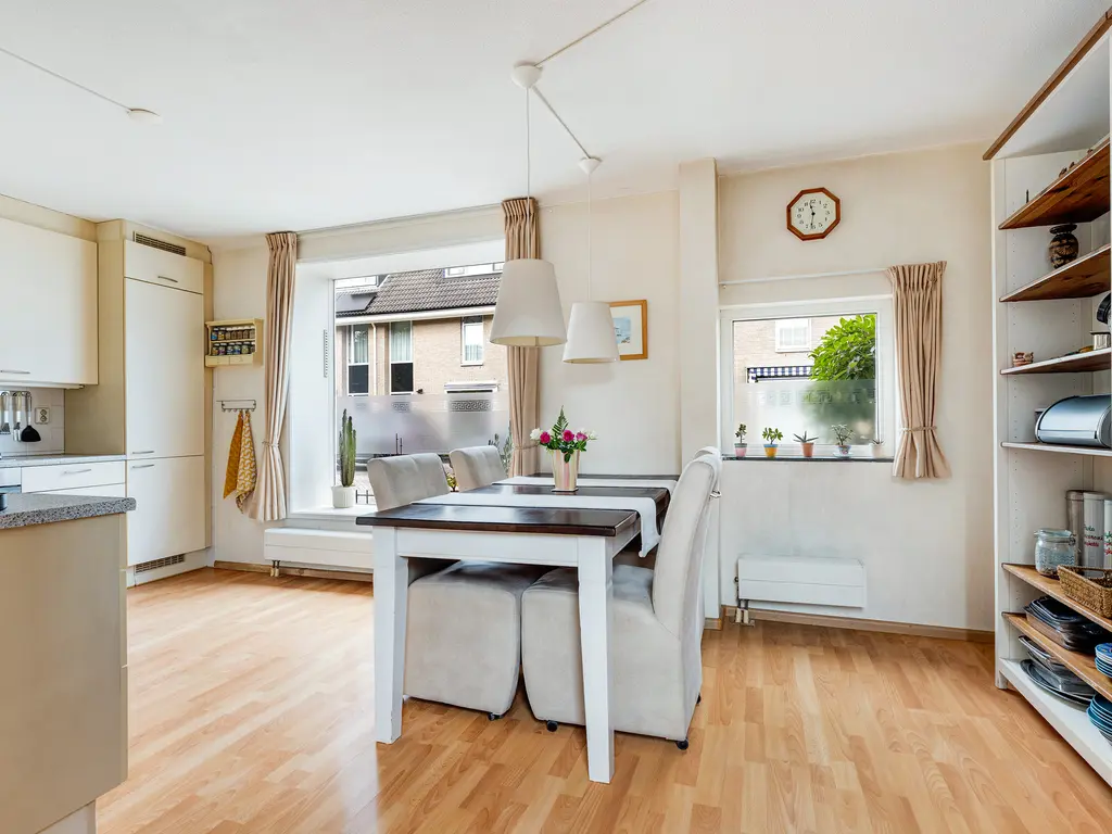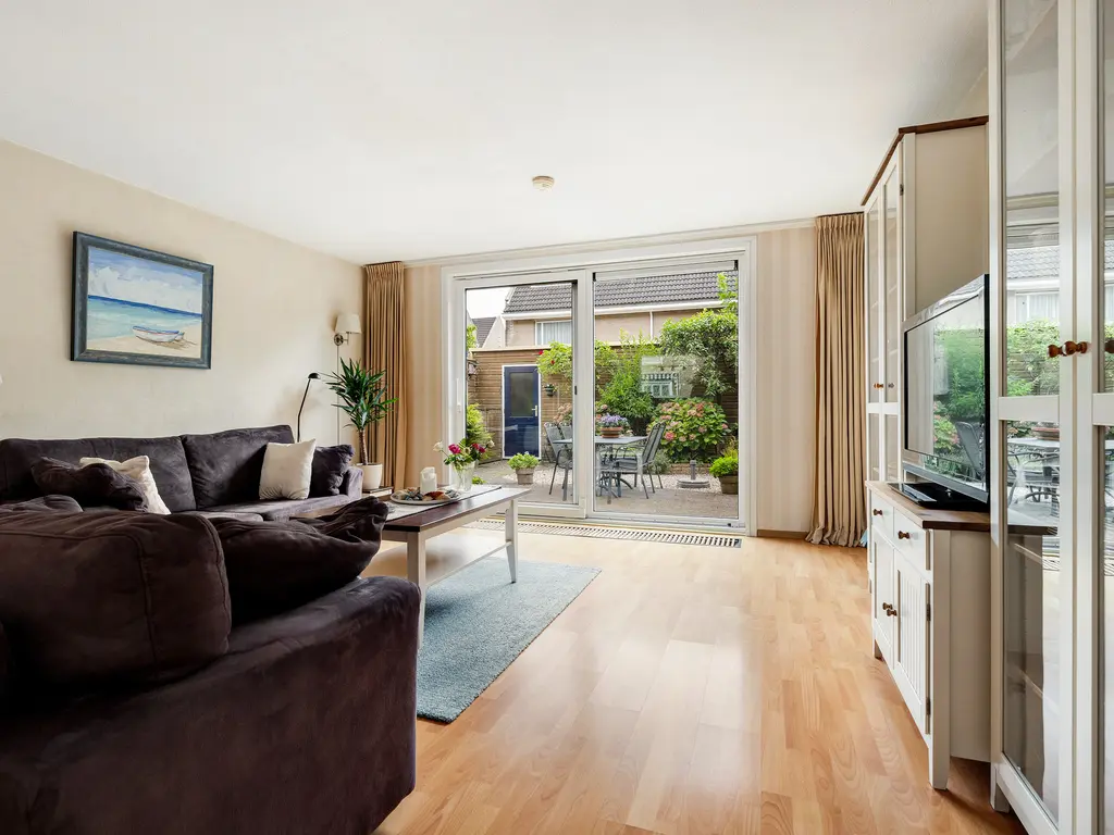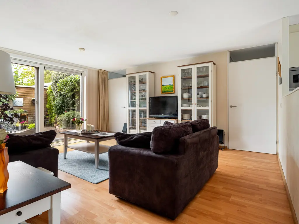 De tuingerichte woonkamer (ca. 25 m²) is licht en ruimtelijk dankzij de grote raampartijen en de schuifpui met hordeur richting de zonnige achtertuin. Verwarming vindt plaats via een convectorput bij de schuifpui.