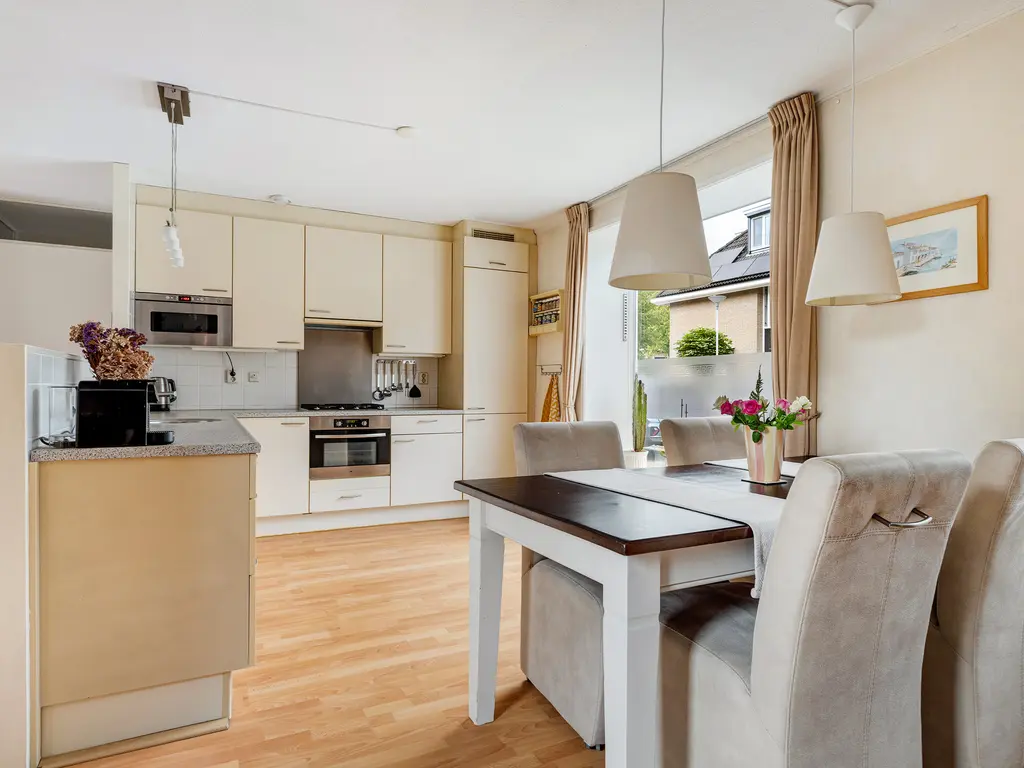 Aan de voorzijde bevindt zich de ruime open keuken (ca. 18 m²), uitgevoerd in een lichte kleurstelling met kunststof aanrechtblad. De keuken is opgesteld in een hoek en voorzien van een koel/vriescombinatie, oven, magnetron, vaatwasser en een 4-pits gaskookplaat met geïntegreerde afzuiging. De uitbouw aan de zijkant geeft een speels effect en zorgt voor extra wooncomfort. Door deze extra ruimte is er plaats genoeg voor een gezellige eethoek.