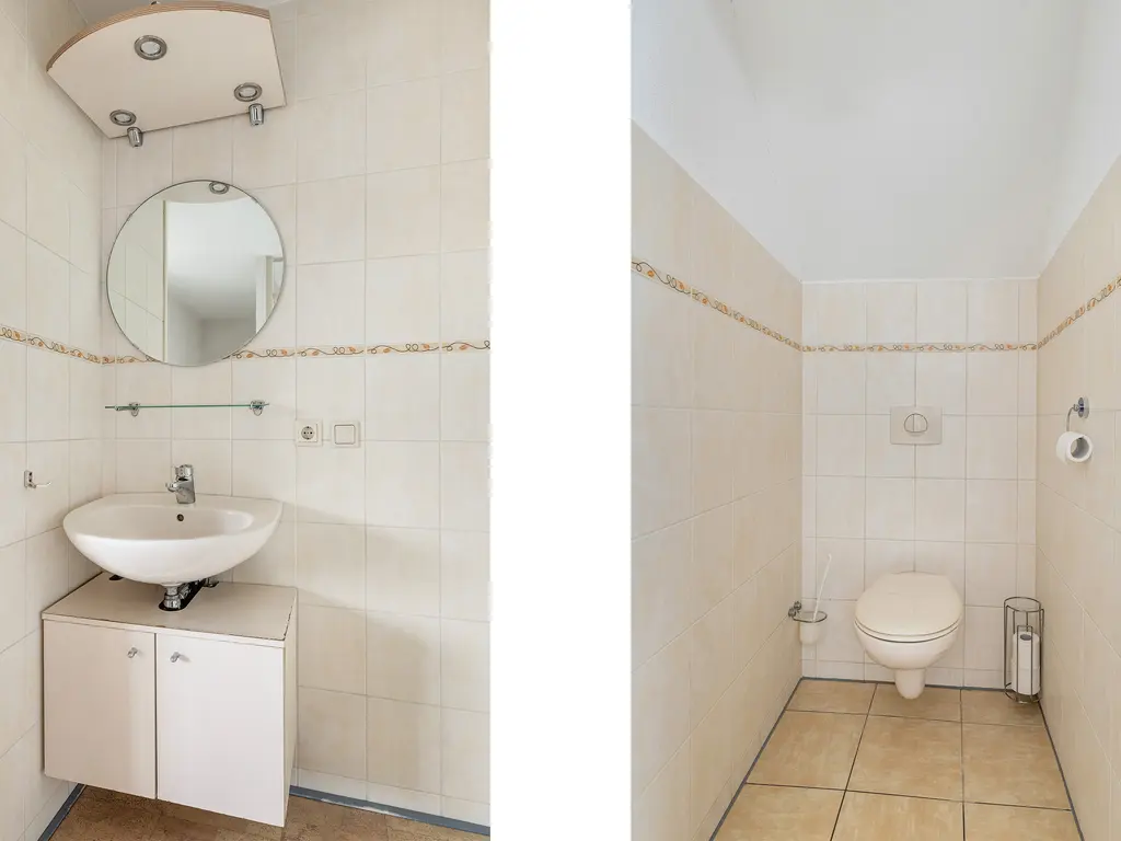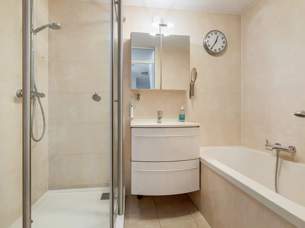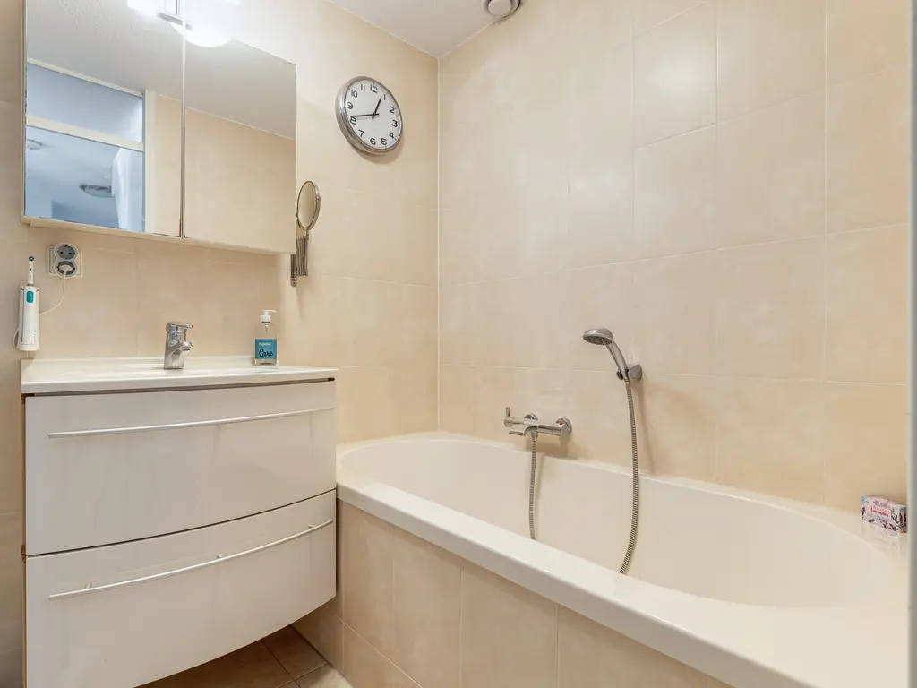 De badkamer (ca. 4 m²) is compleet uitgevoerd met een ligbad, een aparte douchecabine en een wastafelmeubel. Geheel betegeld in een neutrale beige kleurstelling.