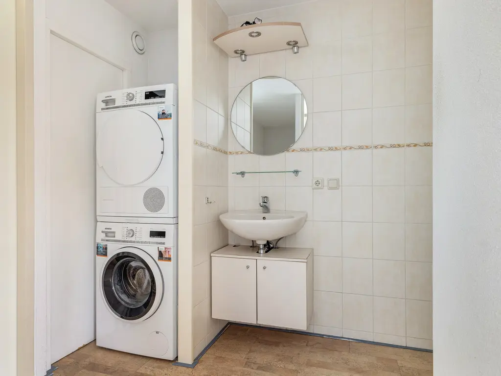 Op de overloop vindt u de aansluitingen voor wasmachine en droger, een vaste wastafel, en een praktische kast met veel bergruimte en de opstelplaats voor de CV-ketel, de mechanische ventilatie en de omvormer van de zonnepanelen. Hier bevindt zich ook een tweede toilet (hangend model, Sanibroyeur).