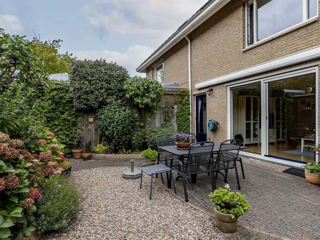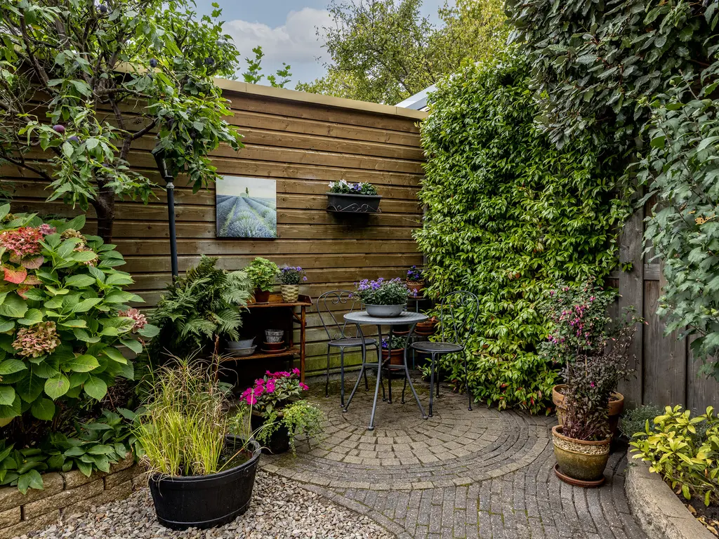 De achtertuin op het zuidwesten is een waar paradijs. Sfeervol aangelegd met sierbestrating, veel groen en bloeiende planten. Dankzij de beschutte ligging geniet u hier van optimale privacy. Er is een vijver en een elektrisch zonnescherm voor extra comfort. De tuin is ook bereikbaar middels een deur aan de zijkant.