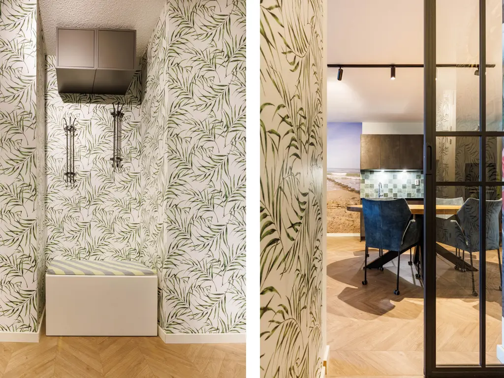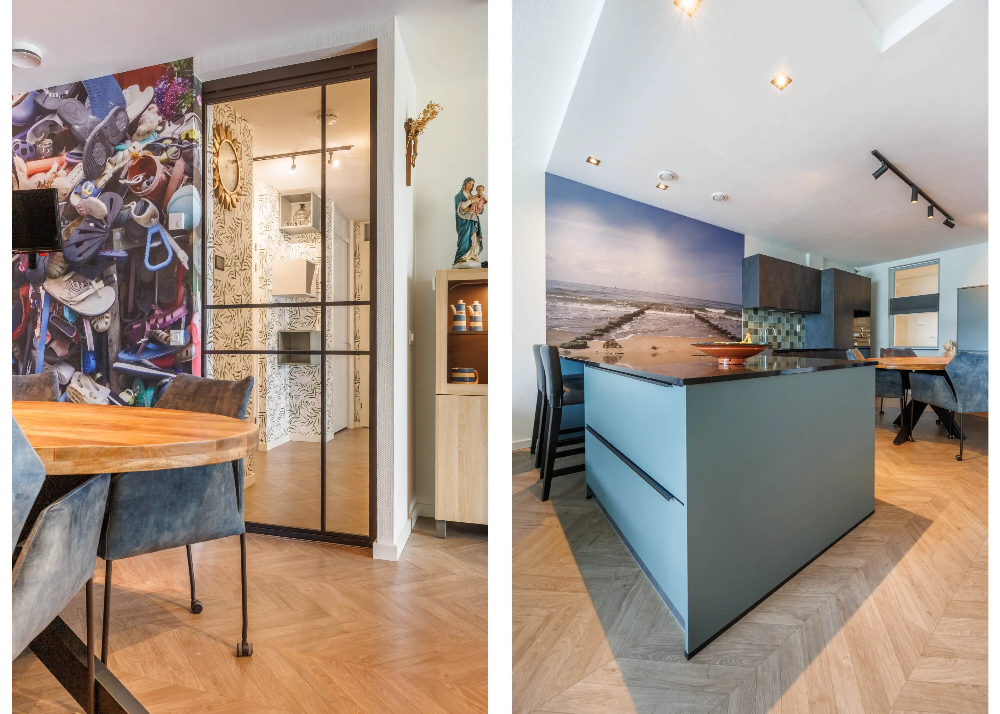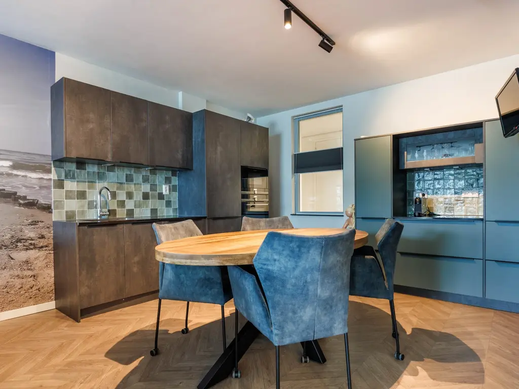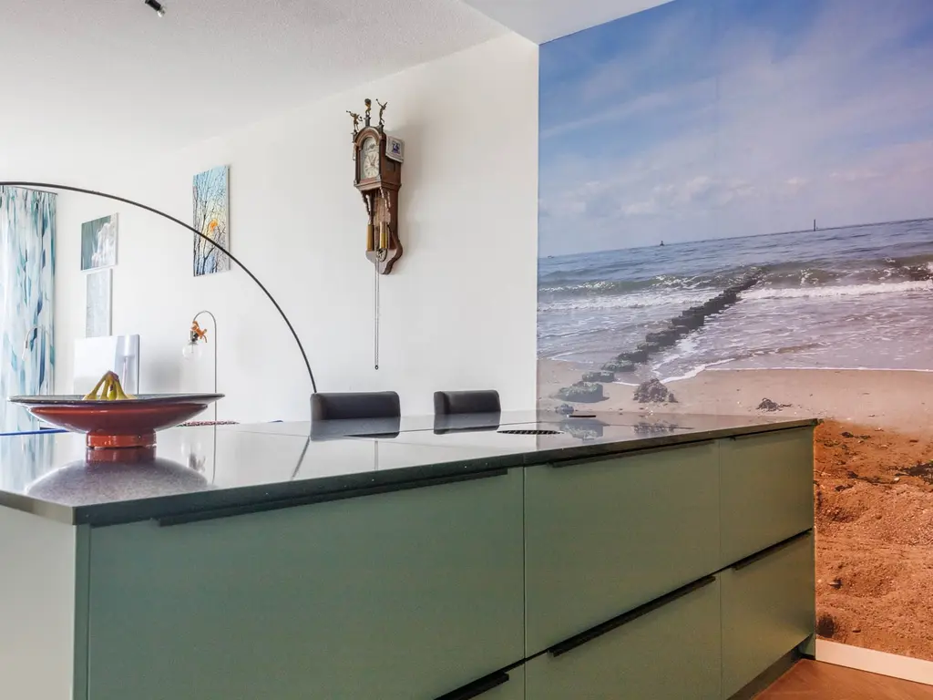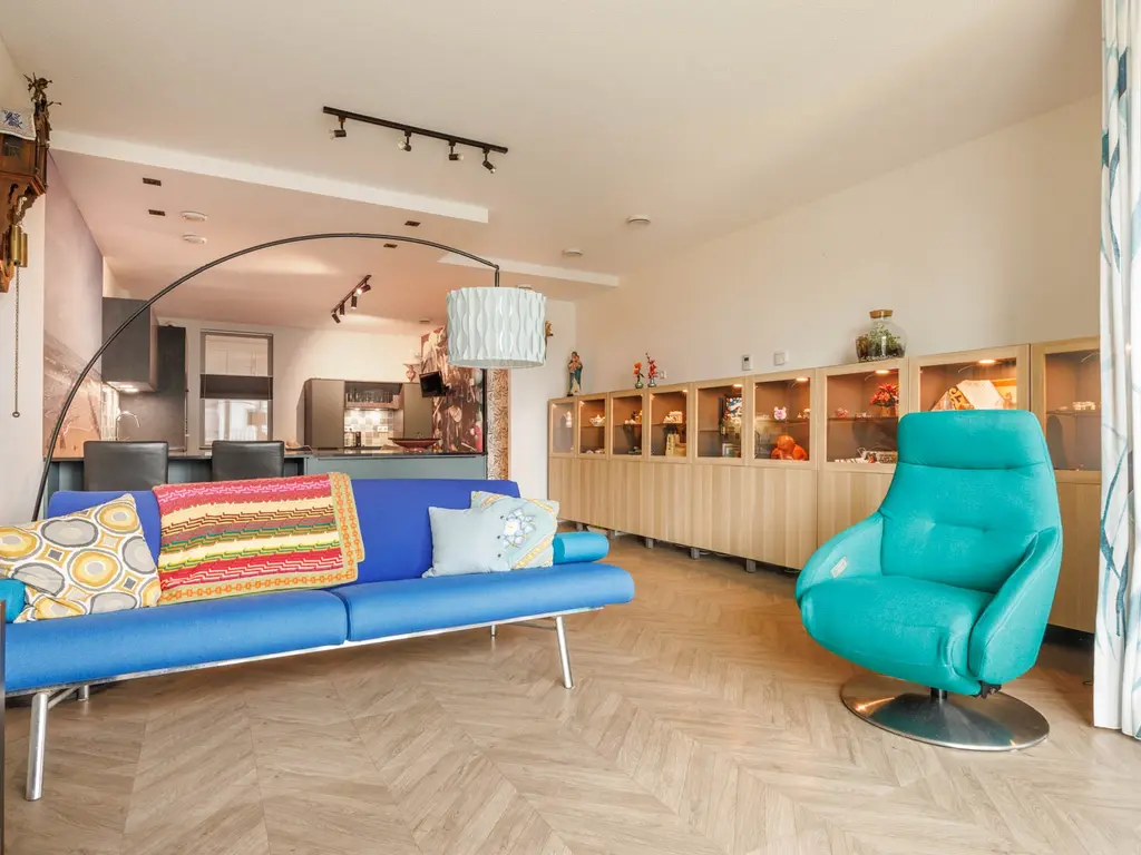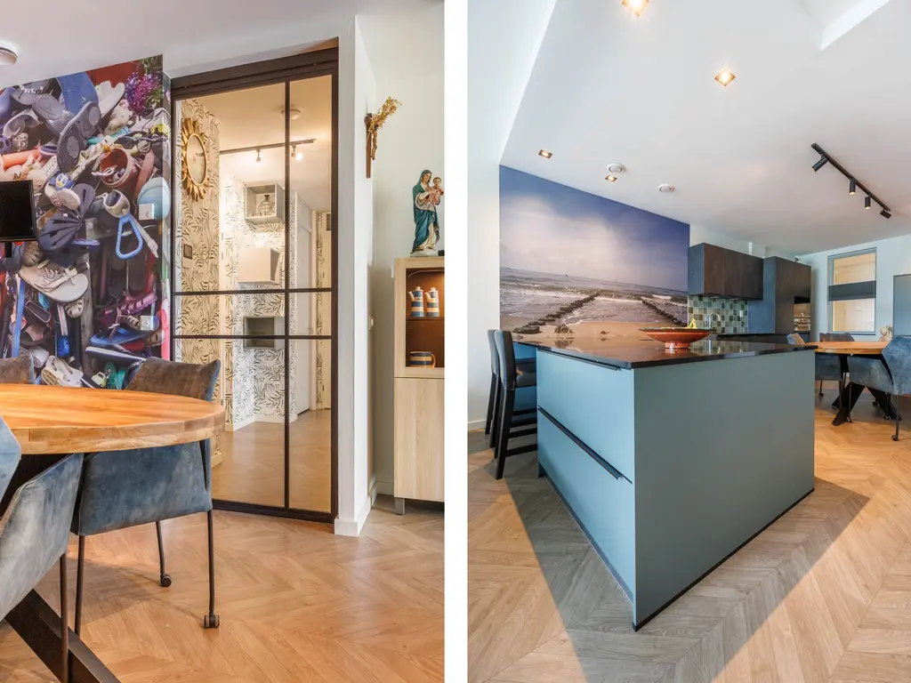 Spacious hallway with a cosy sitting nook and access to all rooms. The bright living room features an open, large luxury kitchen with a (peninsula) cooking island and seating area, fitted with various built-in appliances including an induction hob with integrated extractor, oven, microwave, dishwasher, and large refrigerator. The attractive kitchen consists of three sections: a cooking island, a sink area, and a cosy coffee corner — offering more than enough workspace and storage.