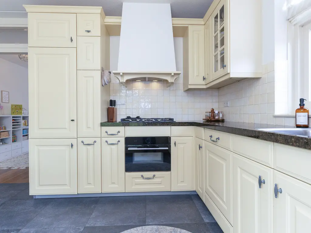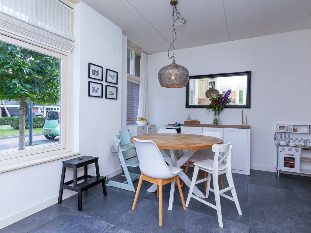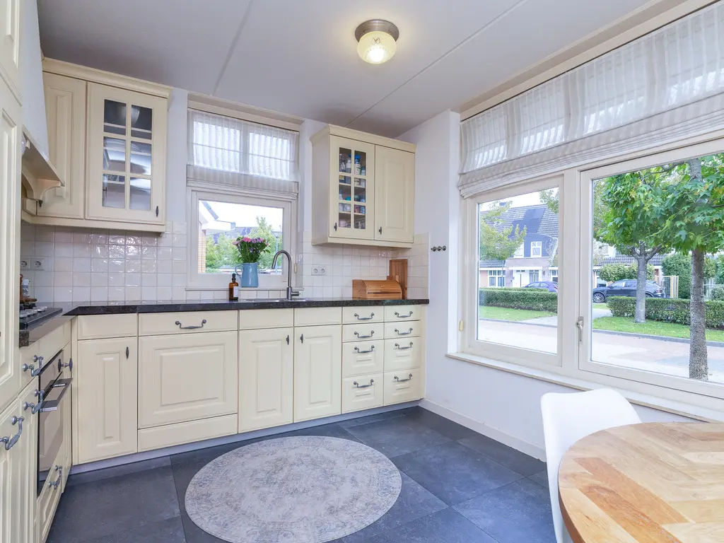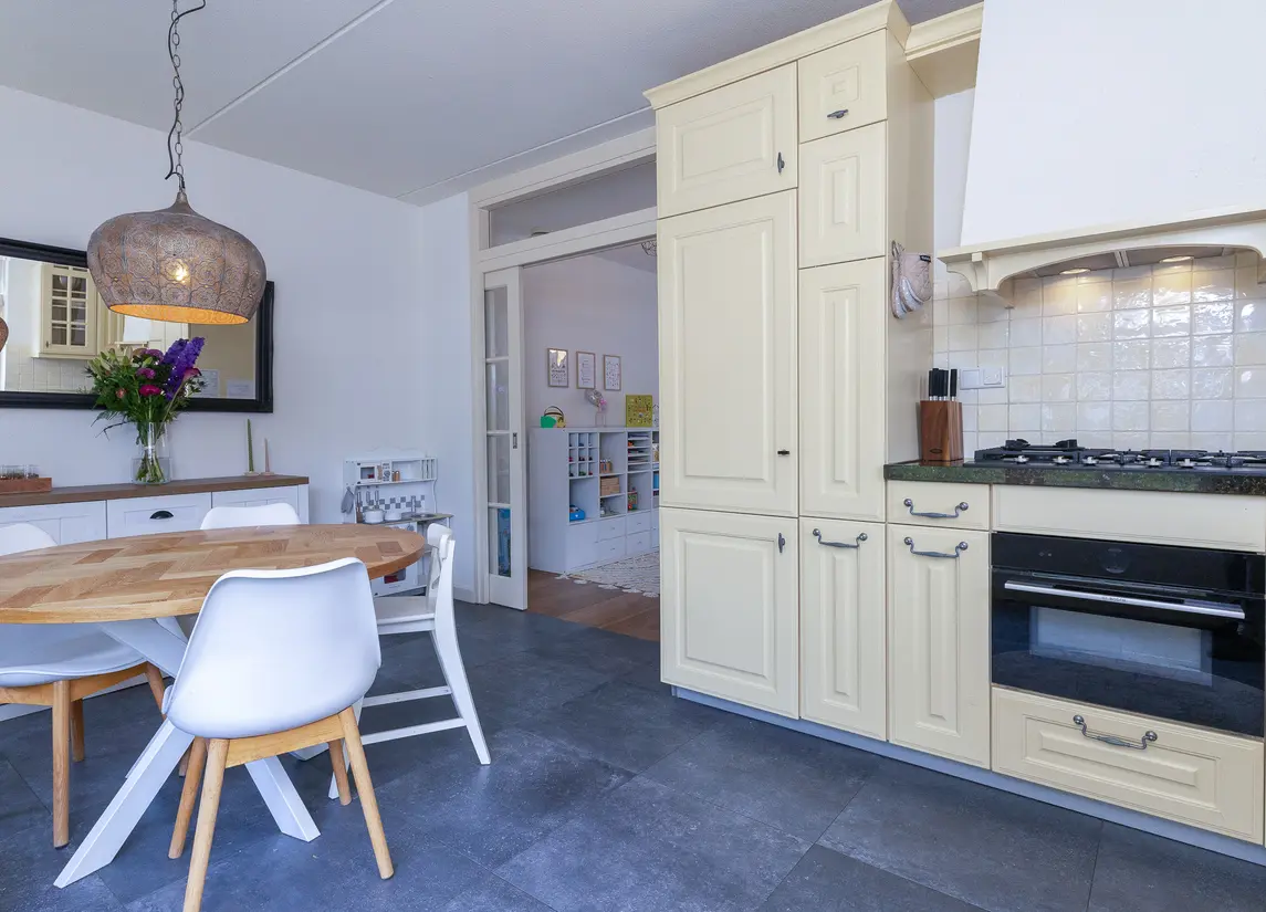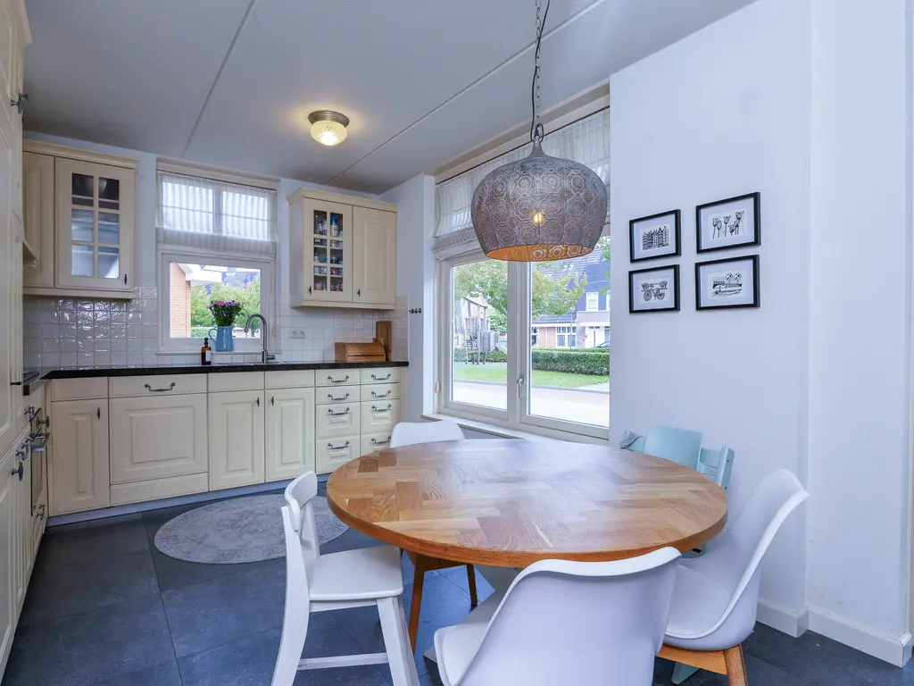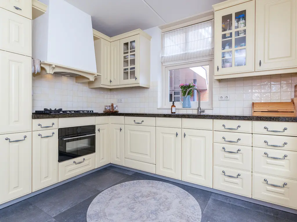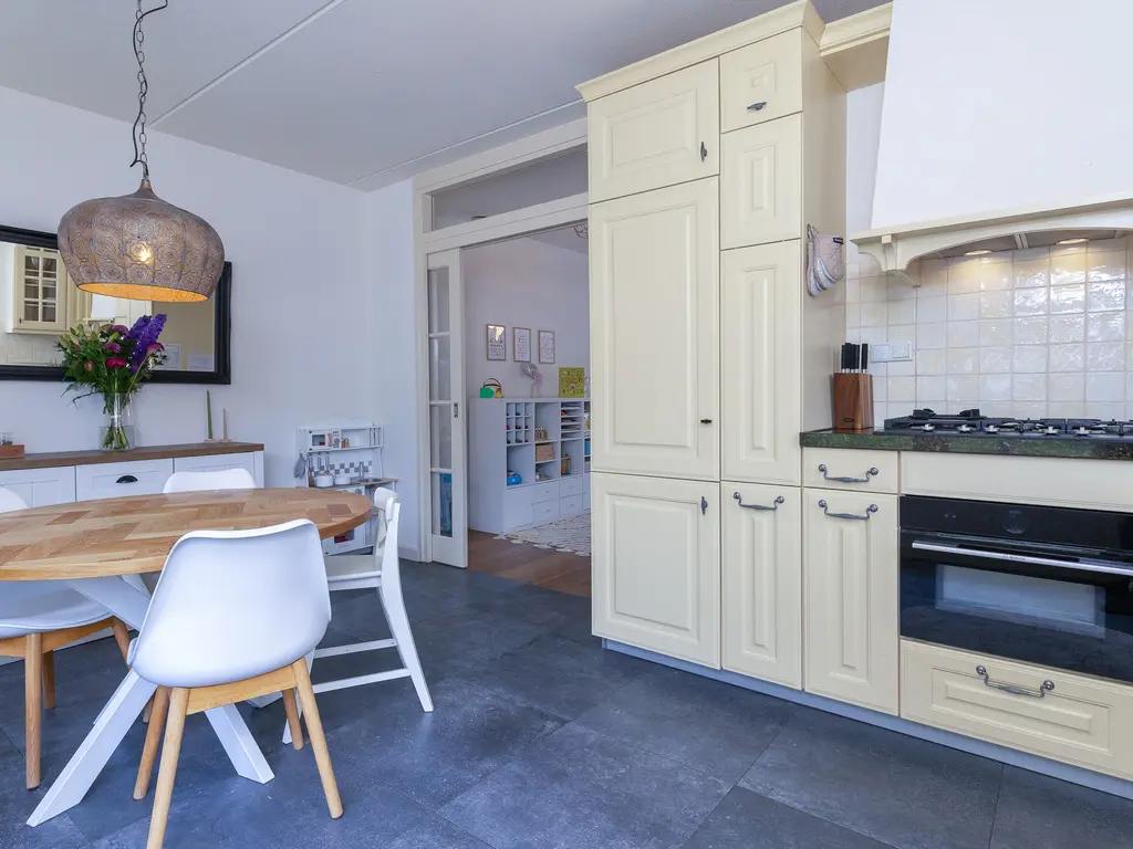 De verzorgde voortuin leidt naar de overdekte entree. De hal biedt toegang tot het toilet, de meterkast, trapopgang en woonkamer. De woonkamer is royaal van formaat, met veel licht en openslaande deuren naar de tuin. De houten vloer en warme afwerking zorgen voor een sfeervolle uitstraling. Aan de voorzijde bevindt zich de woonkeuken in landelijke stijl met natuurstenen blad en benodigde apparatuur, waaronder een vernieuwde combi-oven uit 2024, koelkast, vriezer, afzuiging en de vaatwasser.
