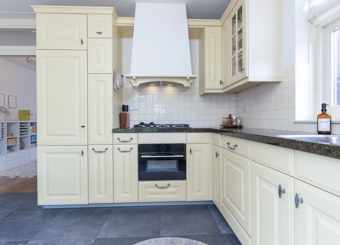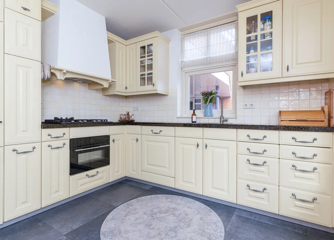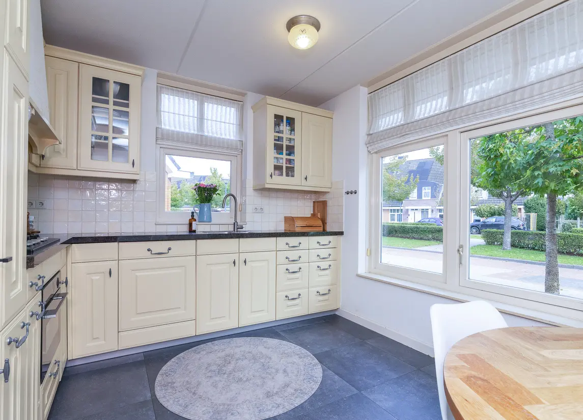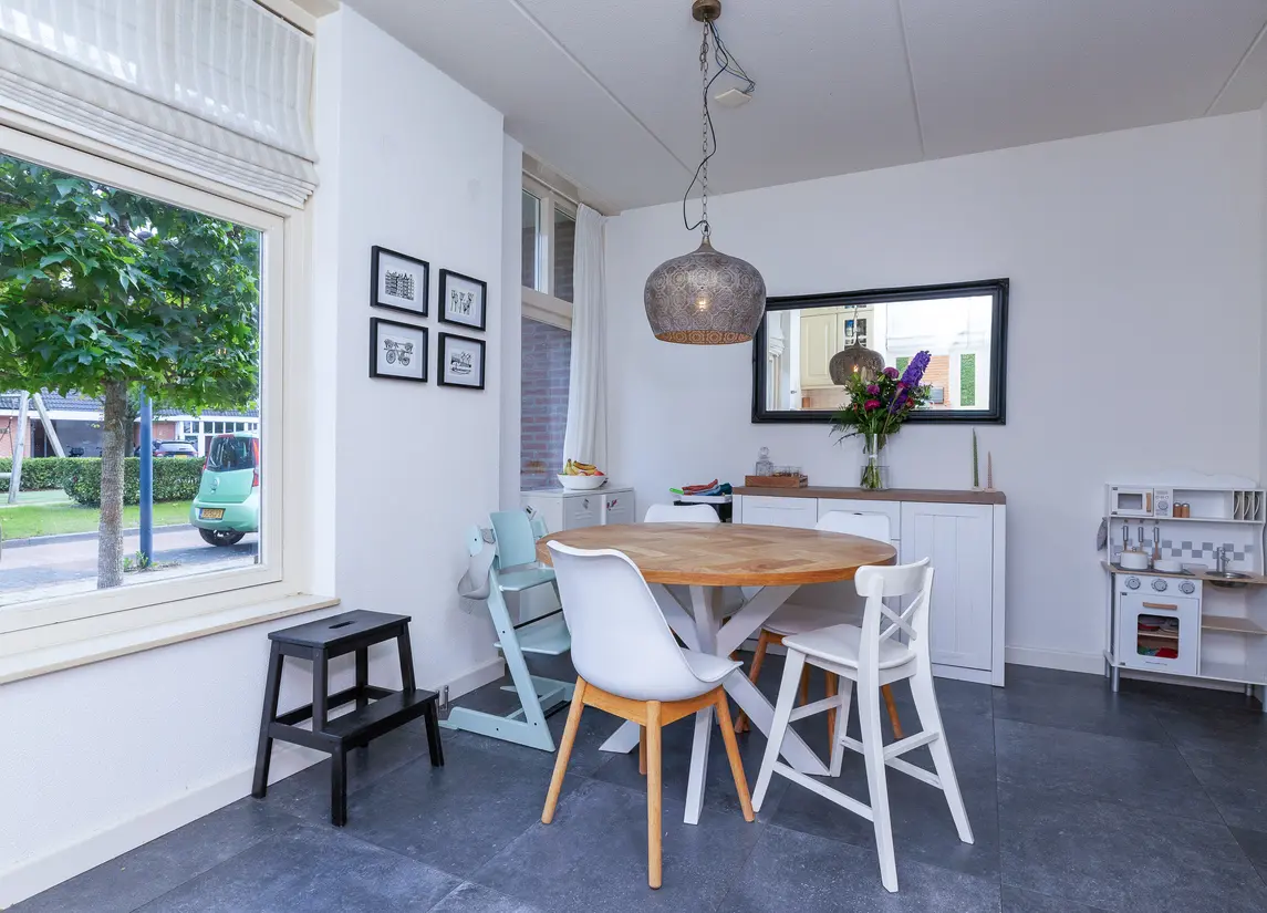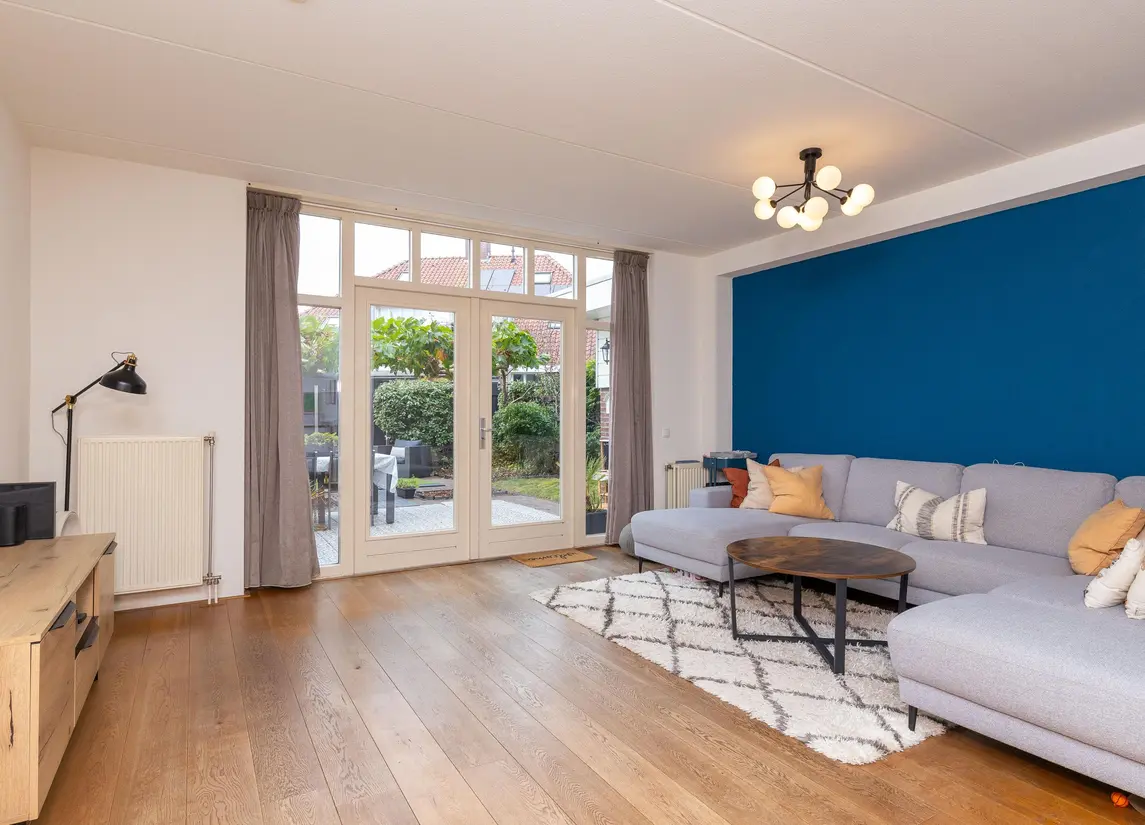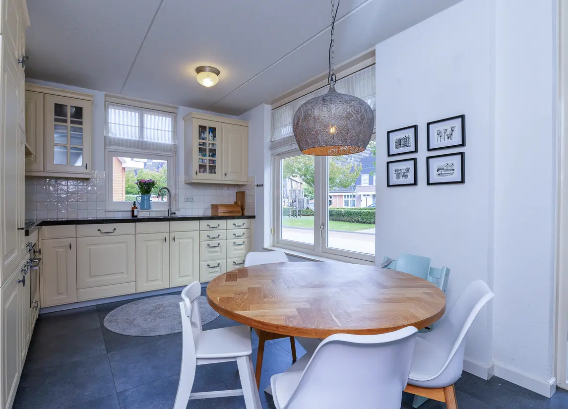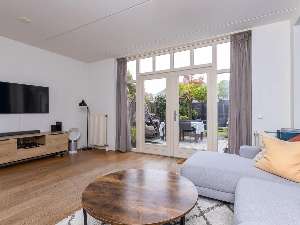 De verzorgde voortuin leidt naar de overdekte entree. De hal biedt toegang tot het toilet, de meterkast, trapopgang en woonkamer. De woonkamer is royaal van formaat, met veel licht en openslaande deuren naar de tuin. De houten vloer en warme afwerking zorgen voor een sfeervolle uitstraling. Aan de voorzijde bevindt zich de woonkeuken in landelijke stijl met natuurstenen blad en benodigde apparatuur, waaronder een vernieuwde combi-oven uit 2024, koelkast, vriezer, afzuiging en de vaatwasser.