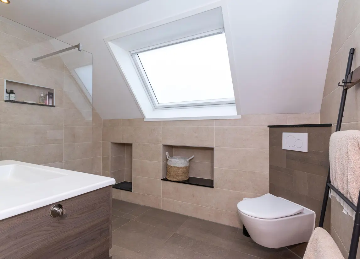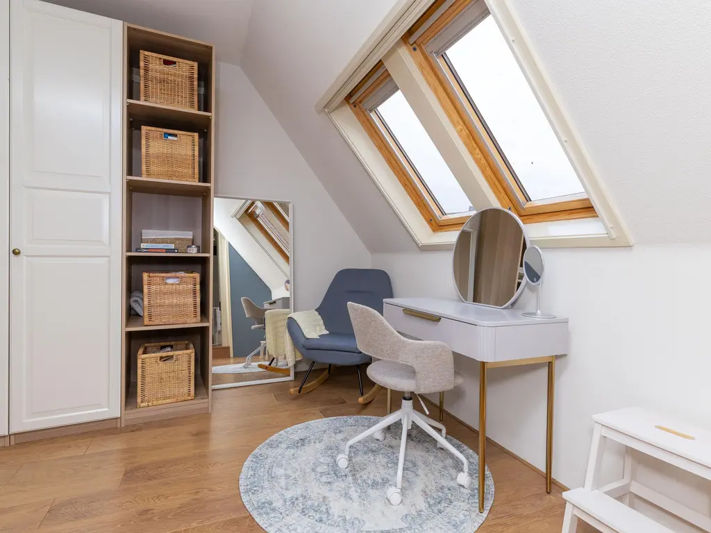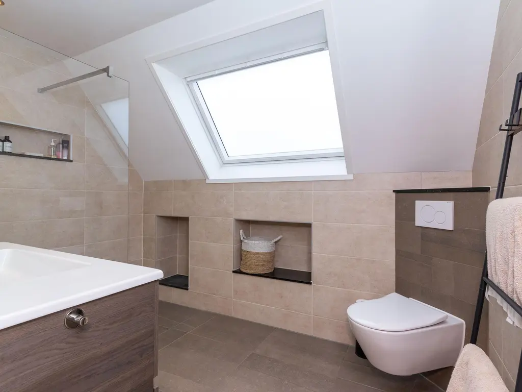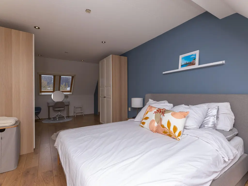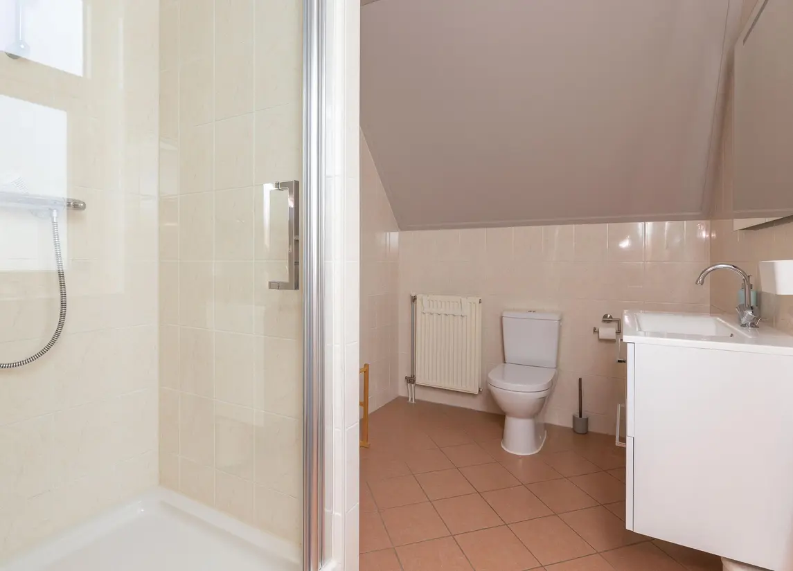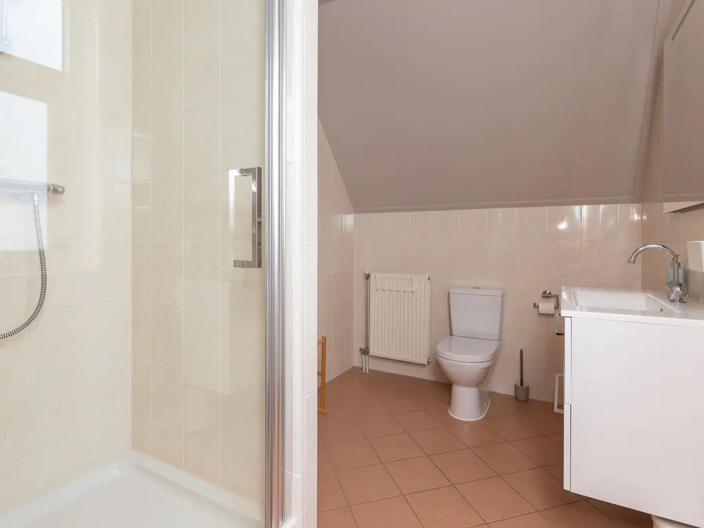 Hier bevindt zich de vijfde slaapkamer en een tweede badkamer voorzien van inloopdouche, wastafel en een derde toilet. Ook is op deze etage de technische ruimte met WTW-unit en cv gevestigd.