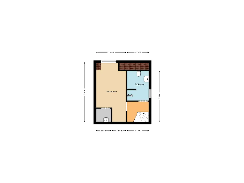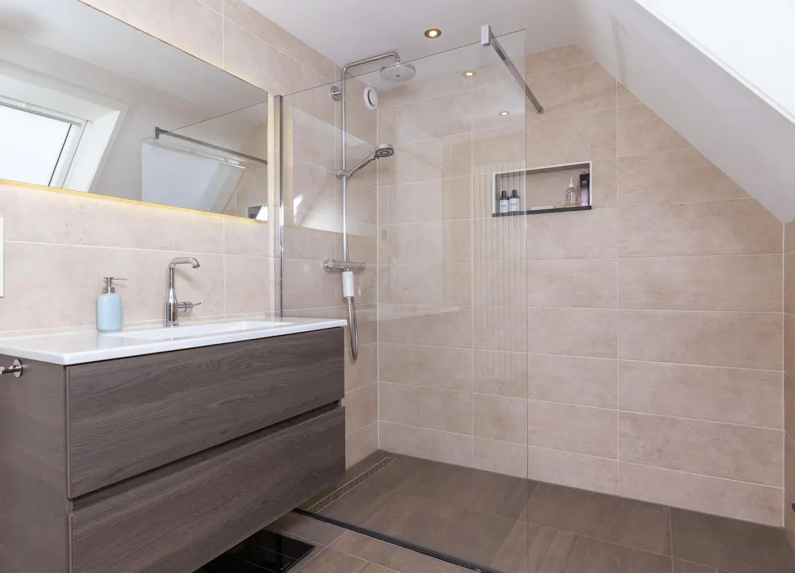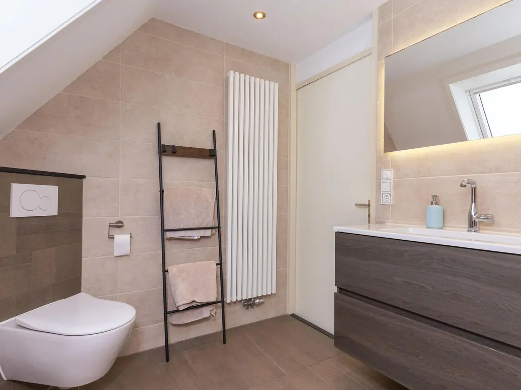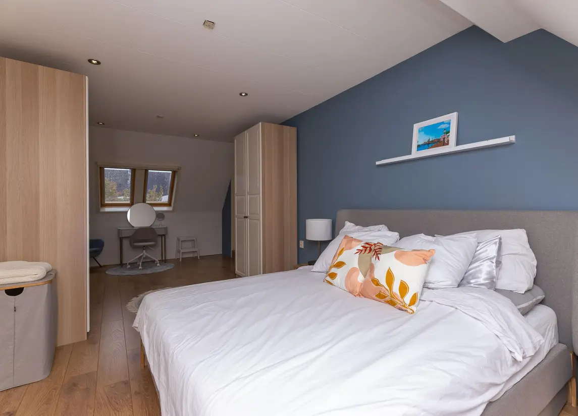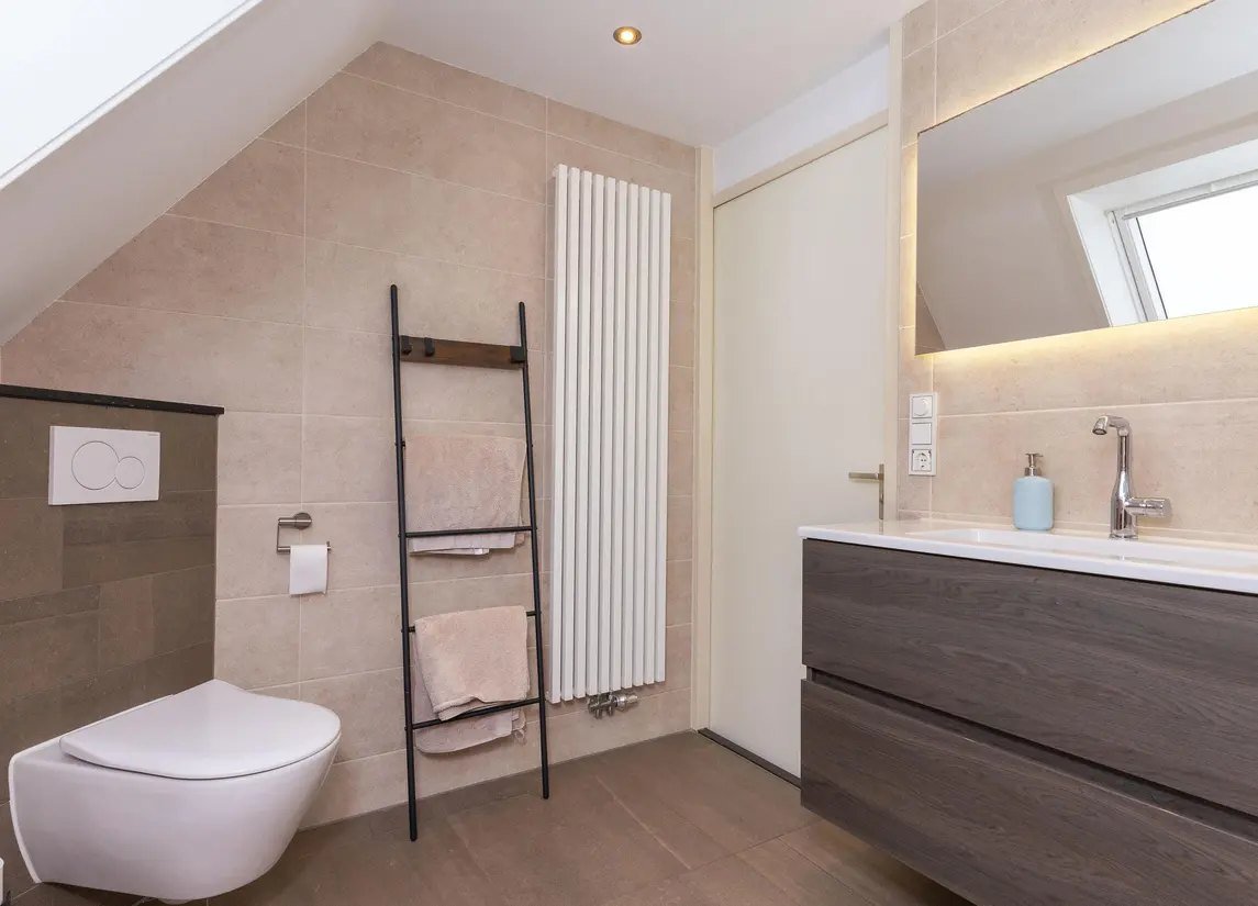 Hier bevindt zich de vijfde slaapkamer en een tweede badkamer voorzien van inloopdouche, wastafel en een derde toilet. Ook is op deze etage de technische ruimte met WTW-unit en cv gevestigd.