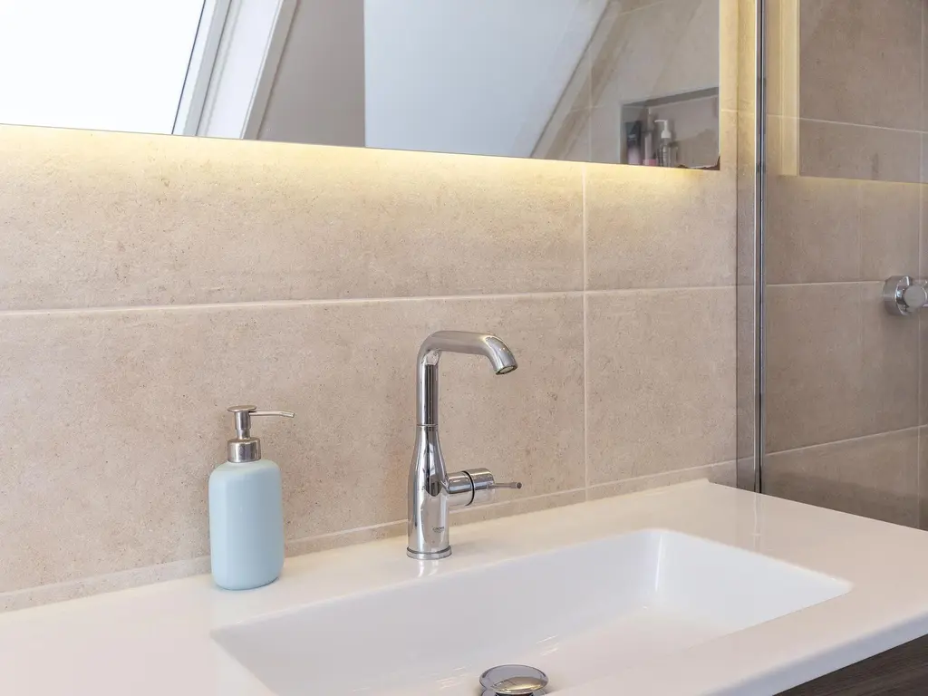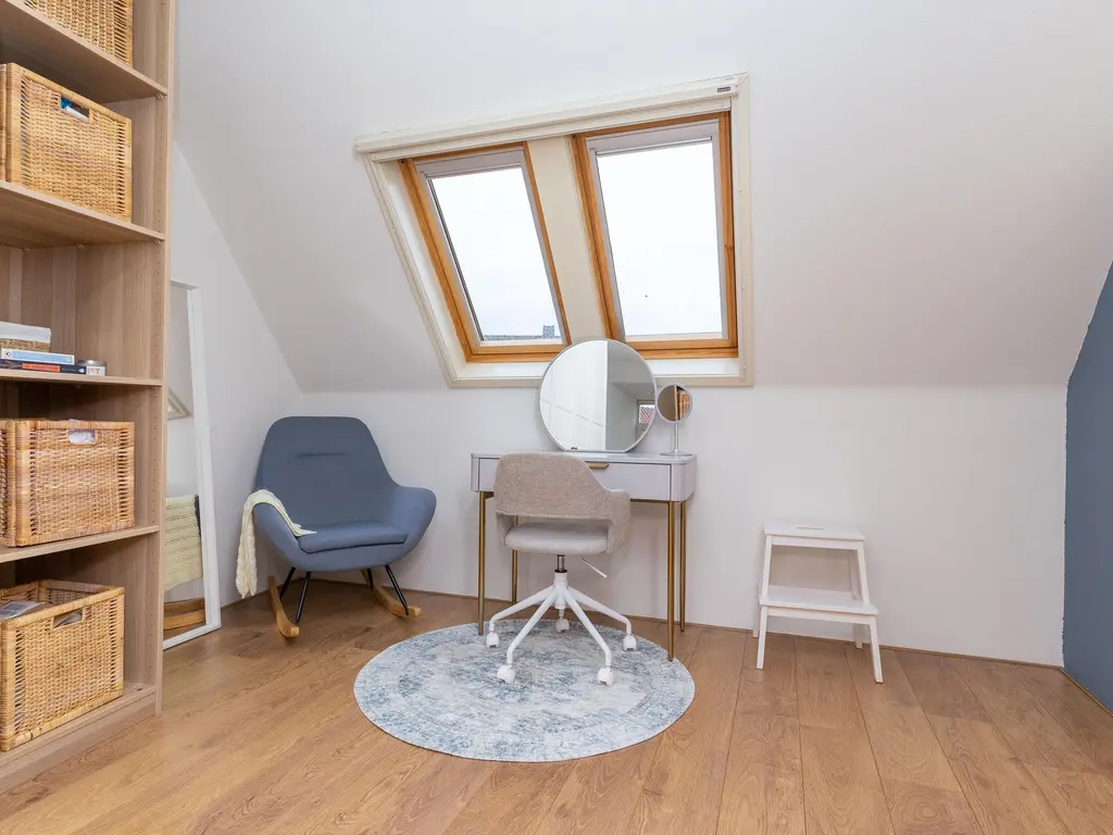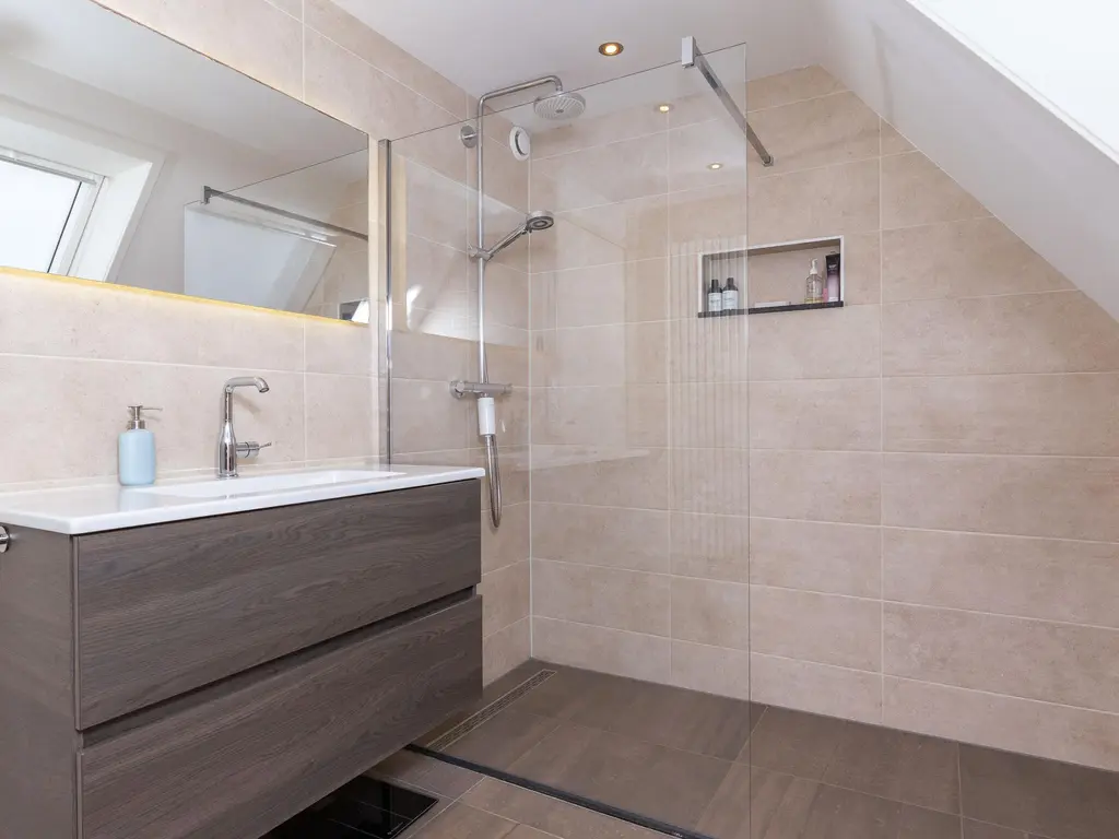 De overloop biedt toegang tot vier ruime slaapkamers, waaronder een ‘master bedroom’ over de volledige diepte van de woning. De badkamer is modern en stijlvol met inloopdouche, rainshower, toilet, wastafel en dakraam. Naast de grootste kamer zijn er twee slaapkamers aan de achterzijde gesitueerd en nog een vierde aan de voorzijde, welke toegang biedt tot het balkon aan de voorzijde van de woning.