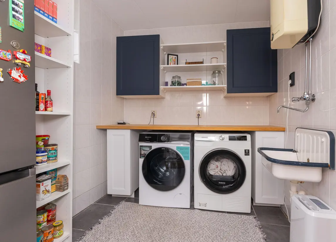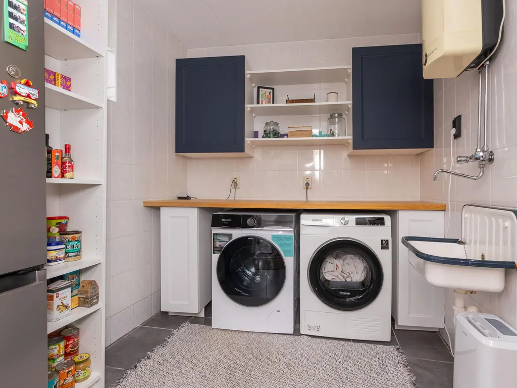 De aangebouwde stenen garage is een ideale plek voor opslag en beschikt over een extra kamer, welke dient als wasruimte.