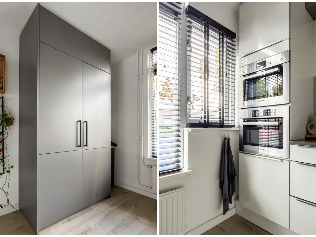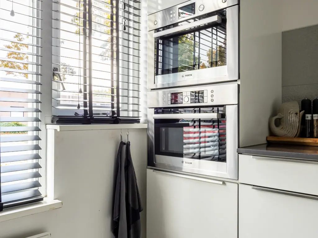 Aan de voorzijde bevindt zich de open keuken in hoekopstelling, voorzien van diverse inbouwapparatuur, waaronder een gaskookplaat, afzuigkap, oven, combimagnetron, koel-vriescombinatie en vaatwasser. Een fijne plek voor wie graag kookt en toch in contact wil blijven met de rest van het gezin of gasten.