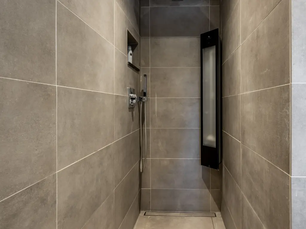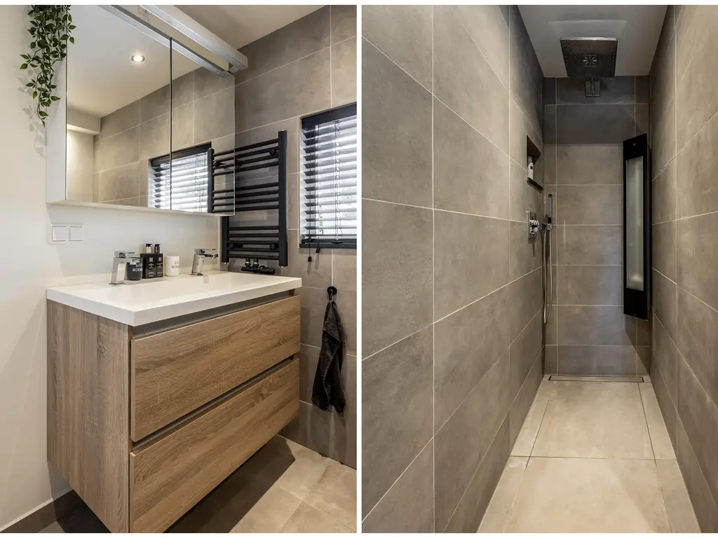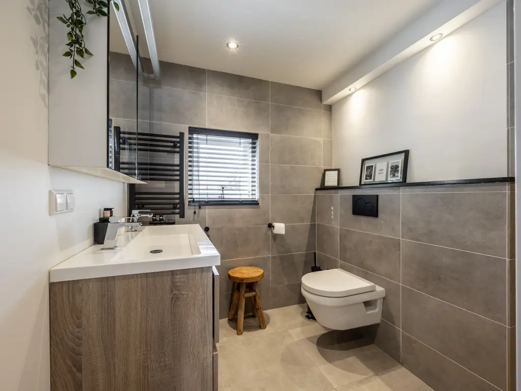 De moderne badkamer is uitgerust met een inloopdouche, wastafelmeubel en een tweede toilet. De lichte kleurstelling en strakke afwerking maken het een frisse en eigentijdse ruimte.