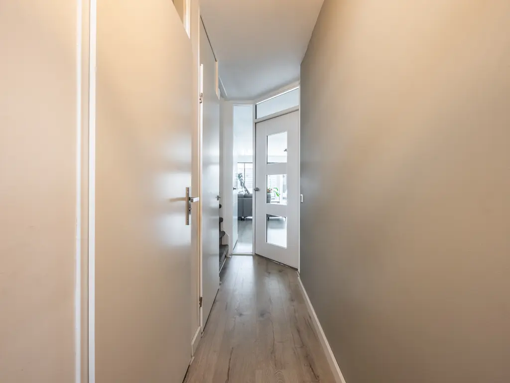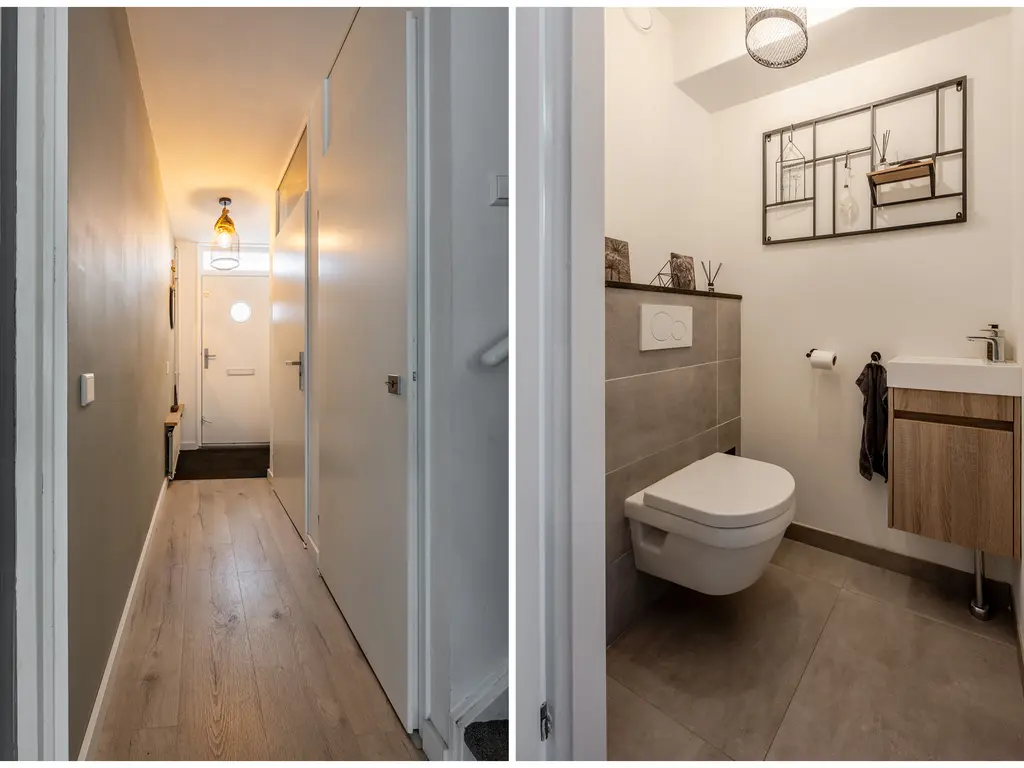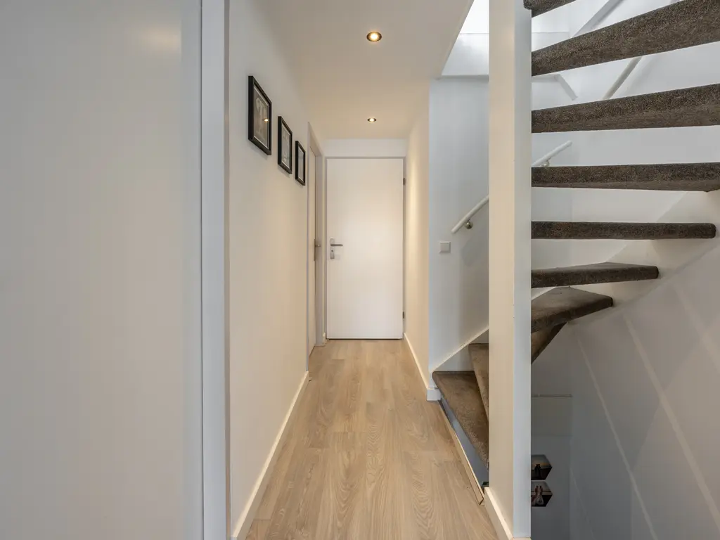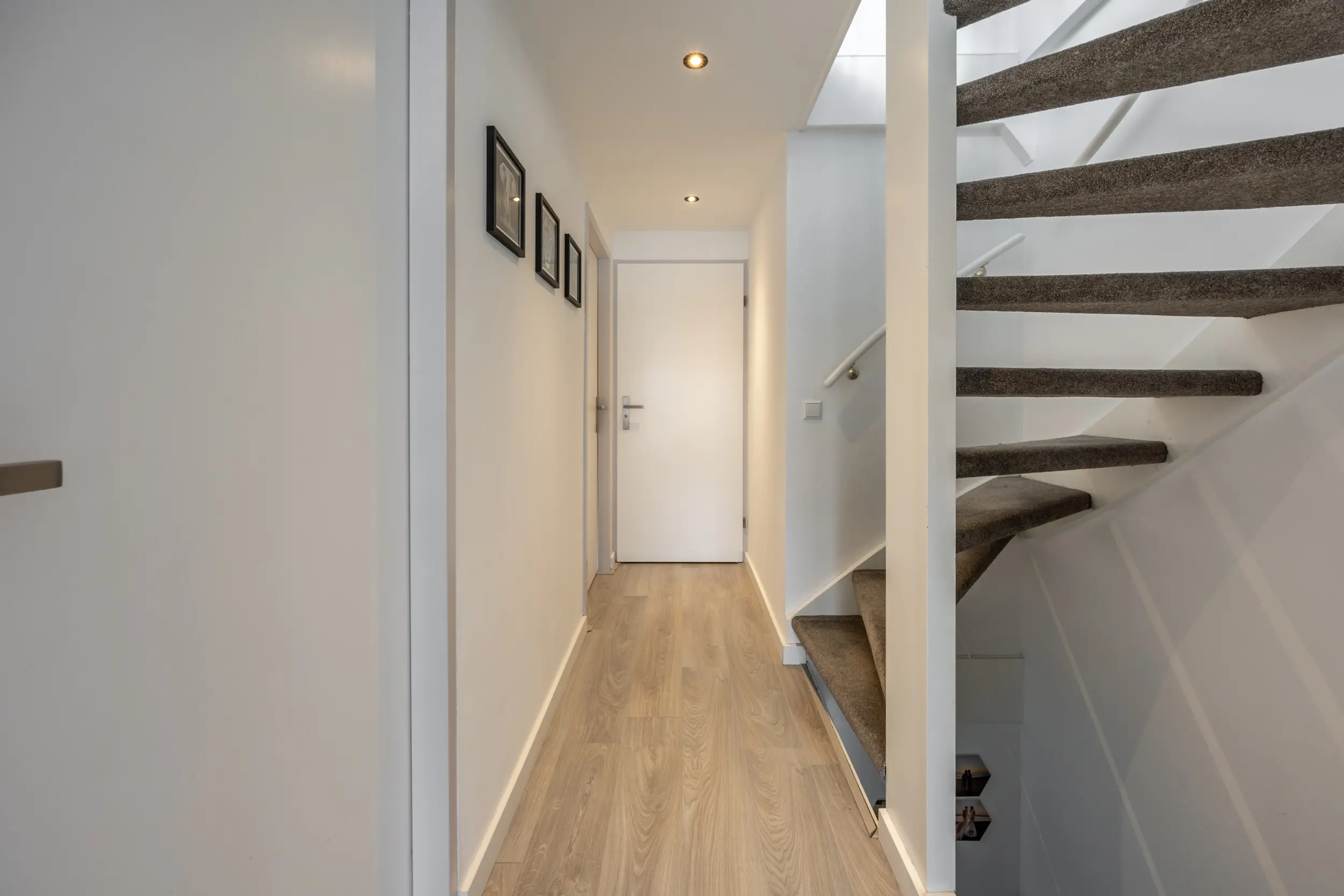 Bij binnenkomst via de voortuin word je in de hal verwelkomd door een prettige sfeer en een verzorgde afwerking. Hier bevinden zich de meterkast, de toiletruimte met fontein, een bergkast, de trapopgang en de toegang tot de woonkamer.