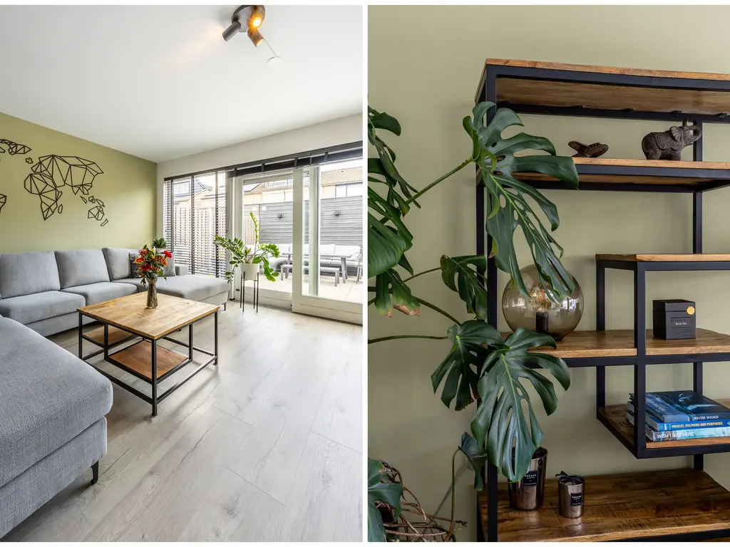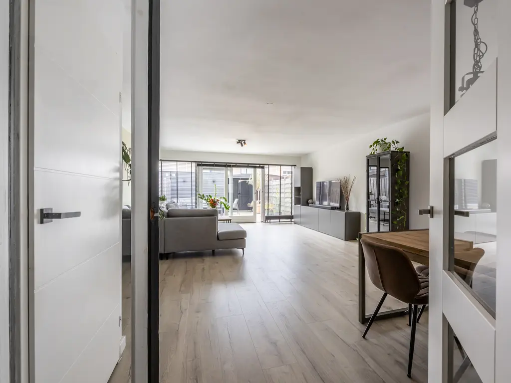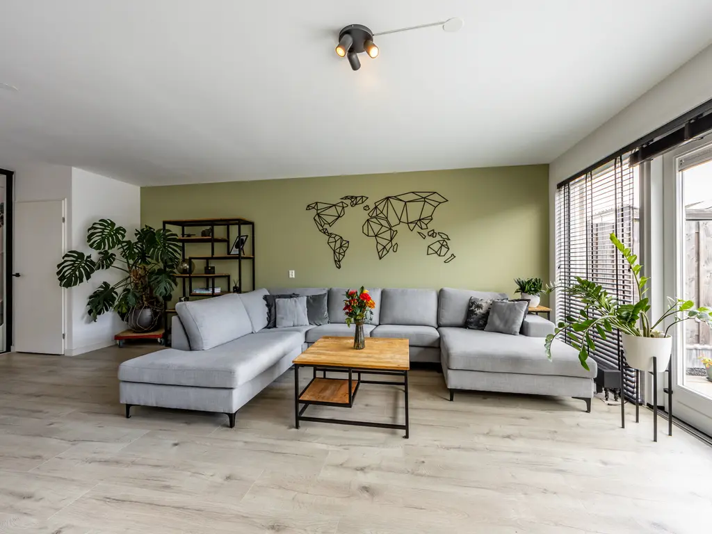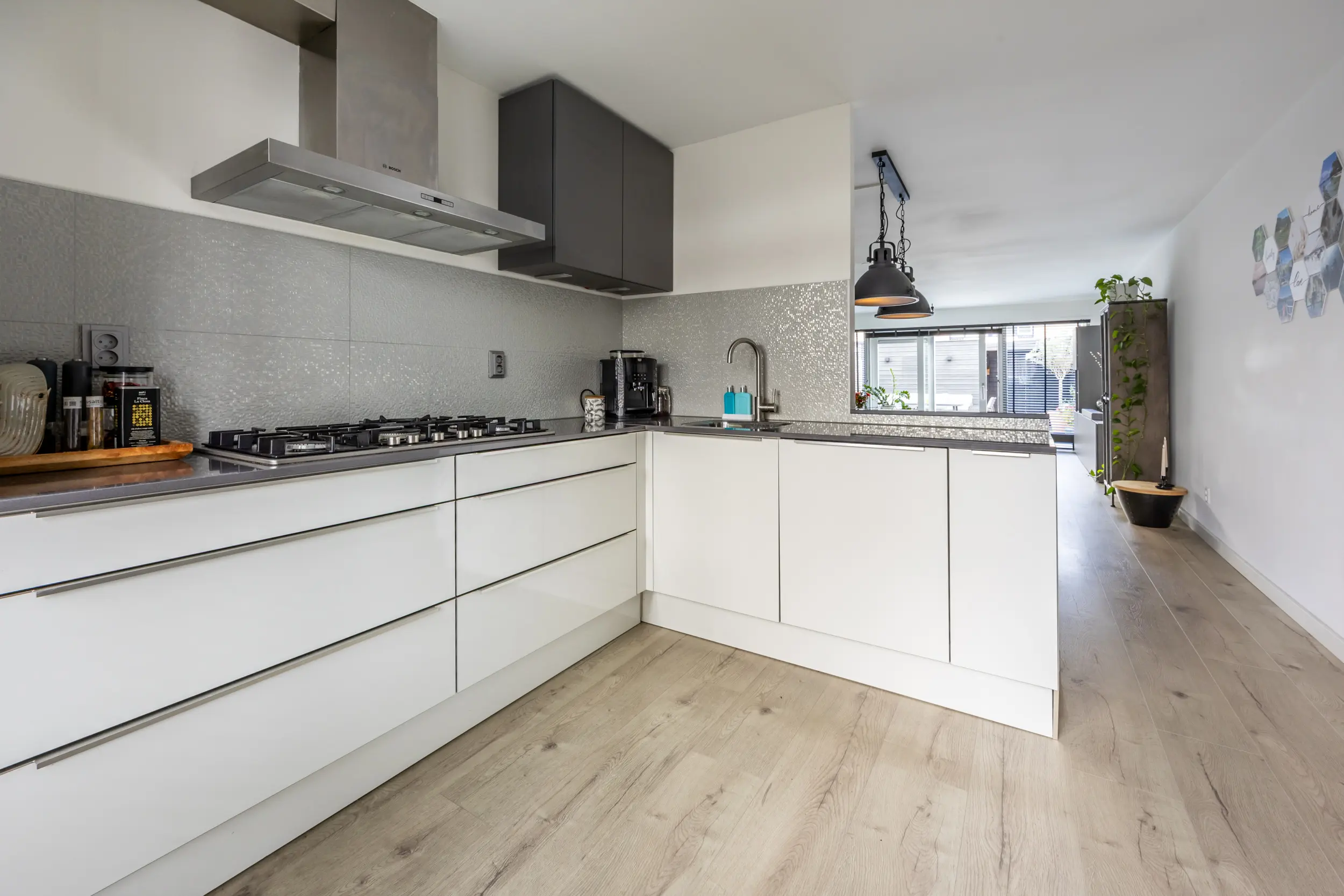 De tuingerichte en uitgebouwde woonkamer is voorzien van een laminaatvloer in lichte kleurstelling en behaaglijke vloerverwarming. De muren zijn strak gestuct in neutrale tinten en de grote raampartijen zorgen voor veel natuurlijk licht. De indeling is praktisch, met voldoende ruimte voor een royale zithoek en een eethoek. De schuifpui aan de achterzijde zorgt voor een mooie verbinding met de tuin – ideaal tijdens zomerse dagen wanneer binnen en buiten in elkaar overlopen.