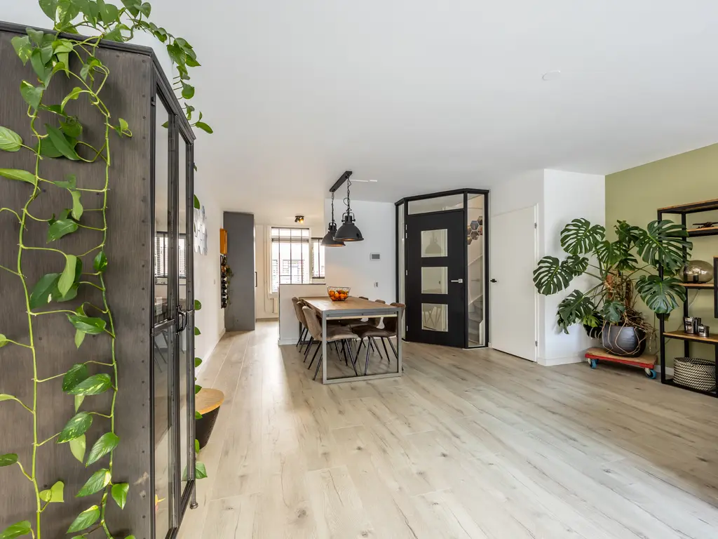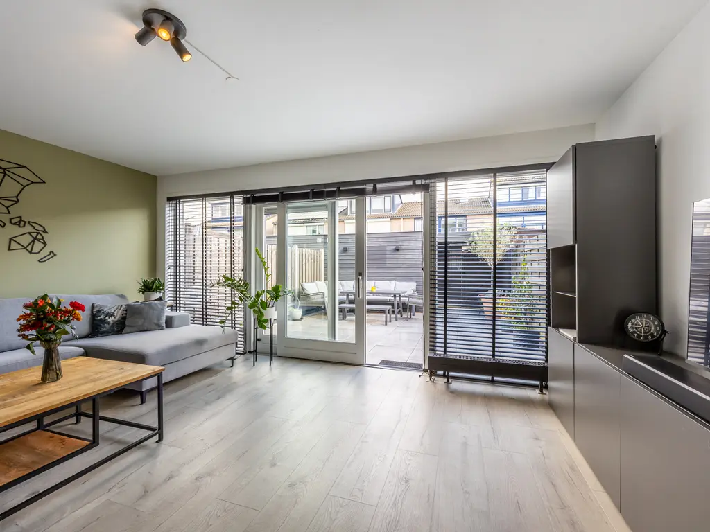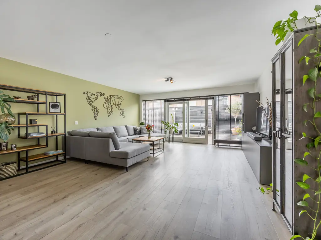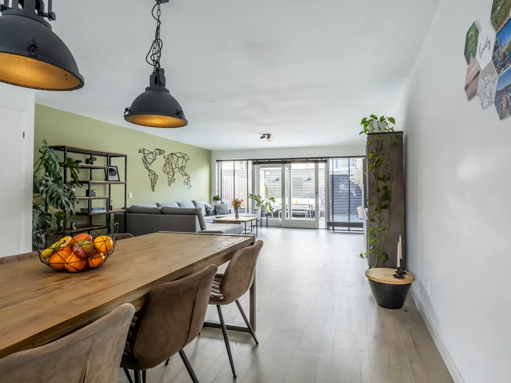 De tuingerichte en uitgebouwde woonkamer is voorzien van een laminaatvloer in lichte kleurstelling en behaaglijke vloerverwarming. De muren zijn strak gestuct in neutrale tinten en de grote raampartijen zorgen voor veel natuurlijk licht. De indeling is praktisch, met voldoende ruimte voor een royale zithoek en een eethoek. De schuifpui aan de achterzijde zorgt voor een mooie verbinding met de tuin – ideaal tijdens zomerse dagen wanneer binnen en buiten in elkaar overlopen.
