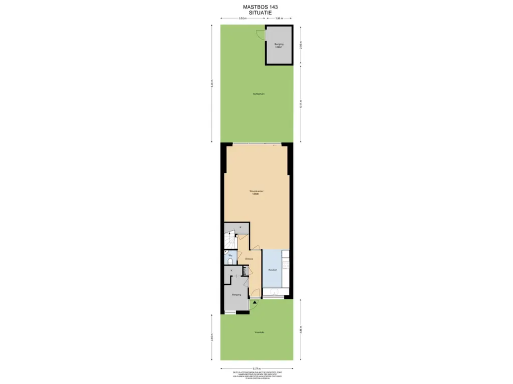 Woonkamer met grote schuifpui, toegang tot de ruime achtertuin incliuisef externe berging, en open keuken.