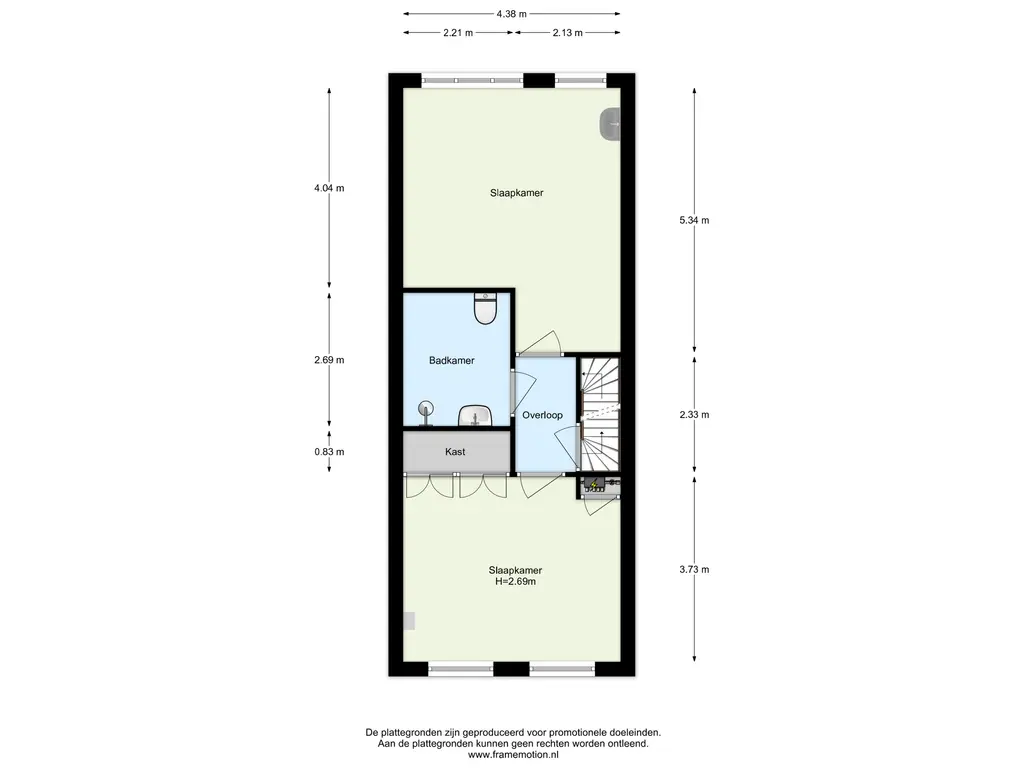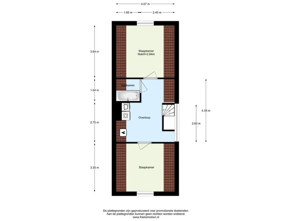 Hier bevinden zich wederom twee ruime slaapkamers en een kleine badkamer. De wasmachine aansluiting bevindt zich op de overloop.