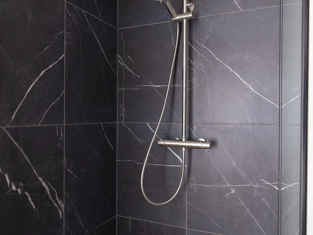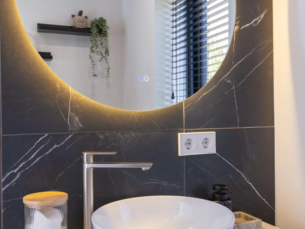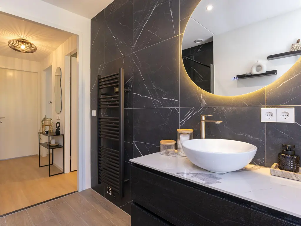 De badkamer biedt wederom een keurige afwerking. Voorzien van een ruime inloopdouche met rainshower, tweede toilet, modern wastafelmeubel, spiegel, mechanische en natuurlijke ventilatie, chique wandtegels en een stijlvolle handdoekradiator.