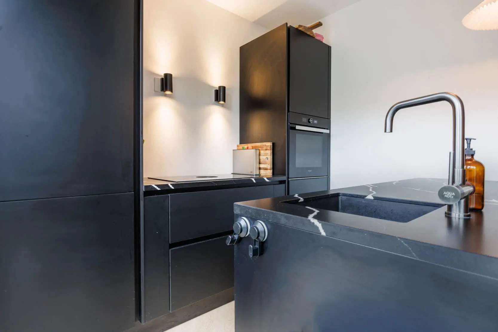 Entree, hal met meterkast en trapopgang naar de eerste verdieping. Vanuit de hal krijg je toegang tot de ruime en lichte woonkamer met pvc-vloer met vloerverwarming en openslaande deuren naar de zonnige achtertuin. De moderne keuken is voorzien van een prachtig kookeiland met spoelbak, een inductiekookplaat met geïntegreerde afzuigkap, een koel-vriescombinatie, een vaatwasser en een combi-oven. Aansluitend een modern separaat toilet. Tussen de woonkamer en de keuken is een extra hal (bijkeuken) gerealiseerd met een separaat toilet, een wasmachineaansluiting, een garderobe en een inbouwkast. Vanuit de keuken toegang tot de achtertuin met zeer ruime berging en achterom.