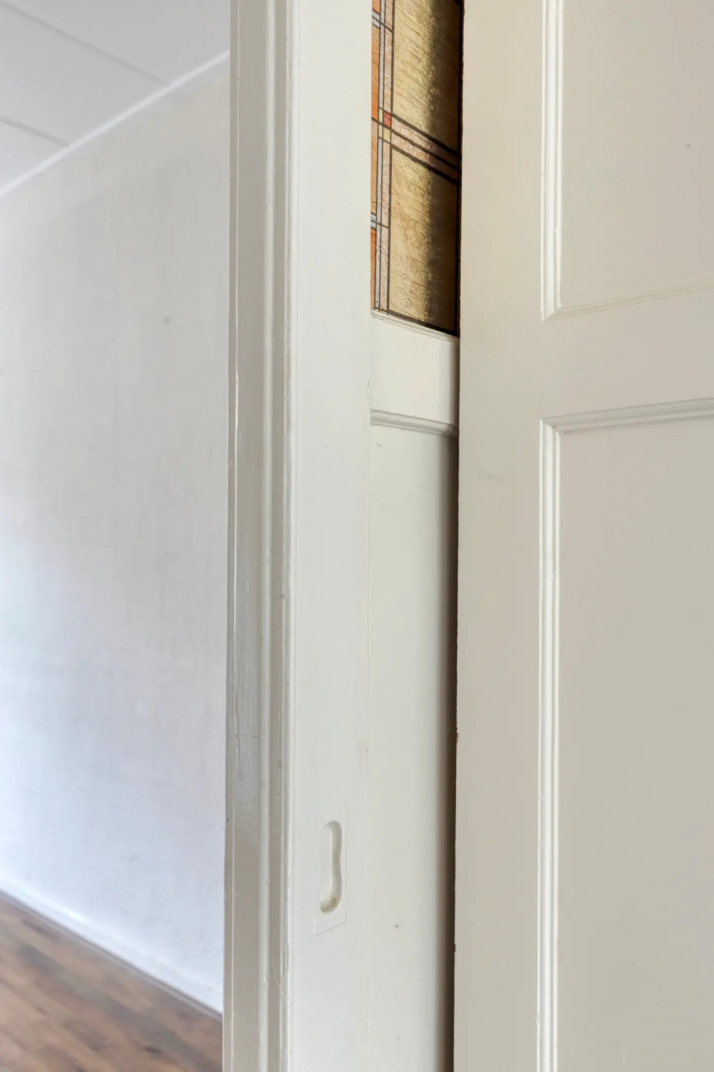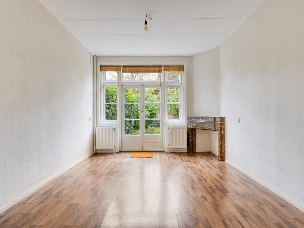 Entree met ruime vestibule en een hal met toegang tot de trapopgang, toilet en woonkamer. De ruime woonkamer heeft veel lichtinval dankzij de grote raampartijen en openslaande deuren naar de tuin. Authentieke details, zoals de schouwen, en suitedeuren en hoge plafonds, geven direct sfeer en karakter aan de woonkamer.