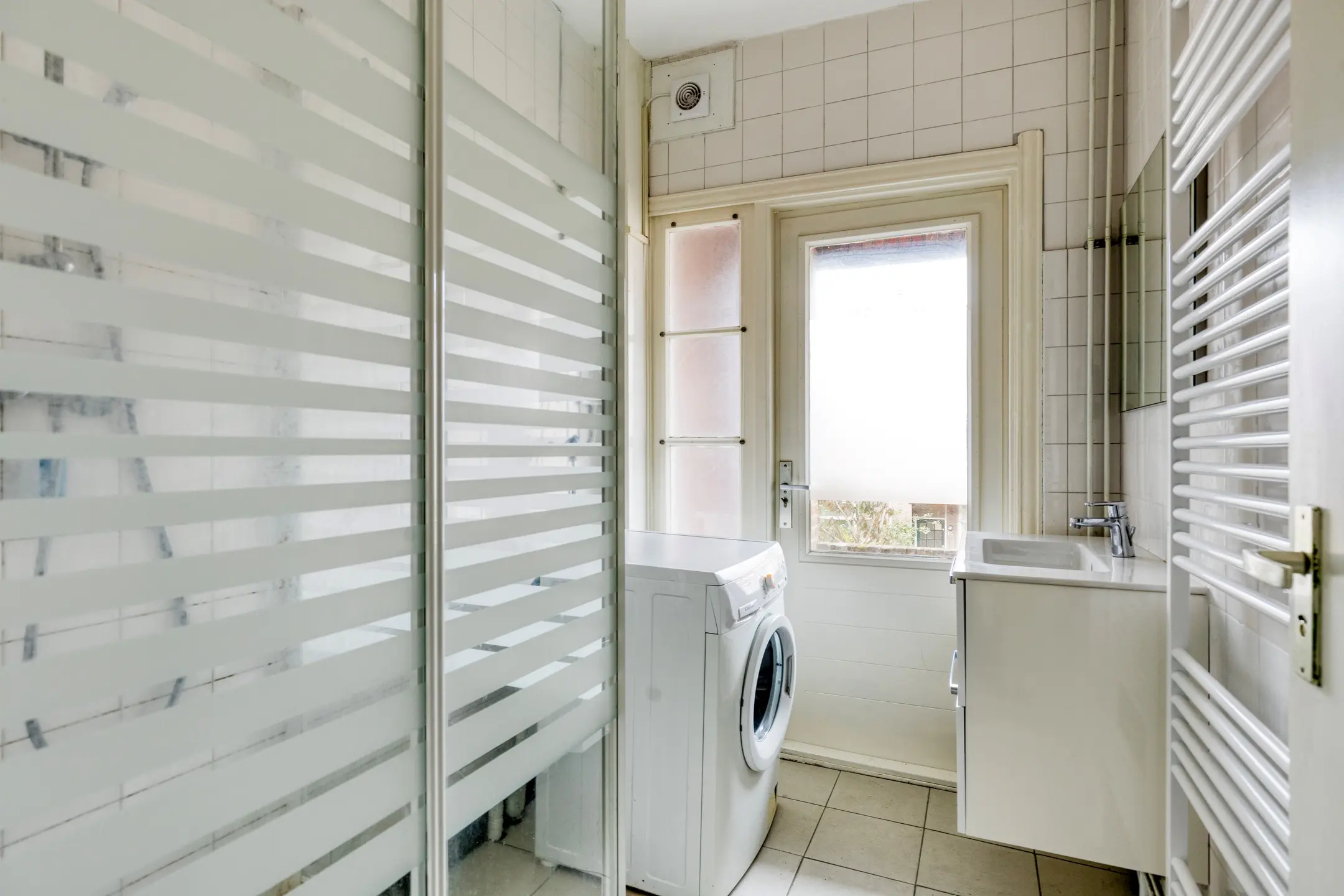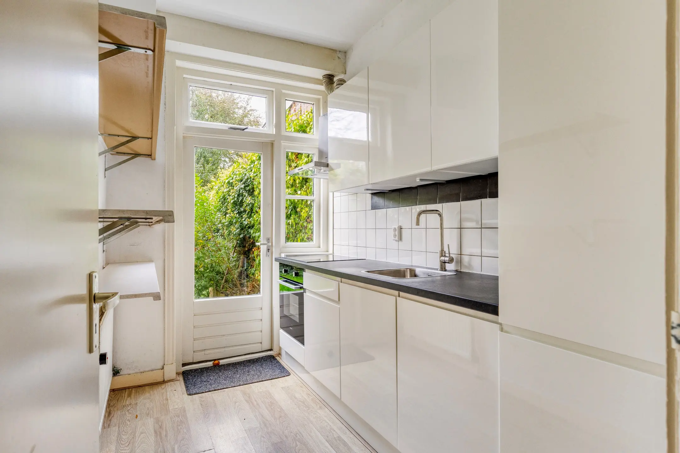Achter de woning ligt een fijne stadstuin met privacy en een externe berging (3 m²) voor fietsen en tuingereedschap.