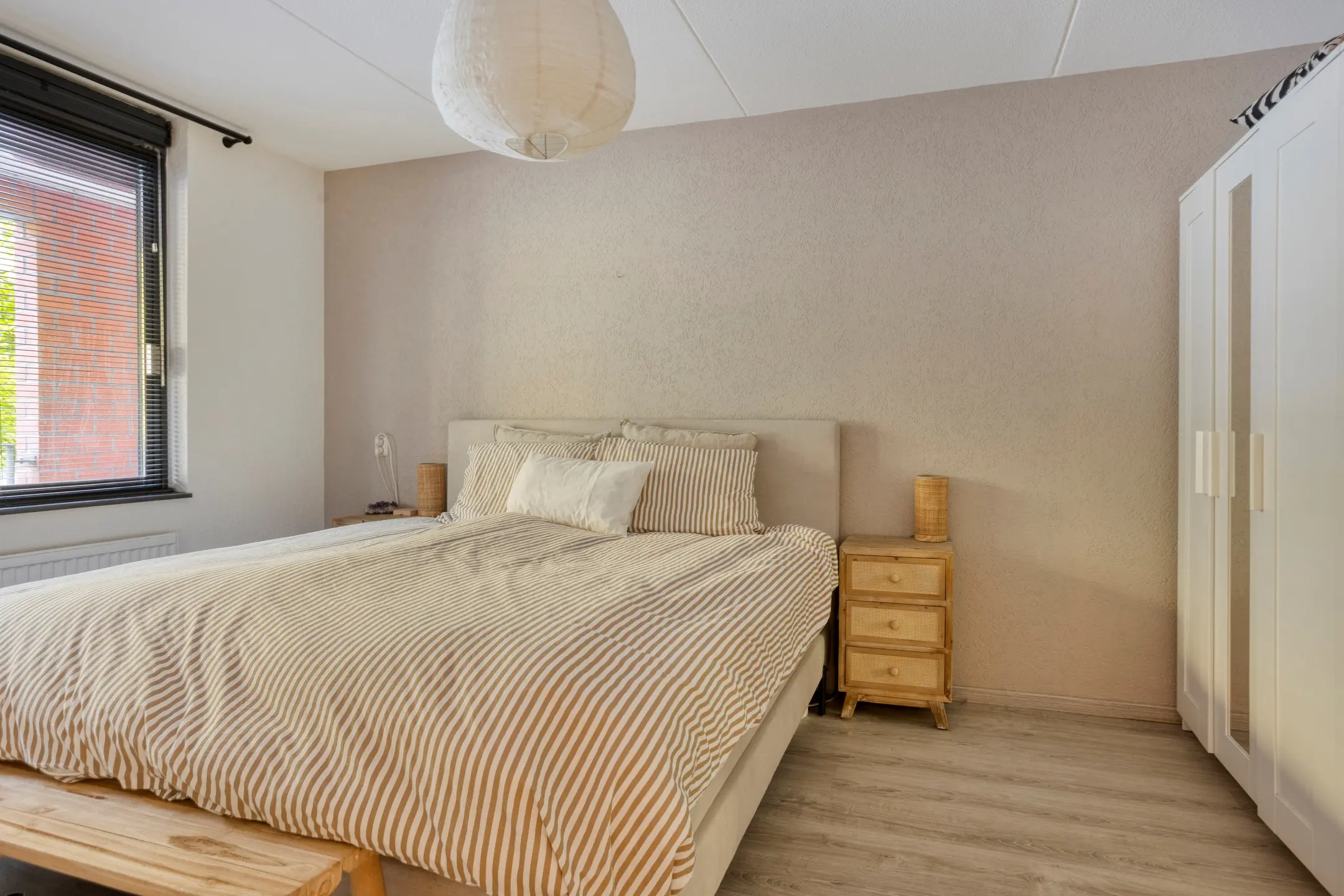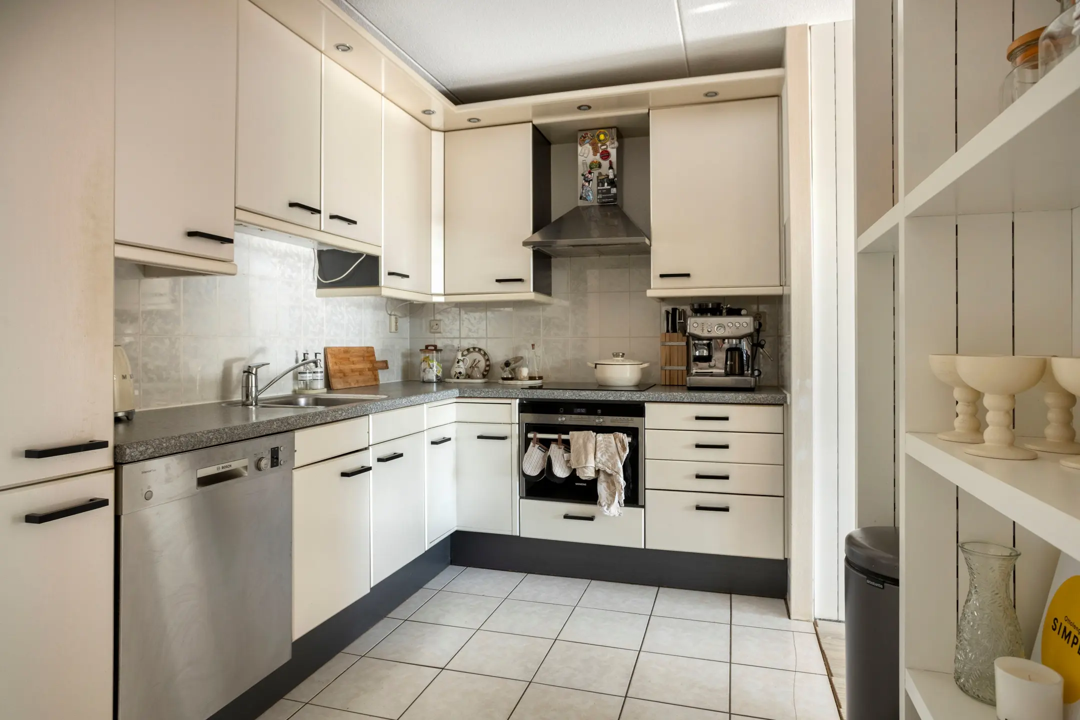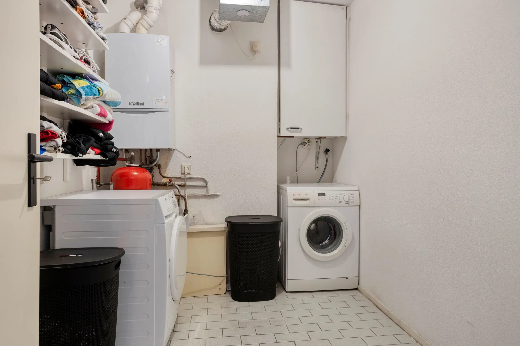 Bij binnenkomst treft u een ruime hal die toegang biedt tot twee slaapkamers aan de voorzijde, een badkamer voorzien van ligbad, douche en wastafel en een apart toilet met fonteintje. Daarnaast is er een praktische berging met aansluiting voor wasmachine en droger. De riante woonkamer met open keuken ligt aan de achterzijde van het appartement en beschikt over een dubbele schuifpui die direct toegang geeft tot het zonnige terras aan de achterzijde. Bovendien beschikt het appartement over een eigen berging om uw fietsen in te stallen.
