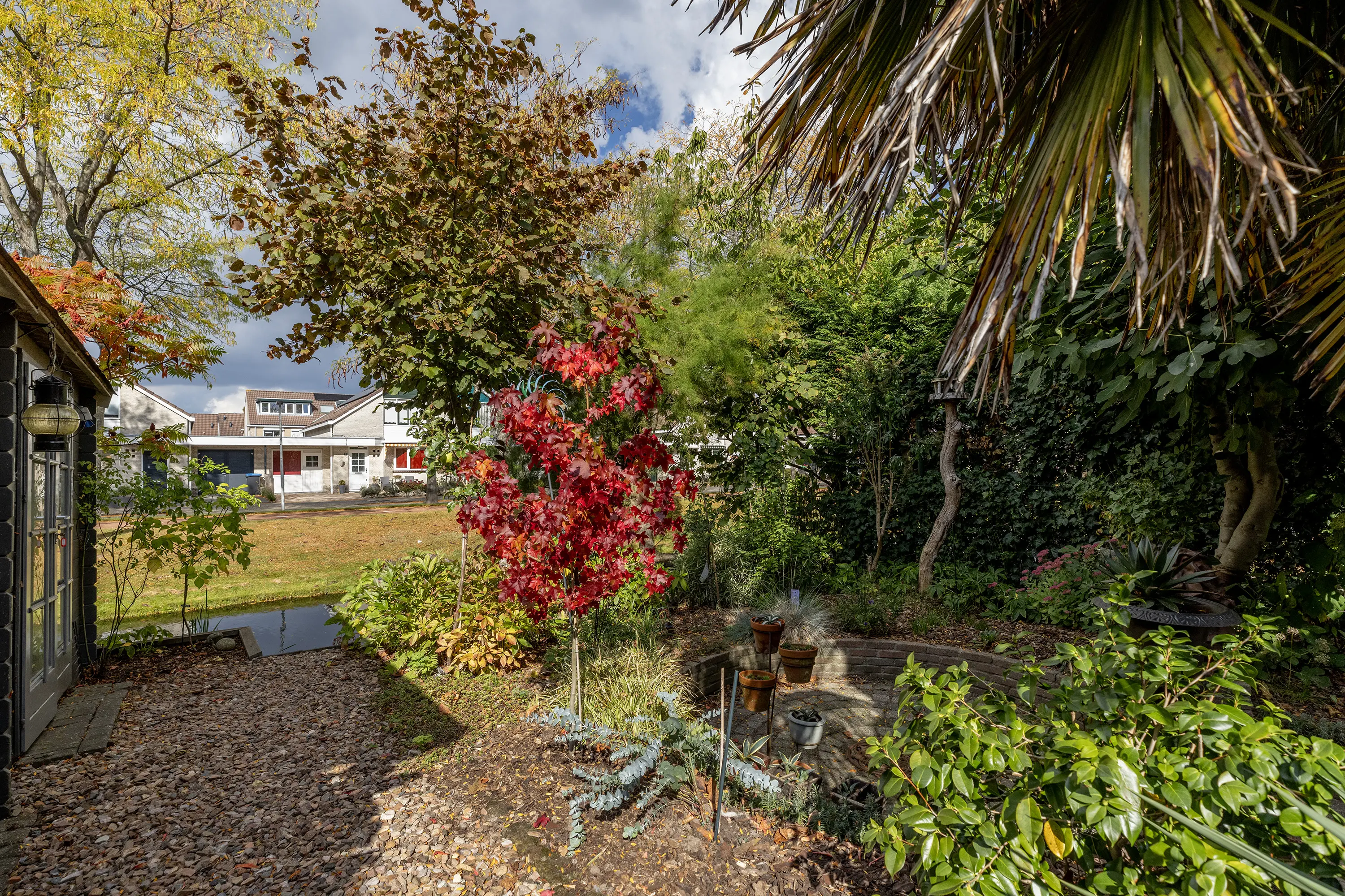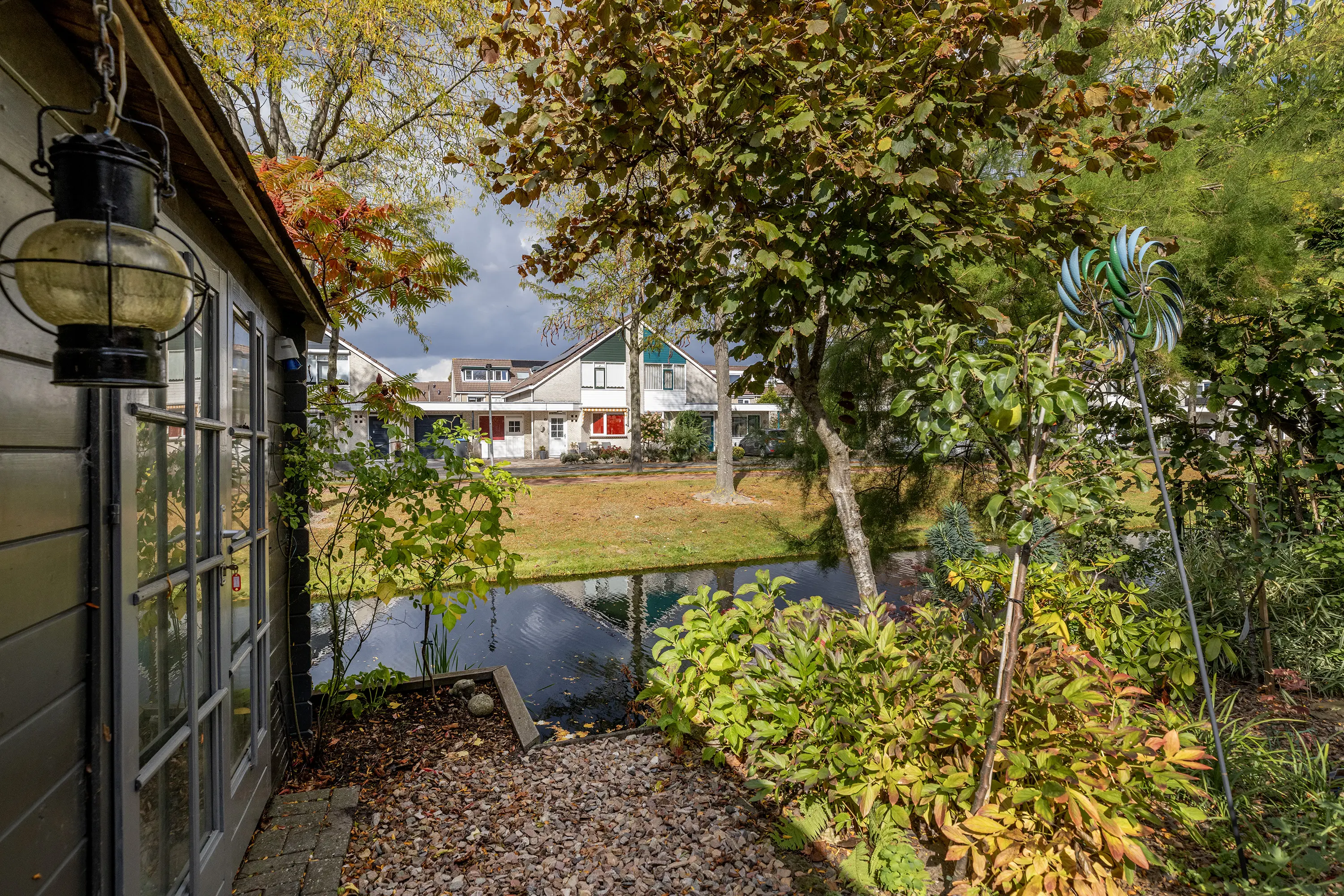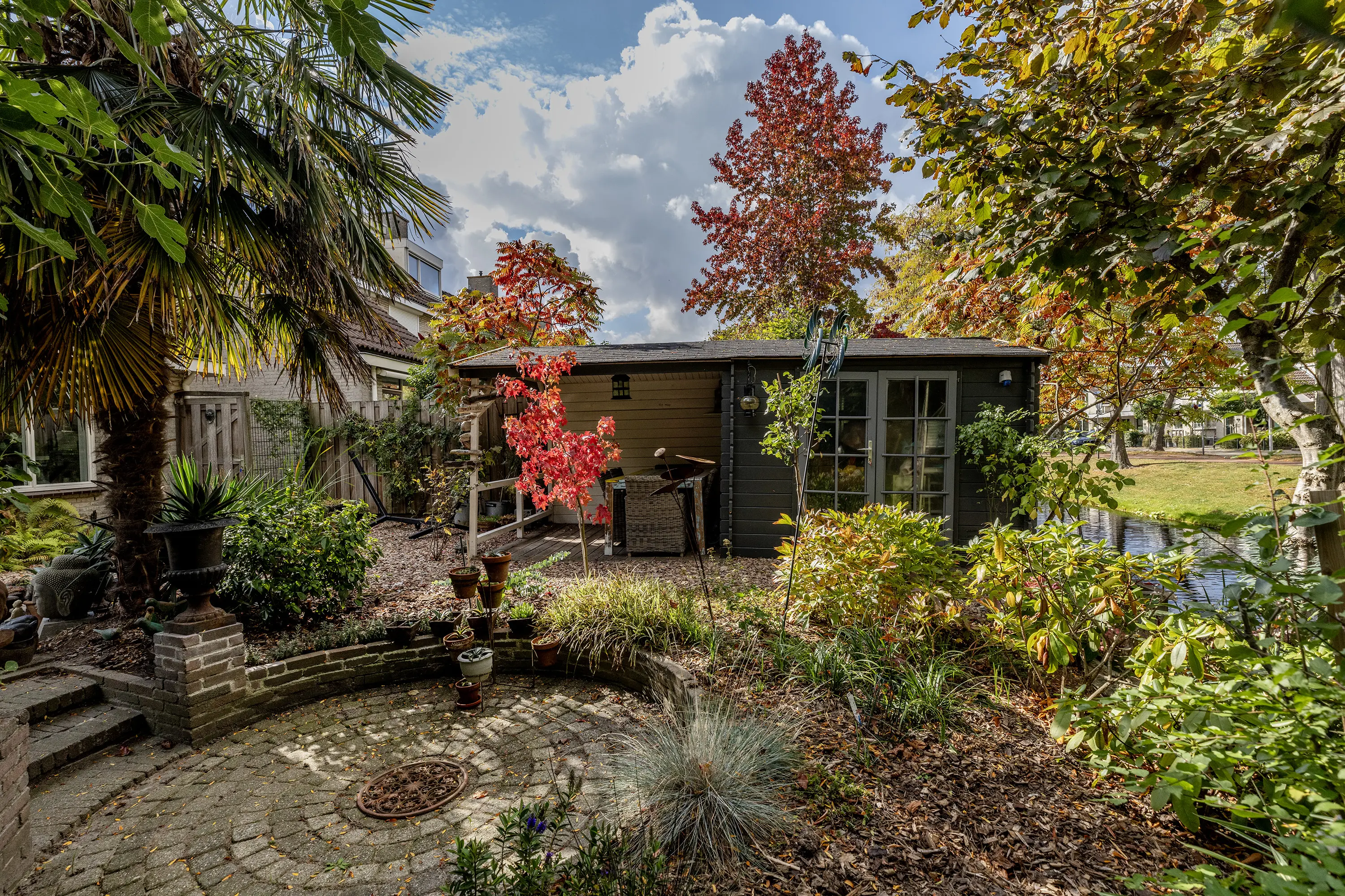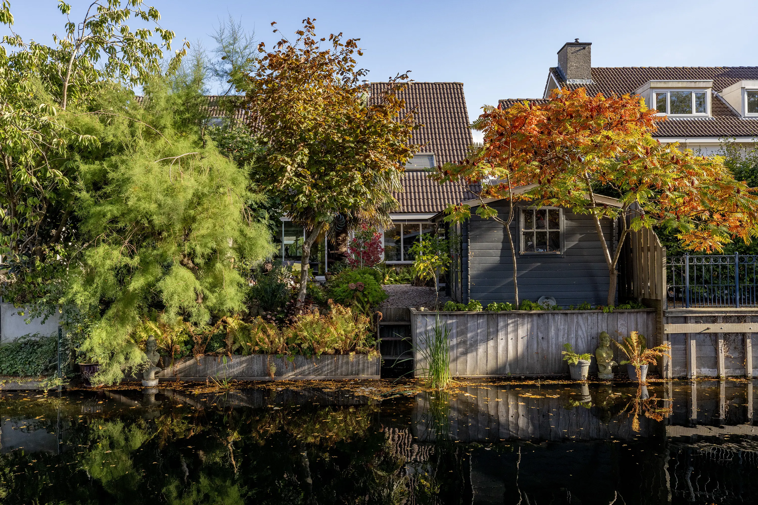 De sfeervolle achtertuin op het noordwesten is fraai aangelegd met diverse zitplekjes, veel groene beplanting en een houten berging met aangebouwde overkapping. Achterin de tuin bereikt u via een trappetje de vlonder aan het water, een heerlijke plek om te ontspannen met uitzicht over het water.