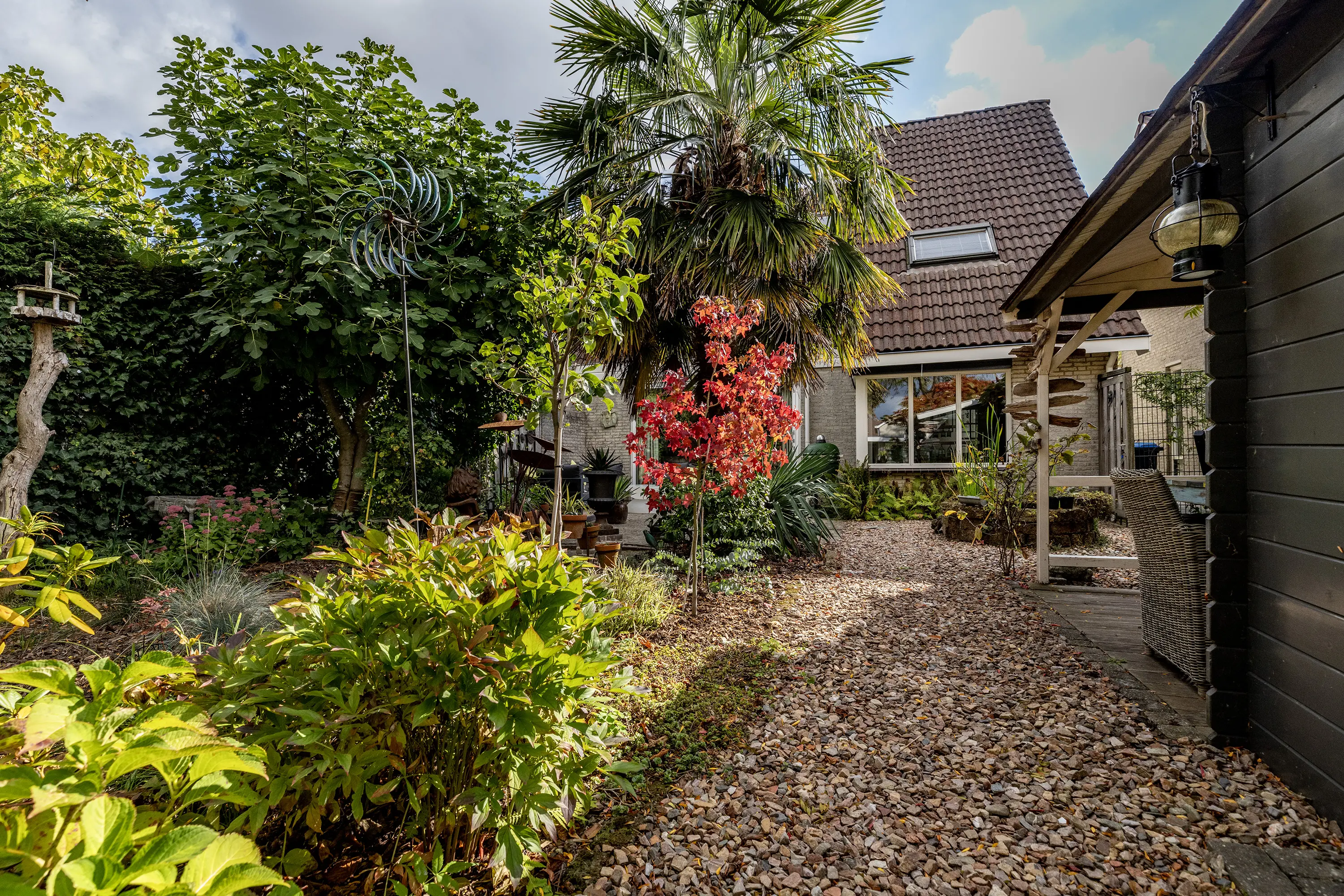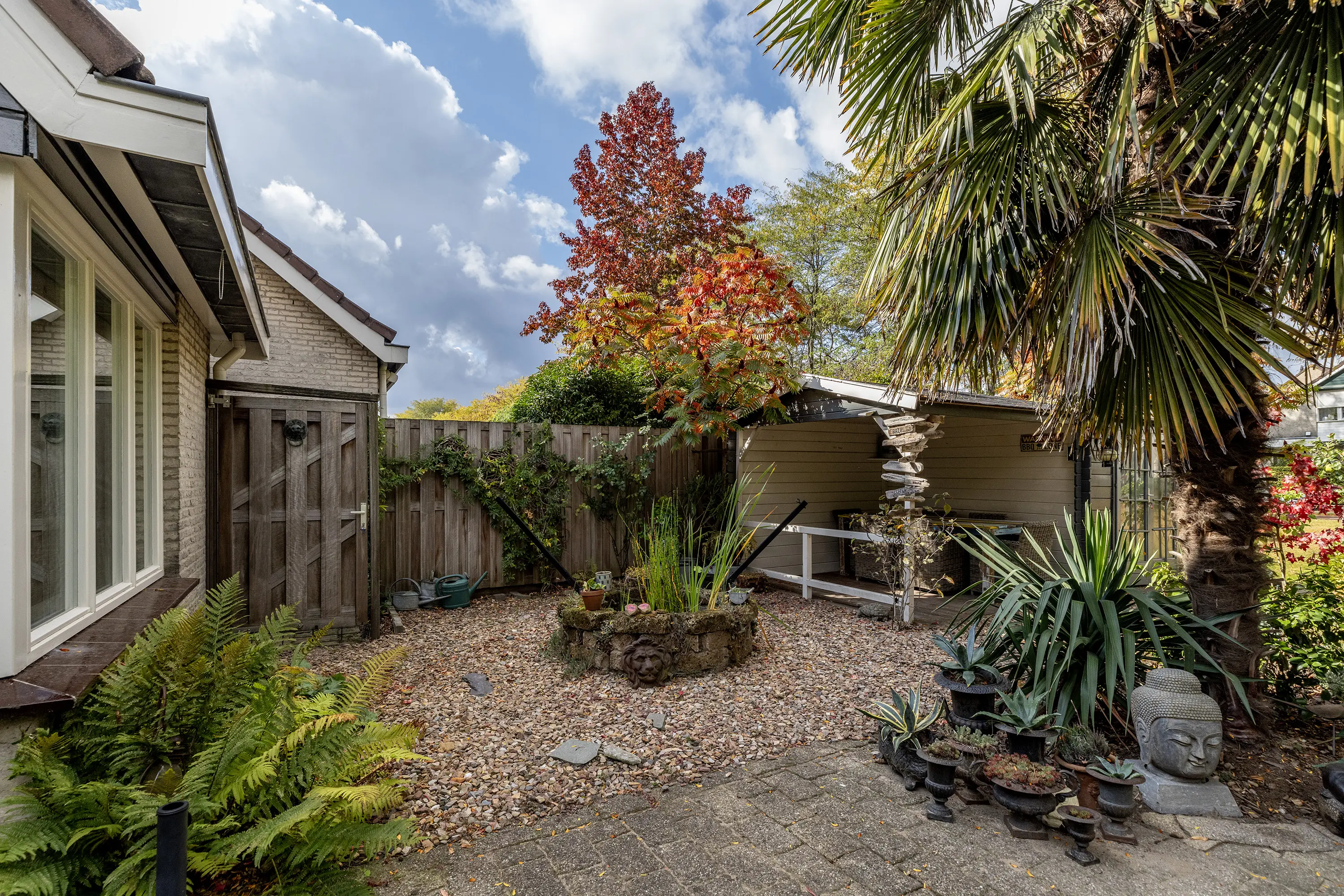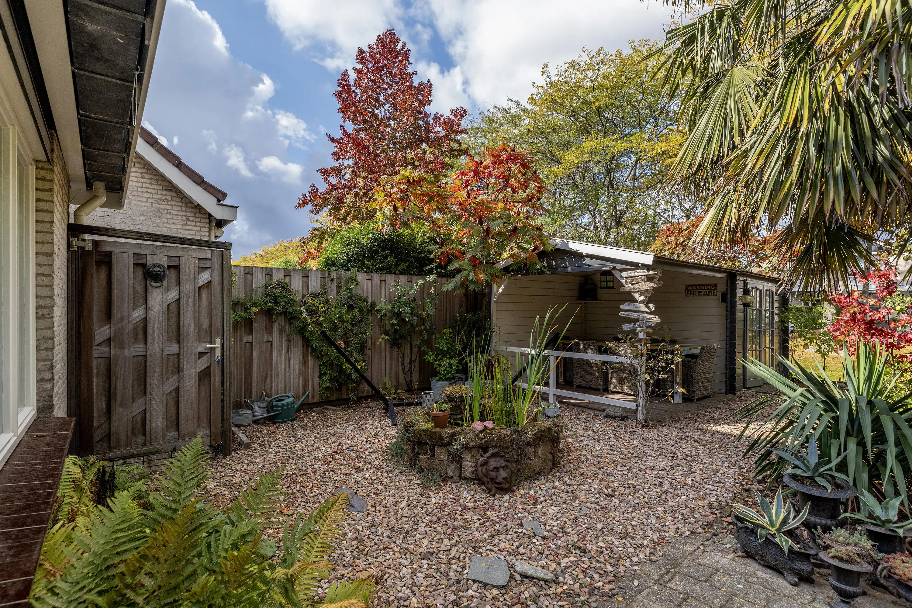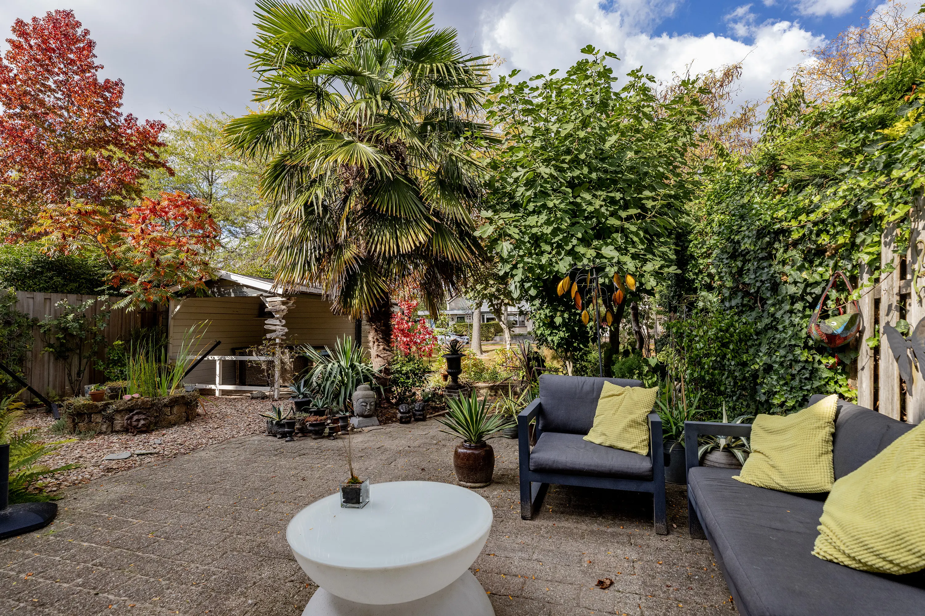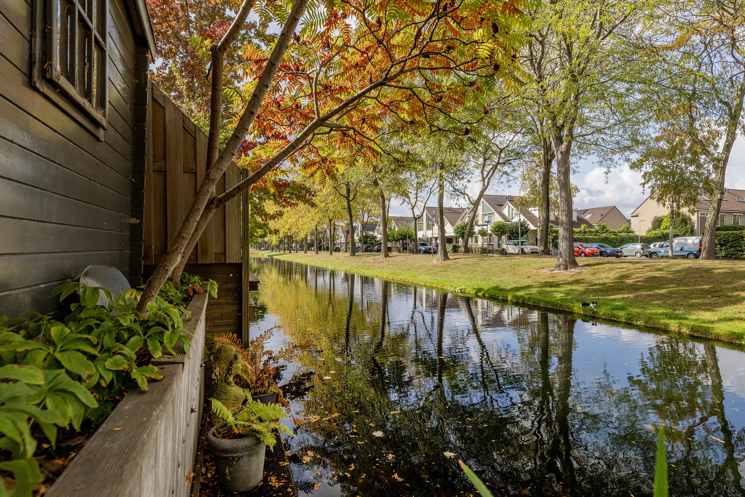 De sfeervolle achtertuin op het noordwesten is fraai aangelegd met diverse zitplekjes, veel groene beplanting en een houten berging met aangebouwde overkapping. Achterin de tuin bereikt u via een trappetje de vlonder aan het water, een heerlijke plek om te ontspannen met uitzicht over het water.