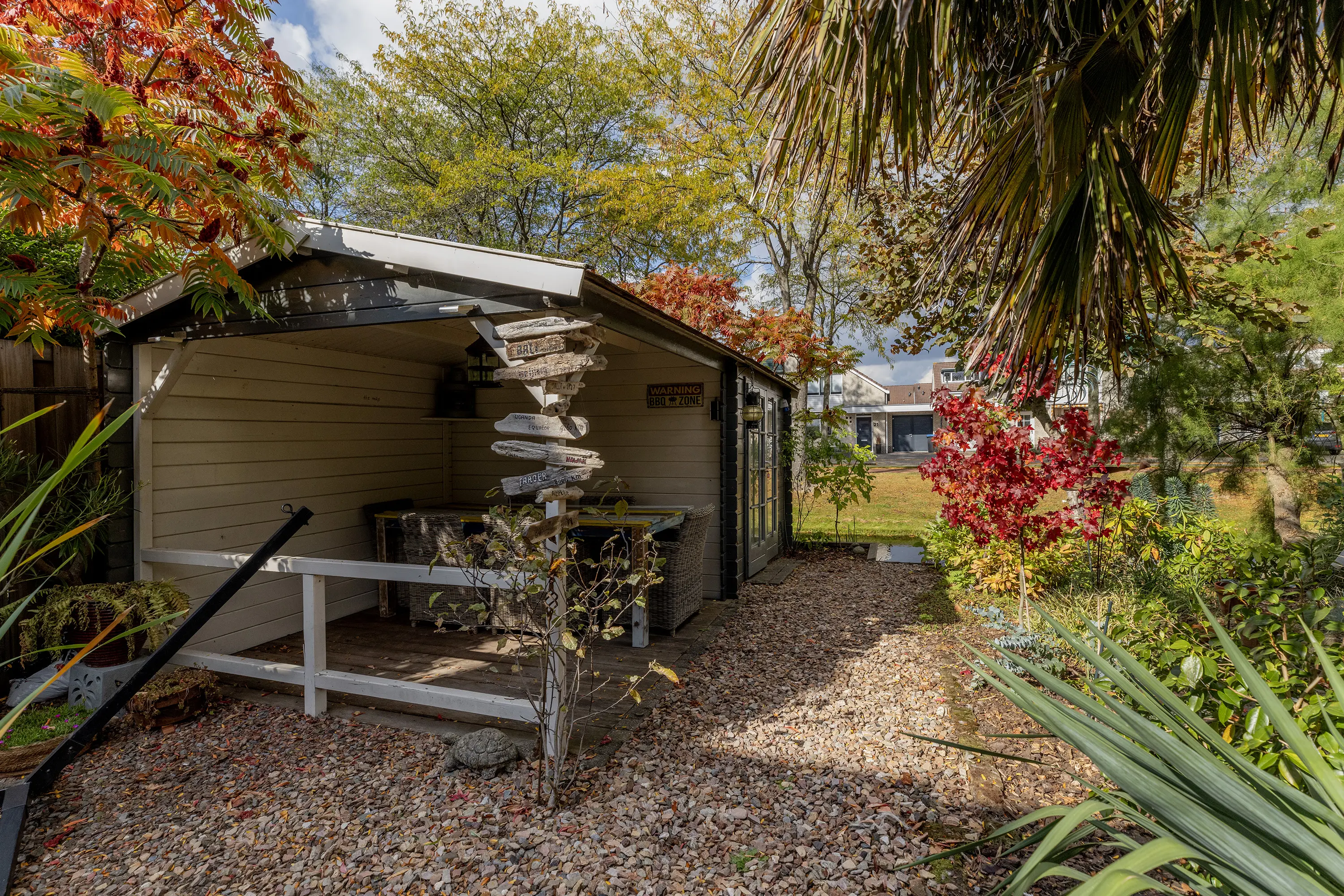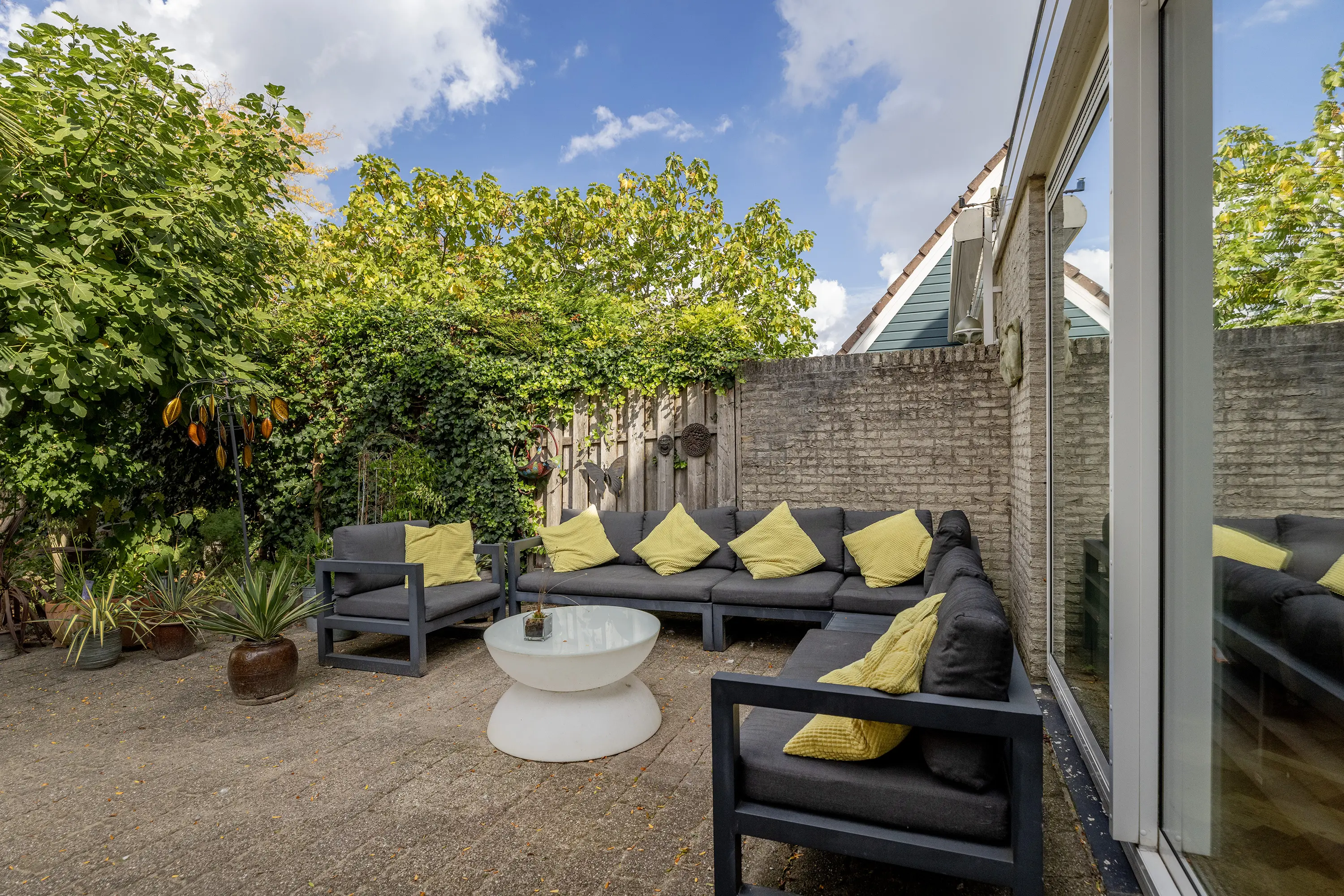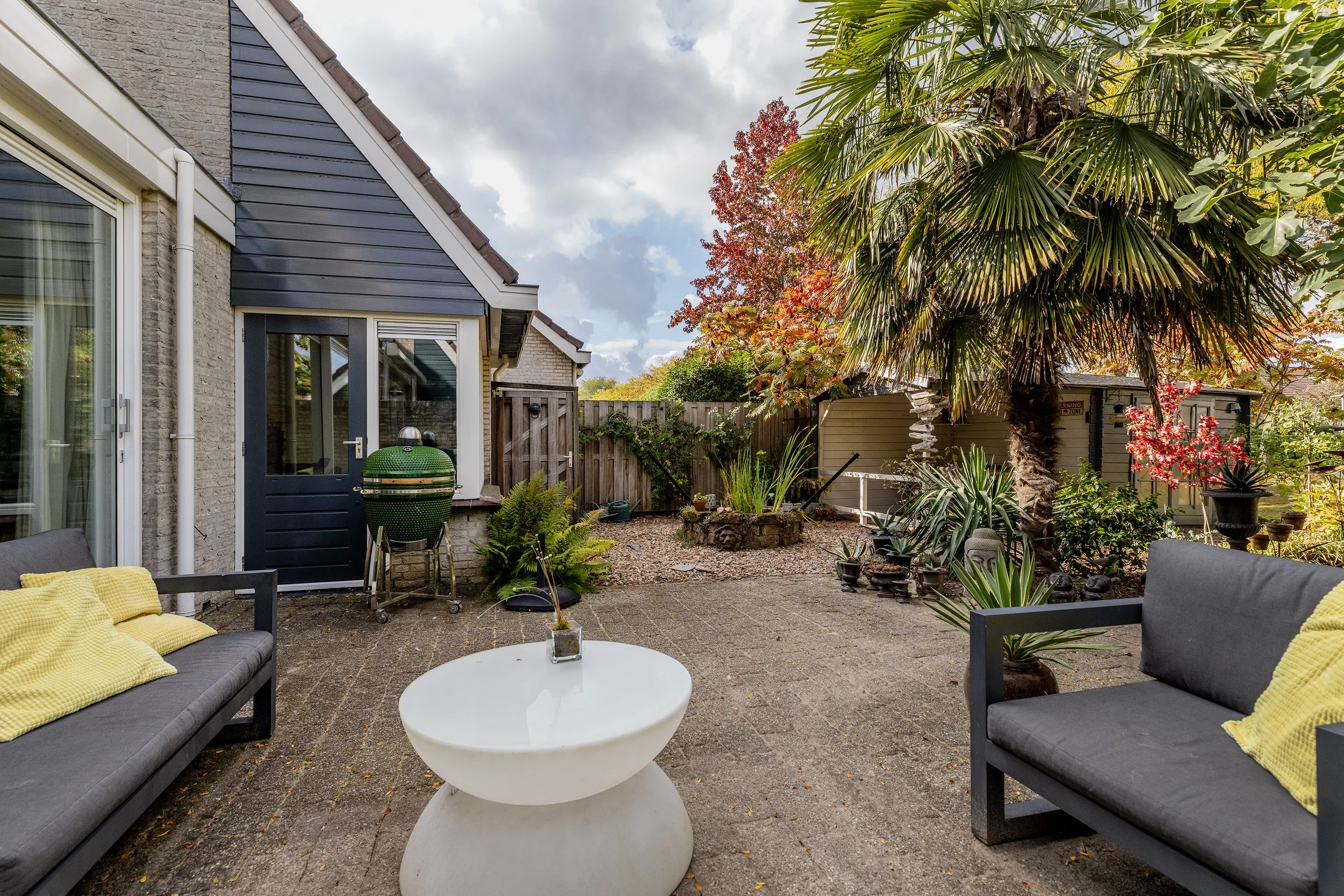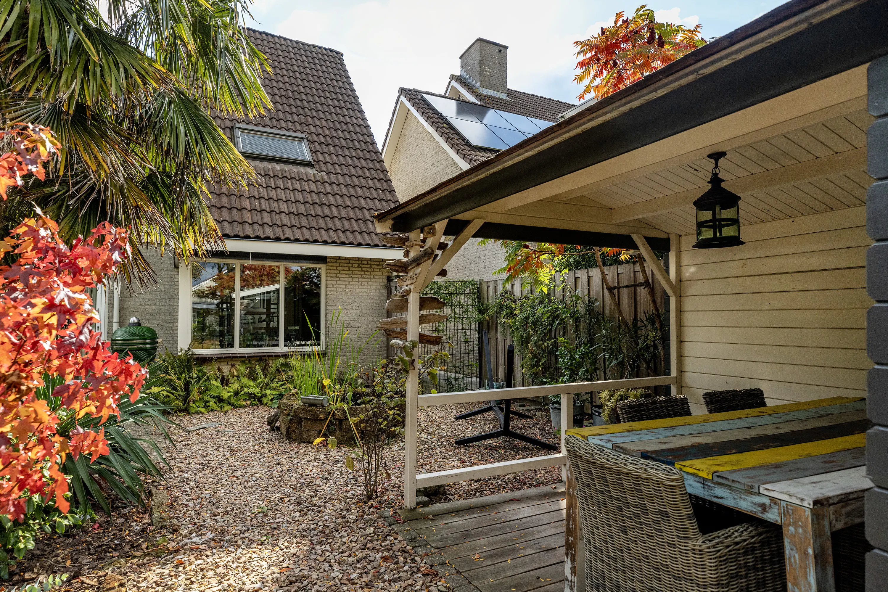 De sfeervolle achtertuin op het noordwesten is fraai aangelegd met diverse zitplekjes, veel groene beplanting en een houten berging met aangebouwde overkapping. Achterin de tuin bereikt u via een trappetje de vlonder aan het water, een heerlijke plek om te ontspannen met uitzicht over het water.