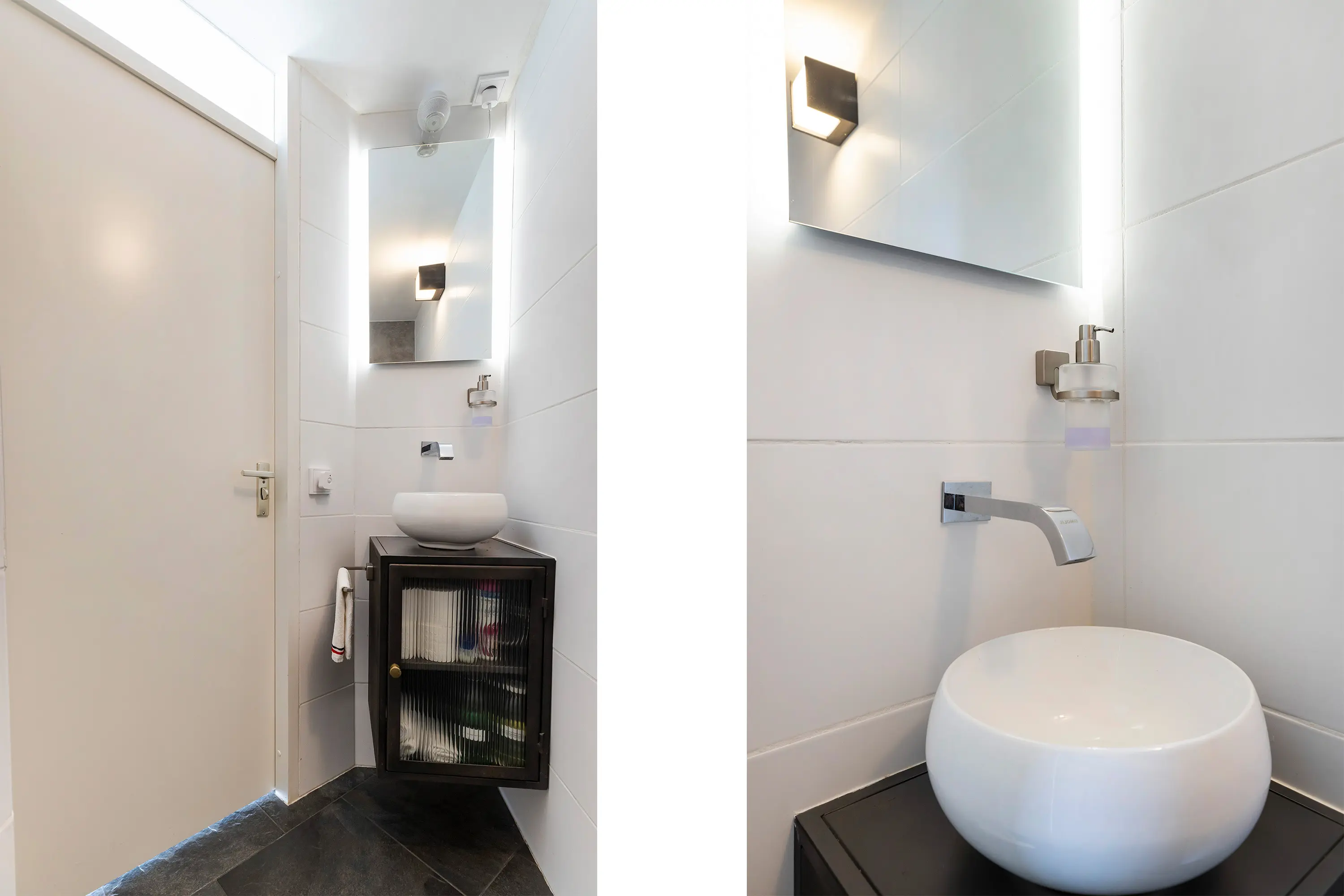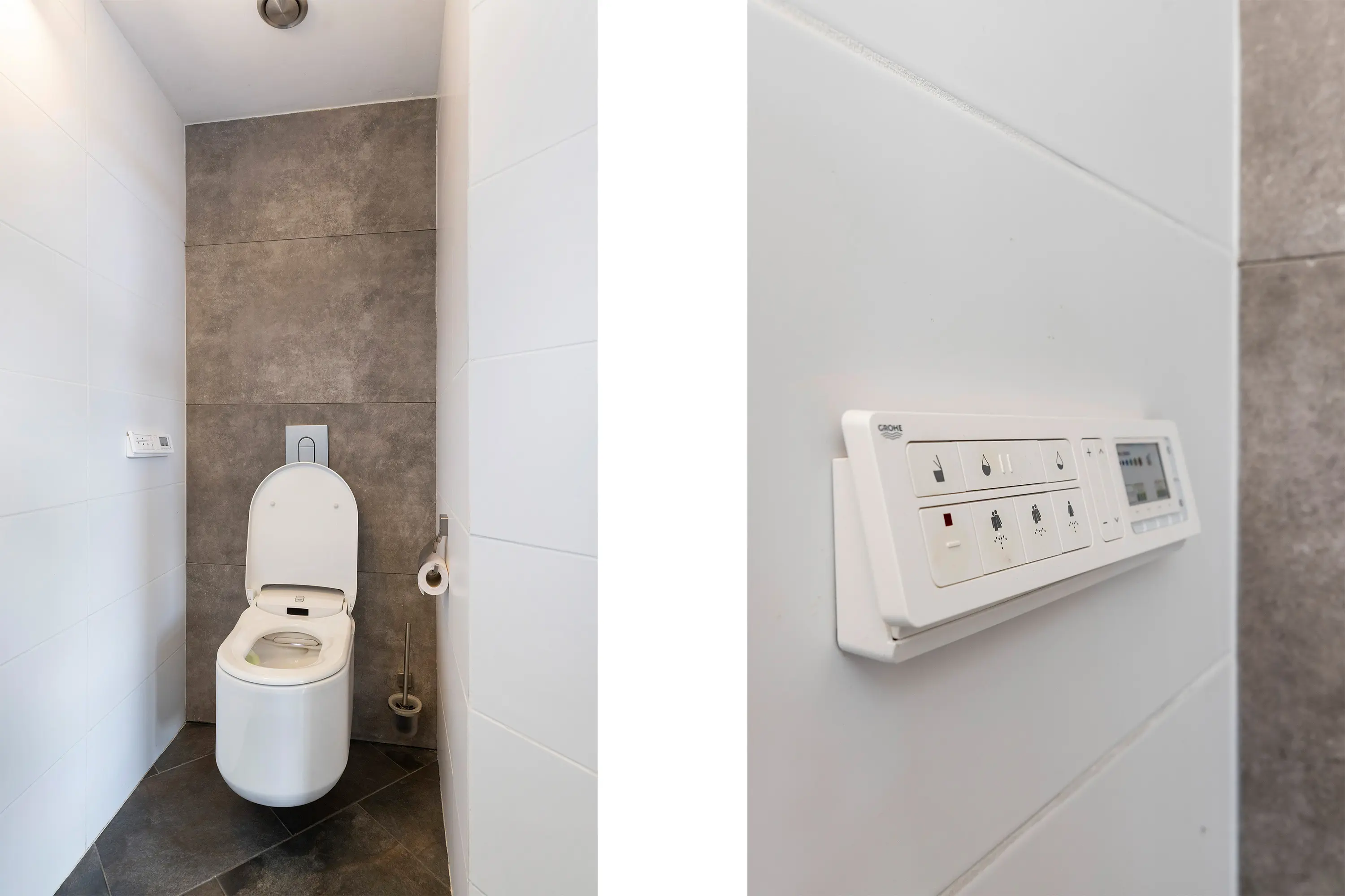 De hal is voorzien van een luxe toiletruimte met een modern hangend toilet inclusief ingebouwde bidetfunctie (met warm water en föhn) en een fonteintje met automatische kraan. Via een fraaie zwarte stalen paneeldeur met glas betreedt u de royale woonkamer.