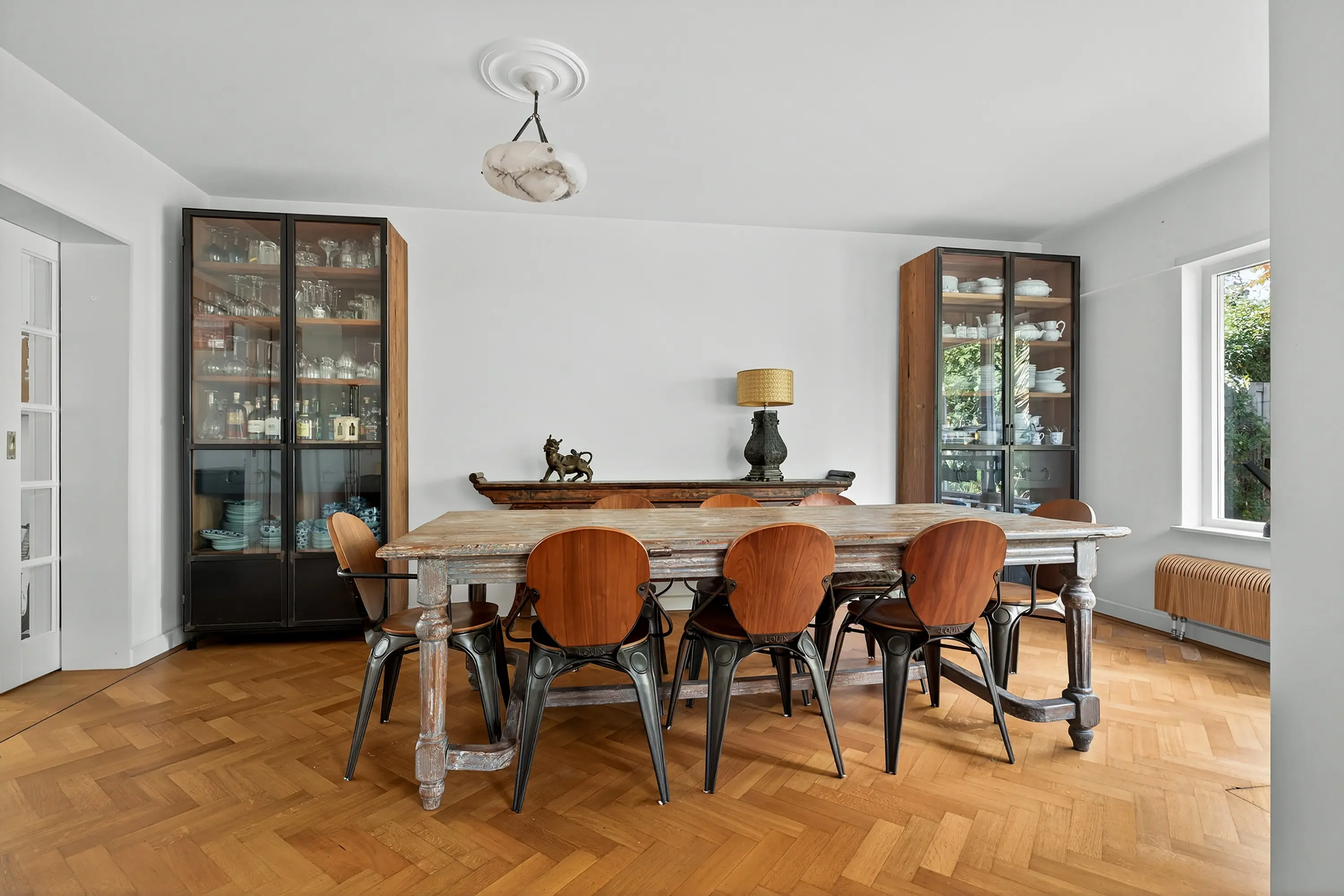De gehele begane grond is afgewerkt met een fraaie visgraat parketvloer met wengébies, wat de ruimte een luxe uitstraling geeft.