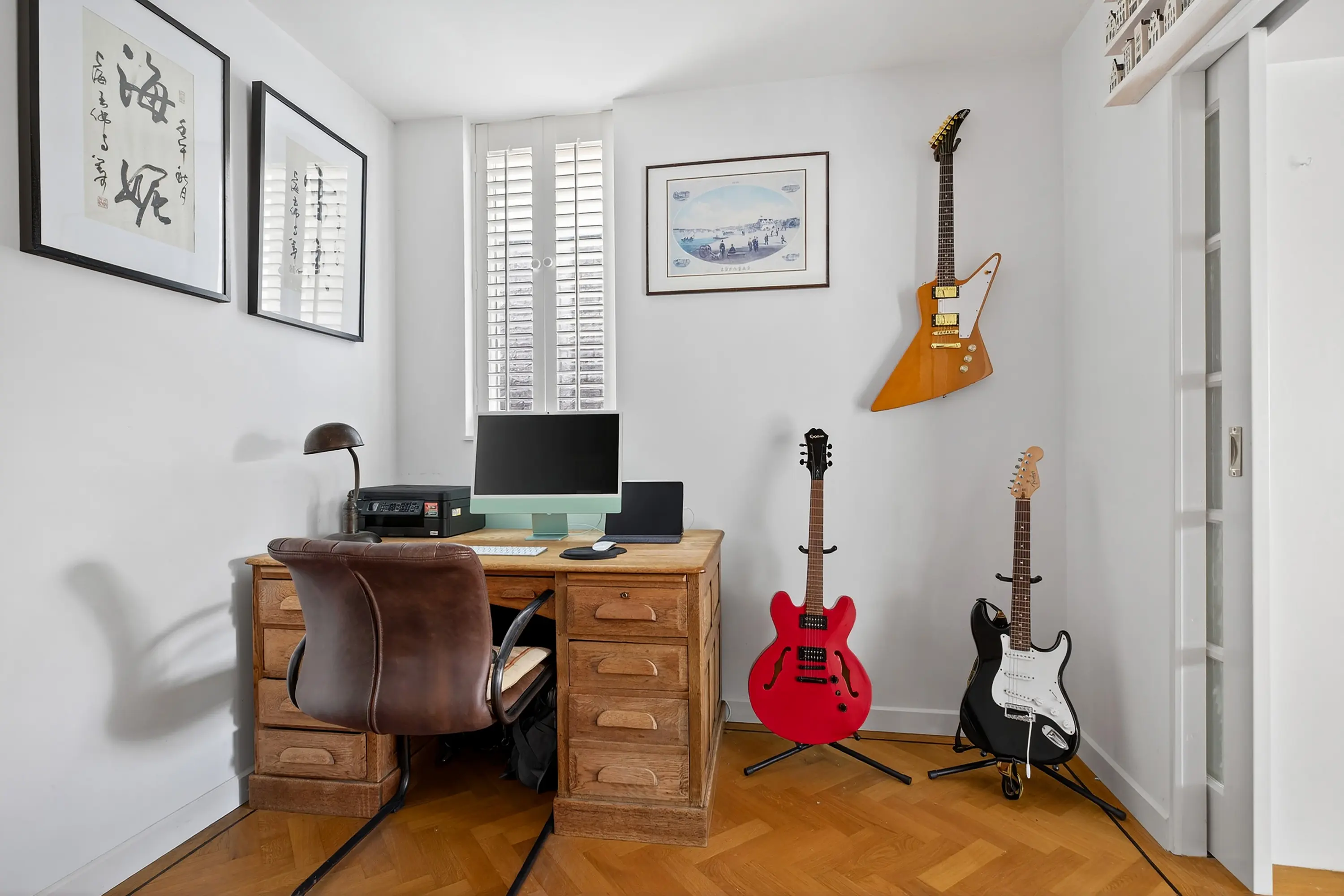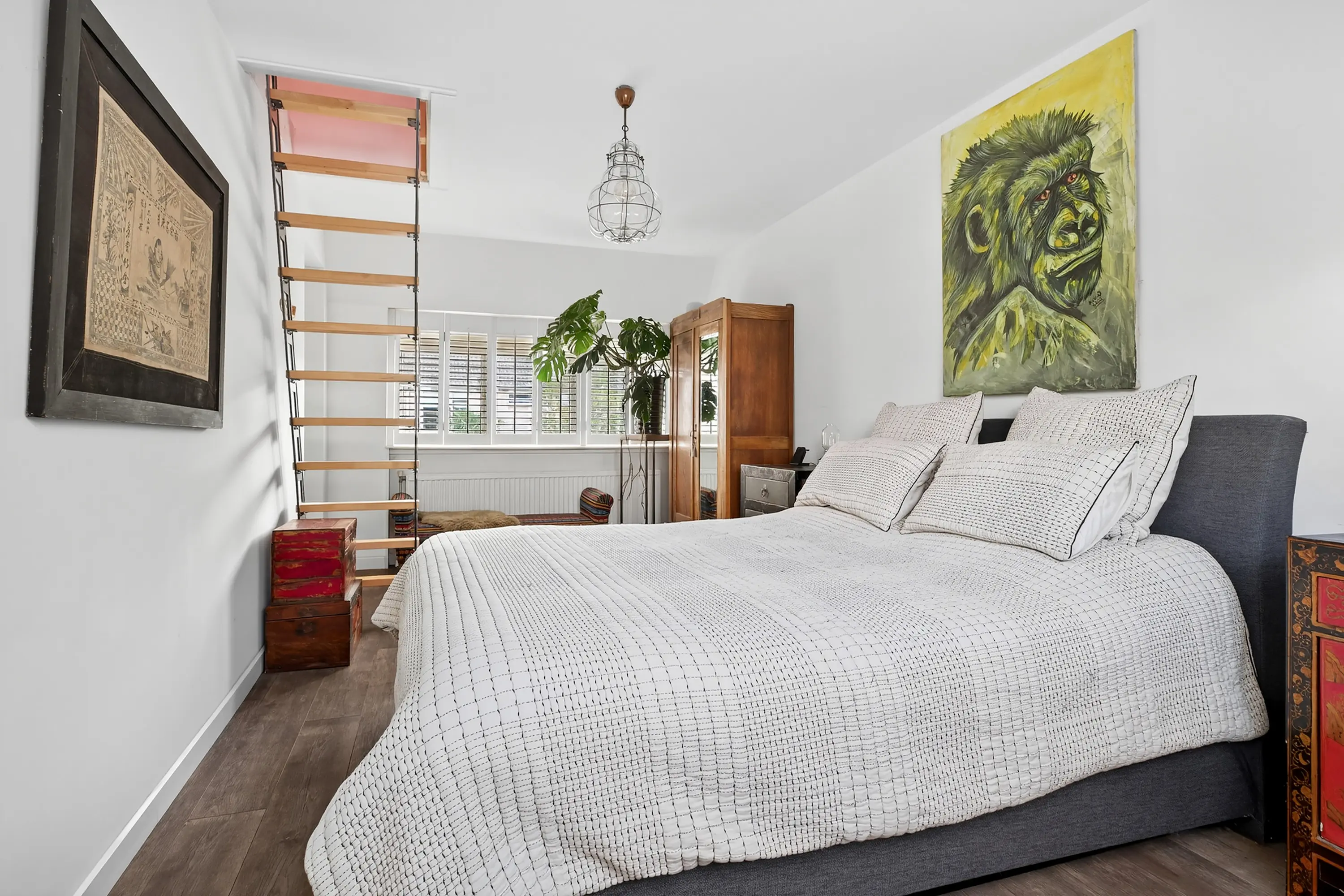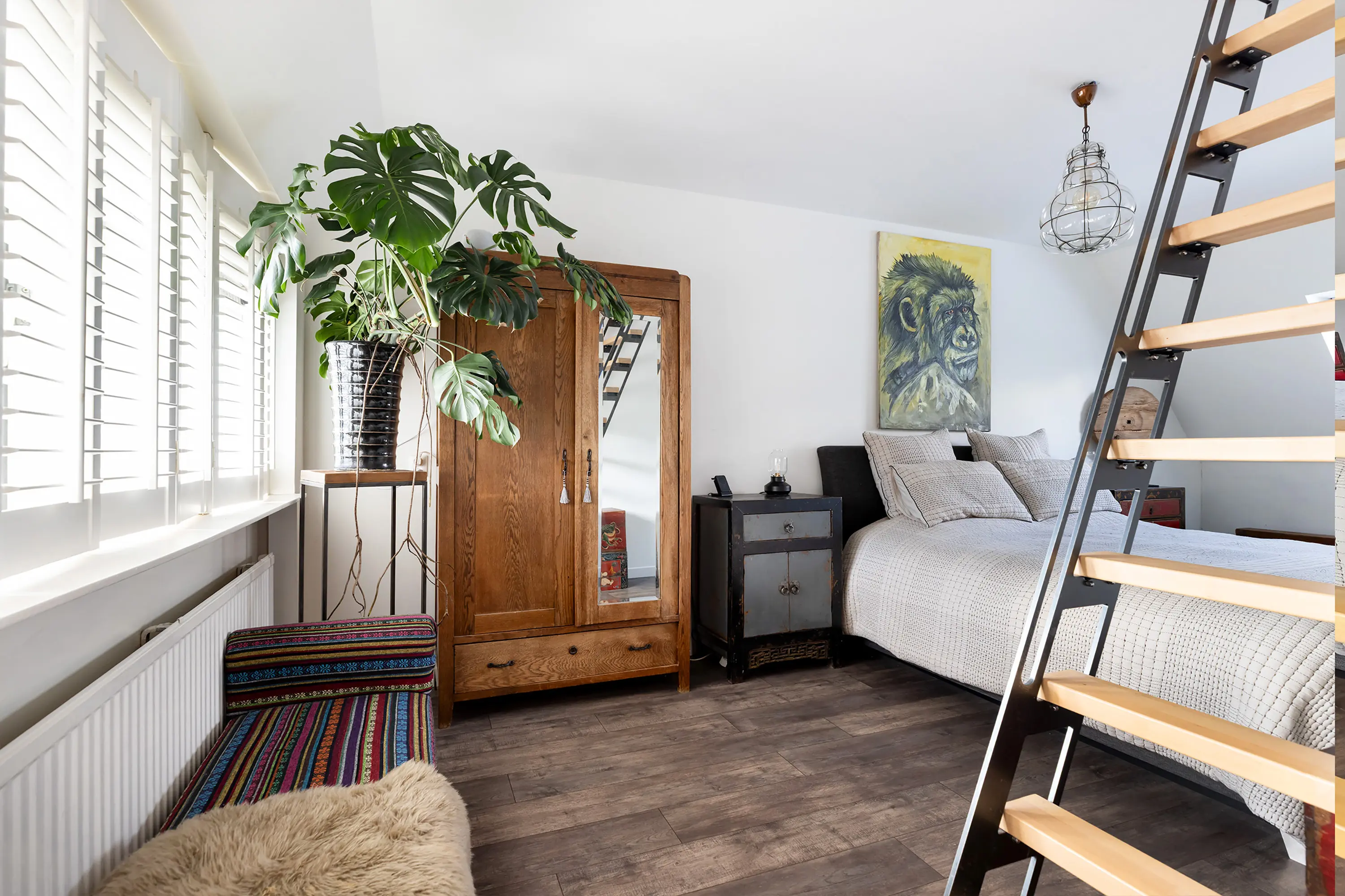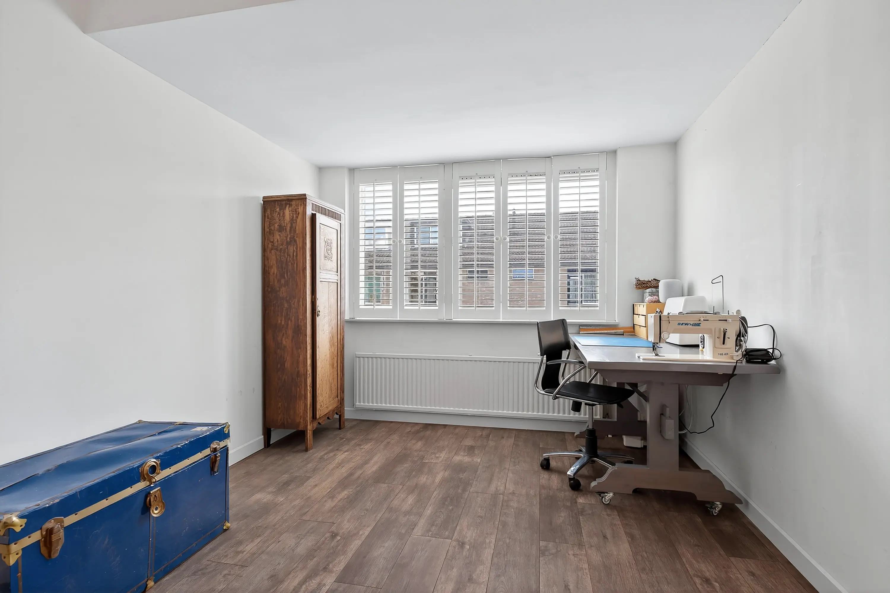 De tweede slaapkamer ligt eveneens aan de achterzijde en beschikt over een Velux dakraam en praktische bergruimte achter de knieschotten. De derde slaapkamer, aan de voorzijde, heeft fraaie shutters voor de ramen en is eveneens strak afgewerkt.
