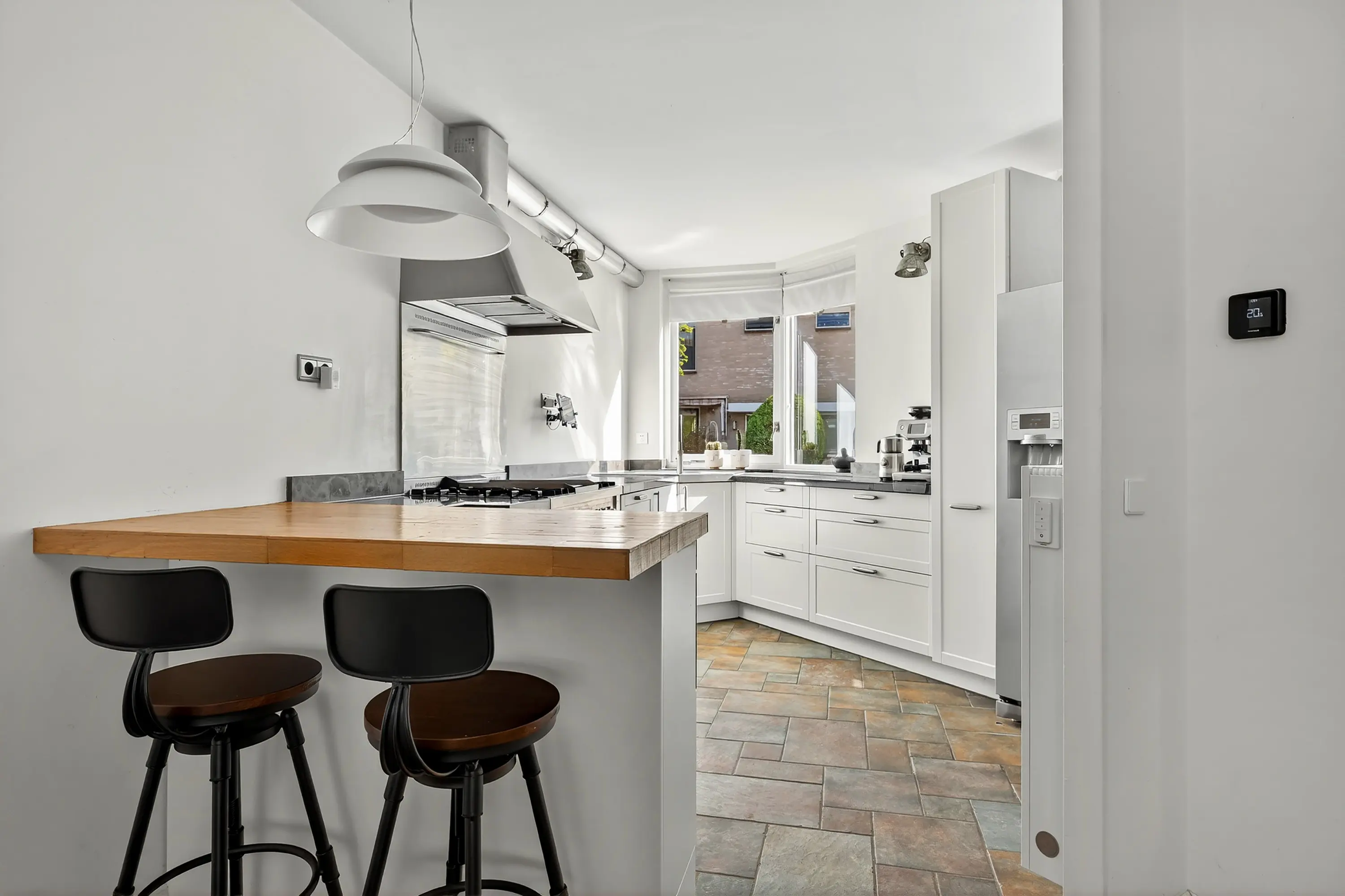 De halfopen keuken aan de voorzijde is opgesteld in een praktische U-vorm en uitgerust met hoogwaardige inbouwapparatuur zoals: een dubbeldeurs koel-/vriescombinatie met ijsblokjesfunctie en gefilterd water, Boretti fornuis met 6 gaspitten en een brede oven, een RVS-afzuigkap, magnetron, vaatwasser en een Quooker