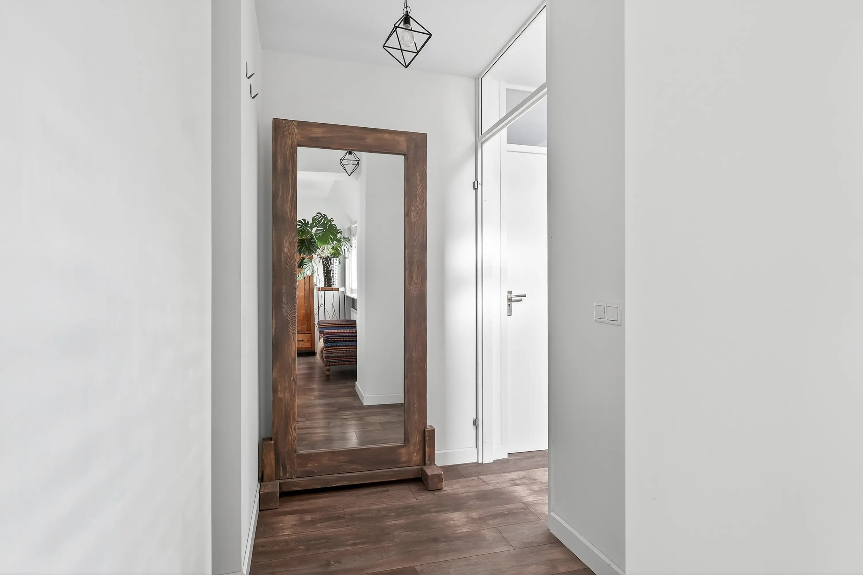 Via de ruime hal met hardhouten trap naar de eerste verdieping komt u direct in een stijlvolle entree. De hal beschikt over een aparte garderoberuimte met grote raampartij aan de voorzijde en een eigen entree, ideaal als berging of zelfs voor een werkplek aan huis.