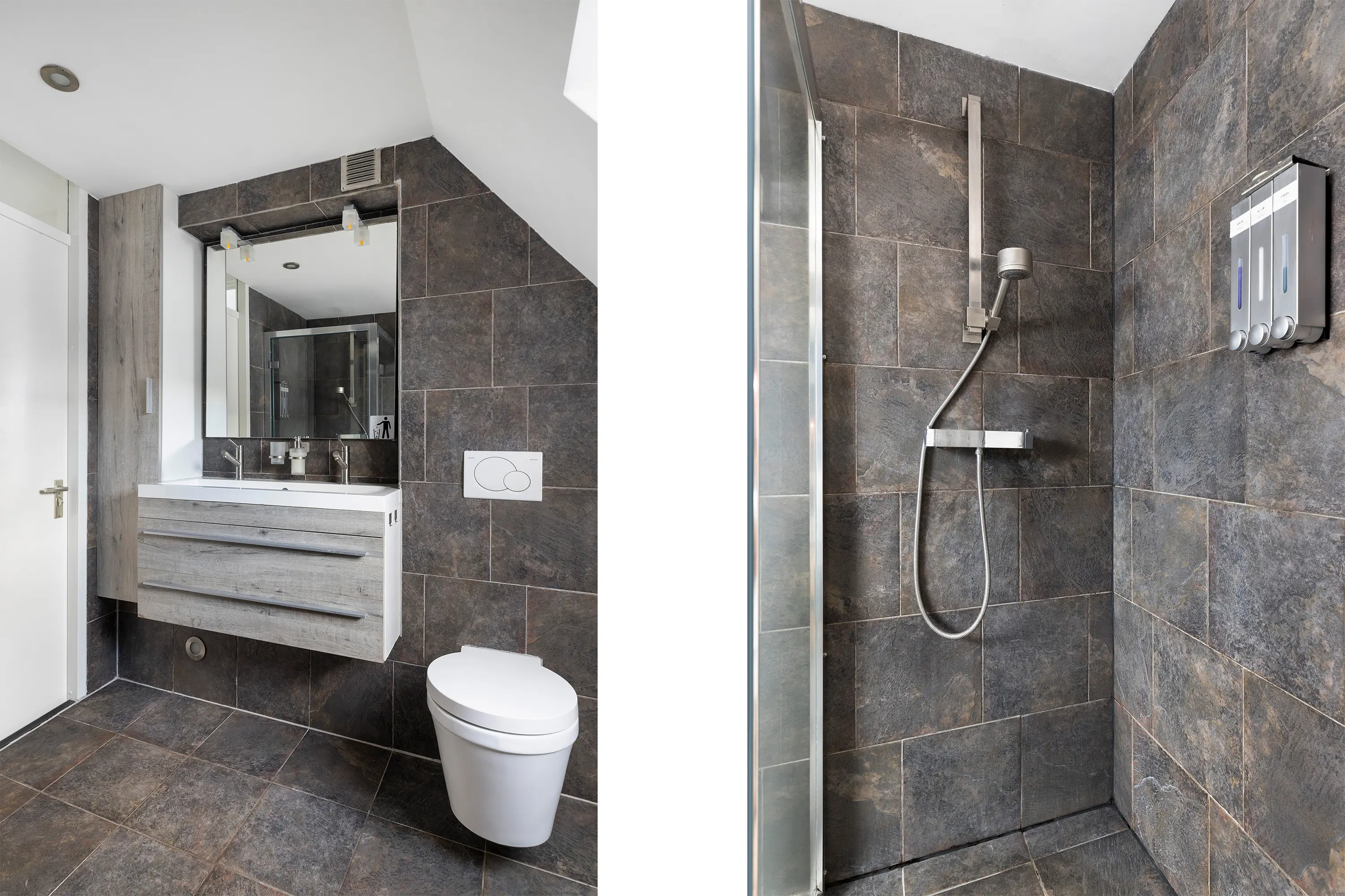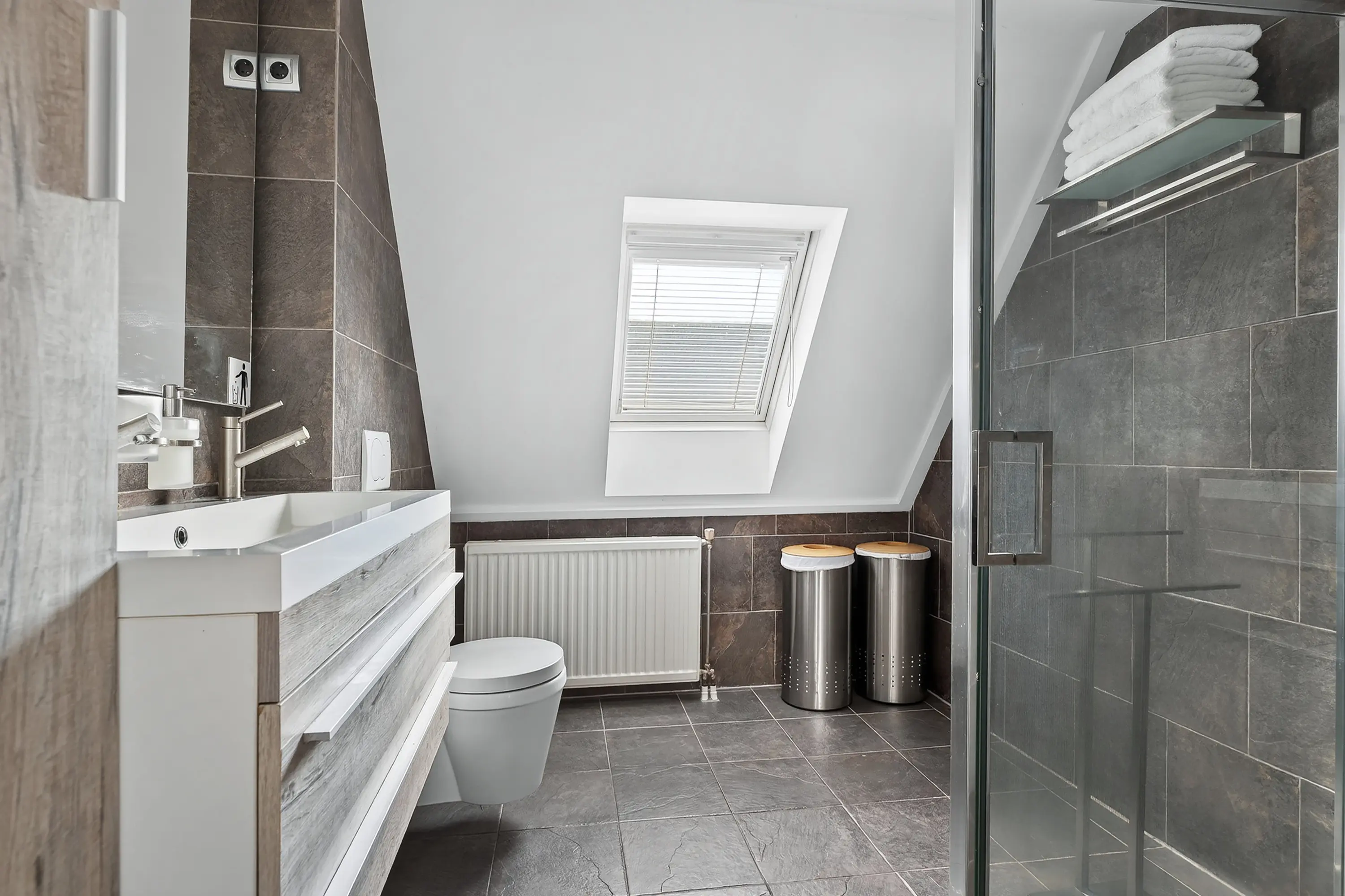 De badkamer is modern en compleet met een ruime inloopdouche met glazen douchewand, een dubbel wastafelmeubel met verlichting, een tweede hangend toilet en een Velux dakraam voor extra daglicht. De grijze betegeling geeft de ruimte een rustige en tijdloze uitstraling.