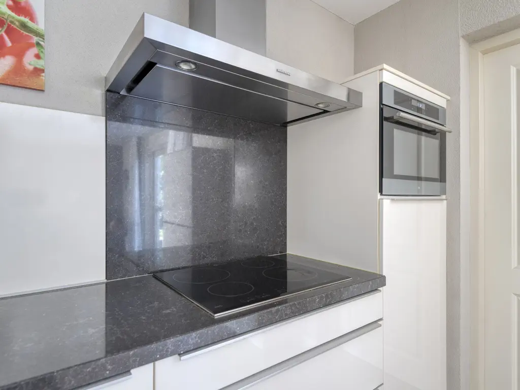 De moderne keuken (2011) is uitgevoerd in een L-opstelling en voorzien van alle benodigde inbouwapparatuur: inductiekookplaat, oven, vaatwasser, afzuigkap en koelkast.
