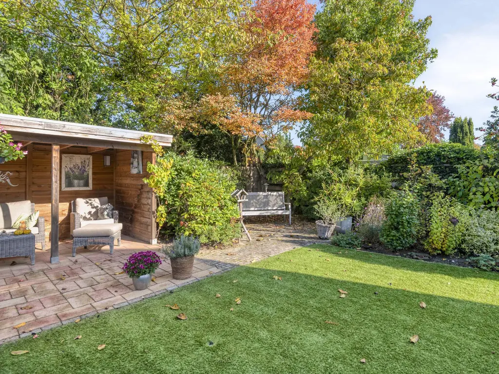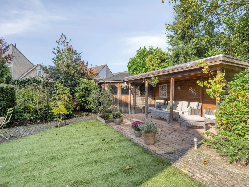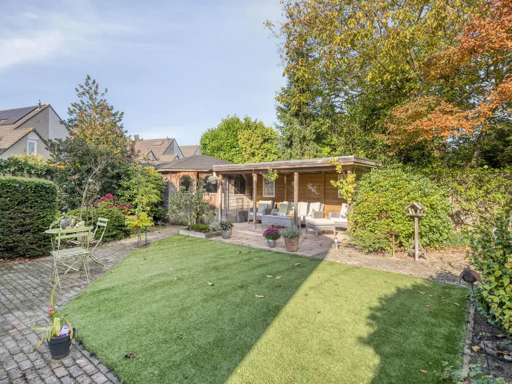 De woning beschikt over een verzorgde voortuin, een oprit met ruimte voor meerdere auto’s aan beide zijden van de woning, en een fraai aangelegde achtertuin met: