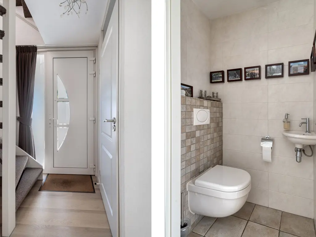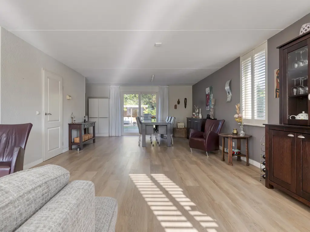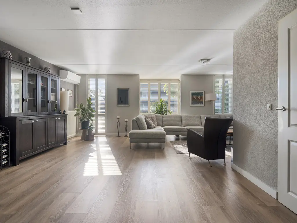 De entree biedt toegang tot de hal met toilet en meterkast. De ruime, lichte woonkamer heeft grote raampartijen, een fraaie vloer en biedt volop leefruimte voor een gezellige zithoek en een grote eettafel.