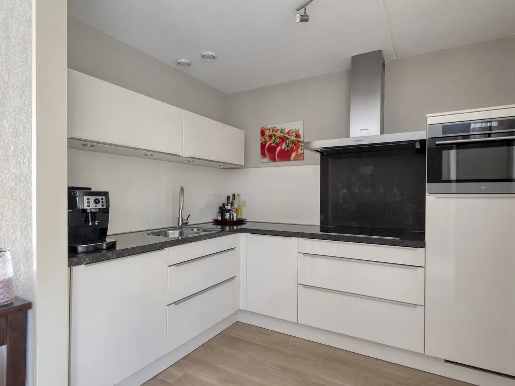 De moderne keuken (2011) is uitgevoerd in een L-opstelling en voorzien van alle benodigde inbouwapparatuur: inductiekookplaat, oven, vaatwasser, afzuigkap en koelkast.