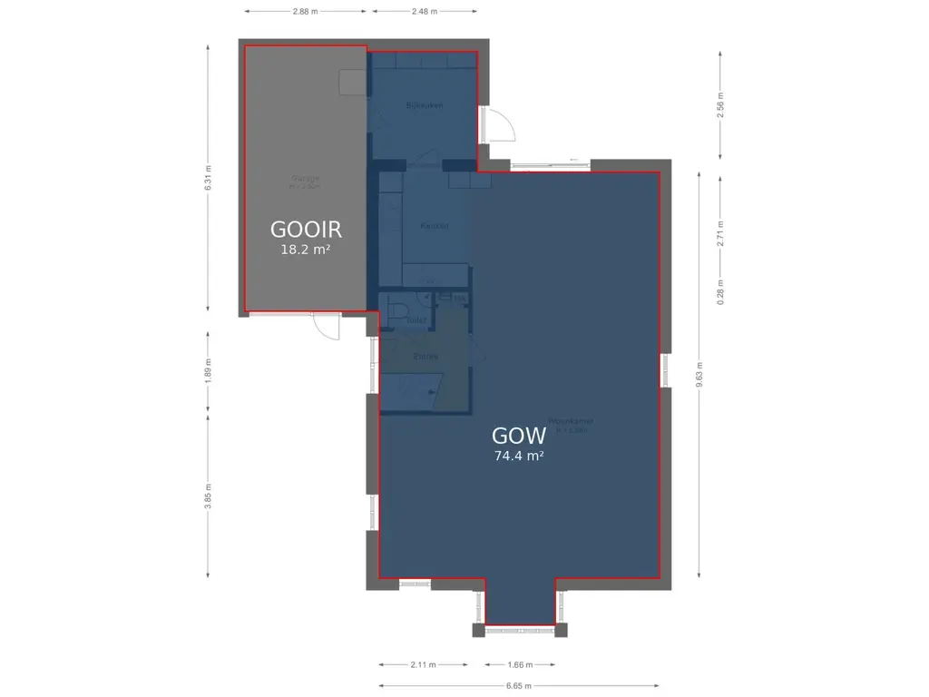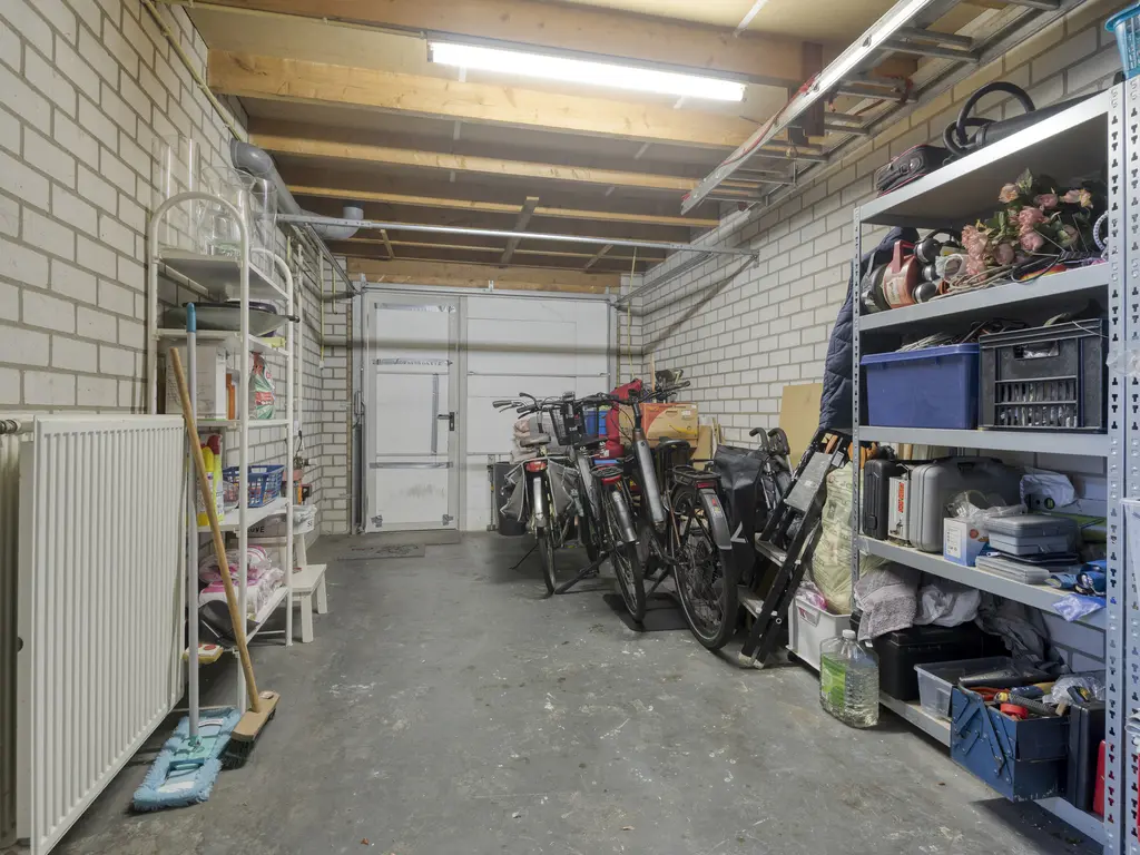 De garage (18 m²) is verwarmd, voorzien van vloerverwarming (warm water) en via de bijkeuken een doorgang naar de tuin — ideaal als werkplaats, hobbyruimte of thuiskantoor.