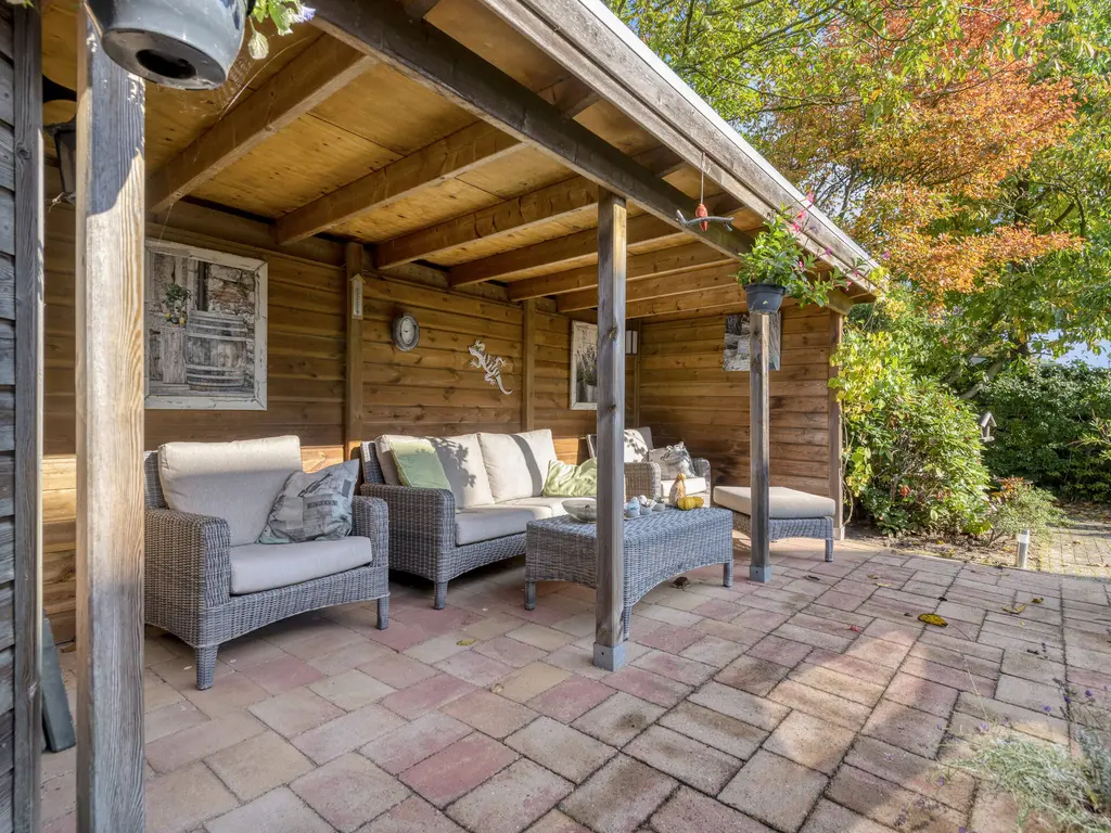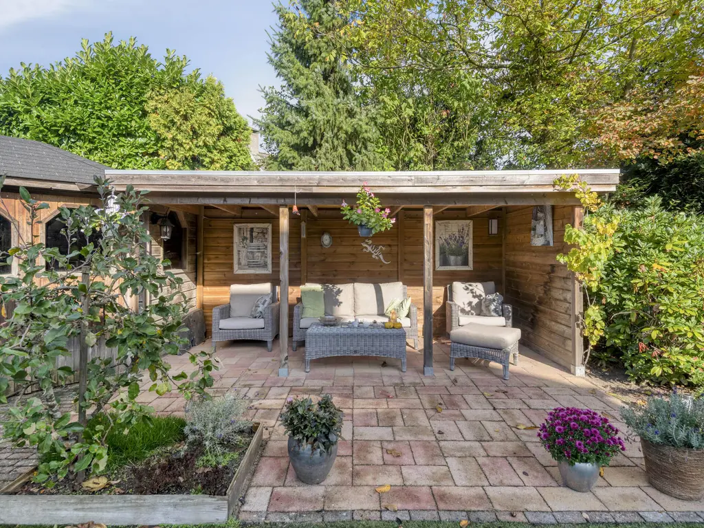 De woning beschikt over een verzorgde voortuin, een oprit met ruimte voor meerdere auto’s aan beide zijden van de woning, en een fraai aangelegde achtertuin met:
