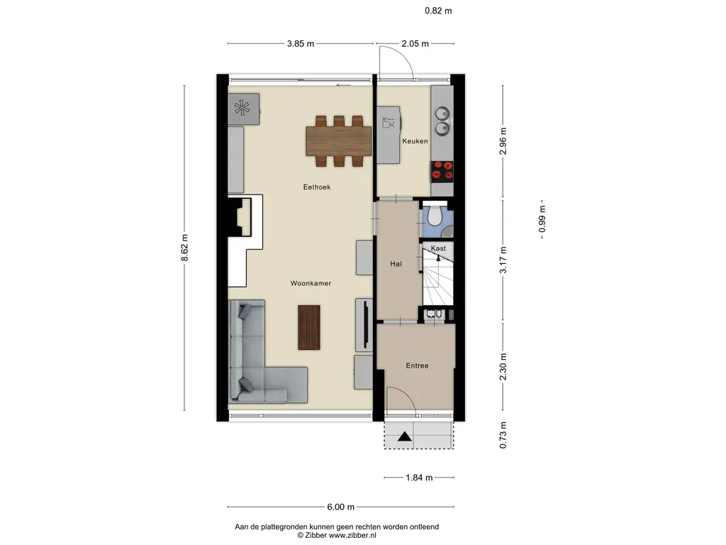 Through the front garden you enter the hallway with wardrobe area, staircase and toilet. The spacious living room is bright and inviting, oeering room for a comfortable seating area and a large dining table. At the rear is the kitchen, practically laid out with ample workspace and storage. The living room provides a lovely view of the spacious back garden.