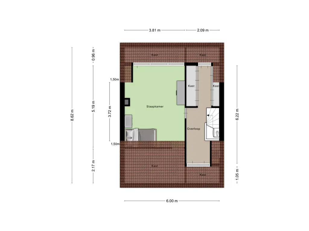 Een vaste trap leidt naar de royale zolderverdieping, met een ruime vierde slaapkamer die dankzij de dakkapel en dakramen veel licht ontvangt. Hier is ook veel bergruimte aanwezig achter de knieschotten.
